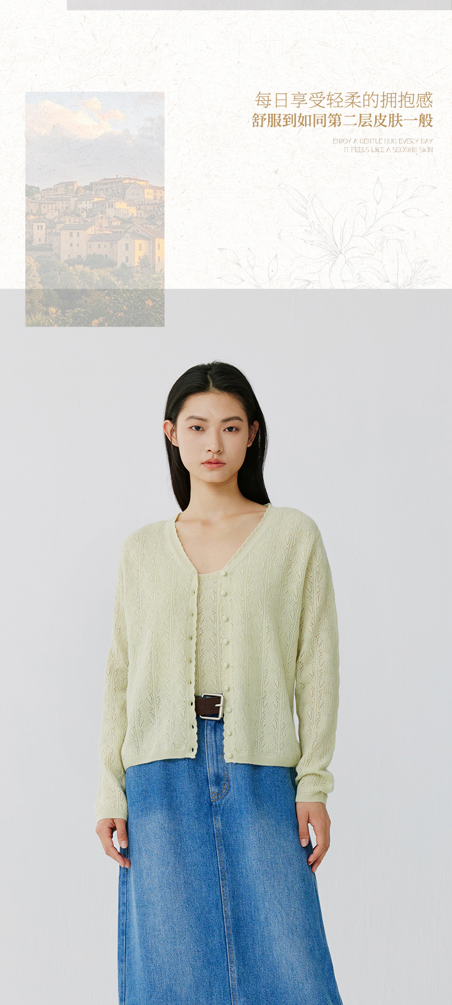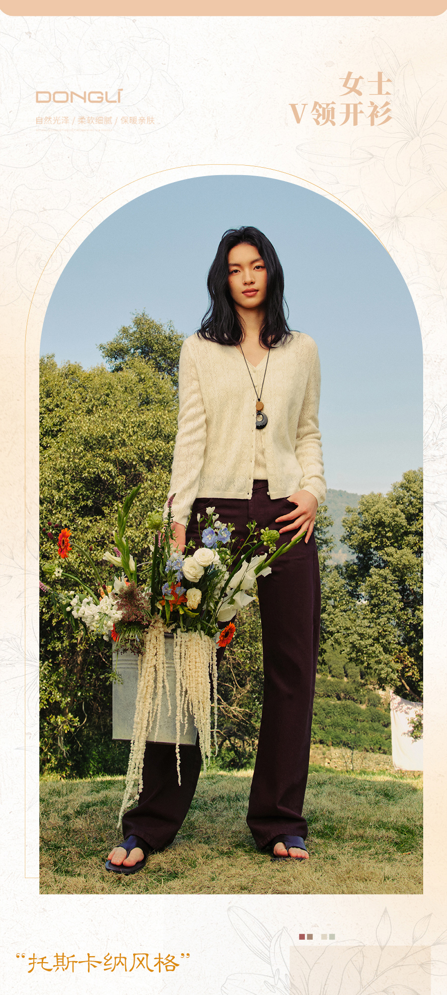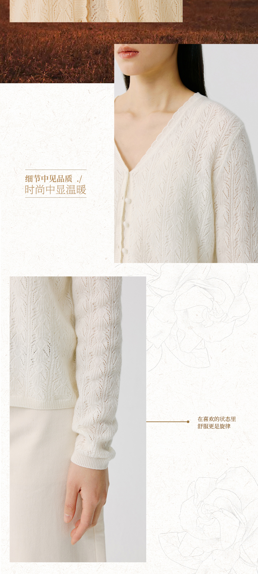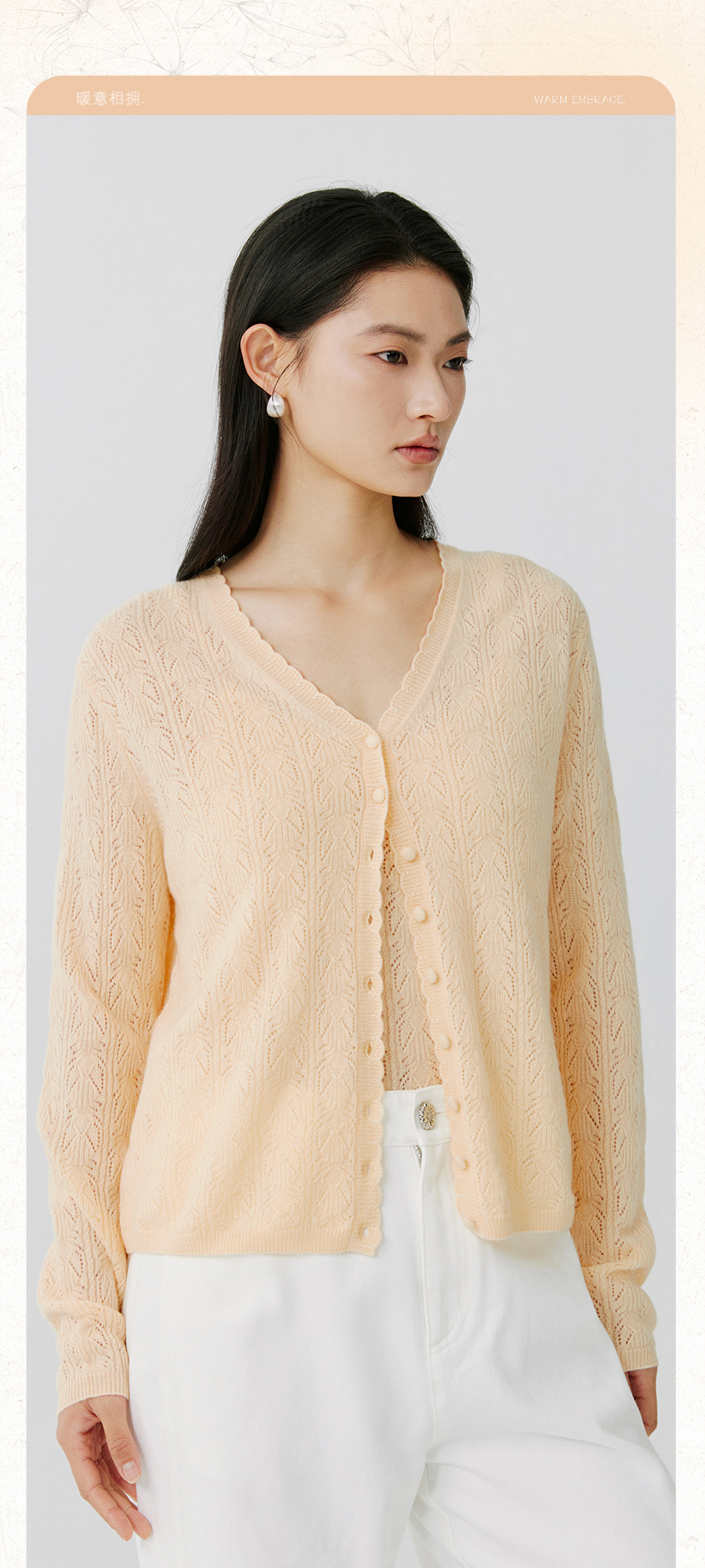 东黎 • 托斯卡纳系列—浮浮花开 山羊绒春季女士V领挑孔开衫 5145