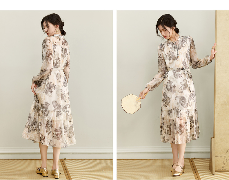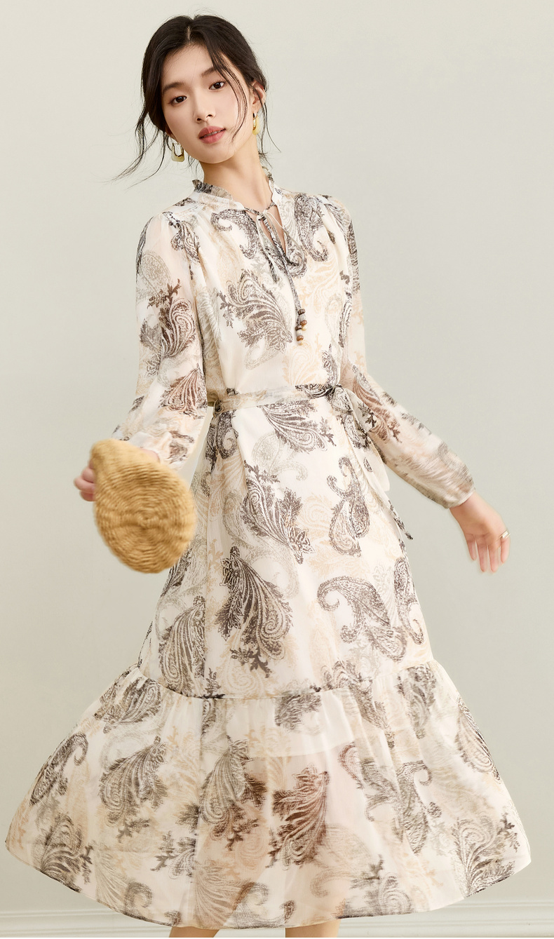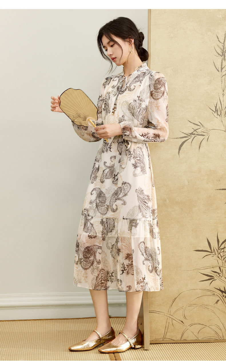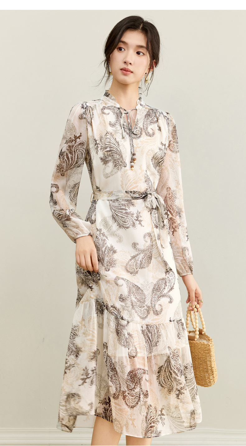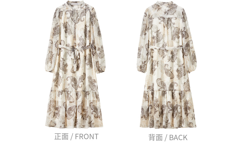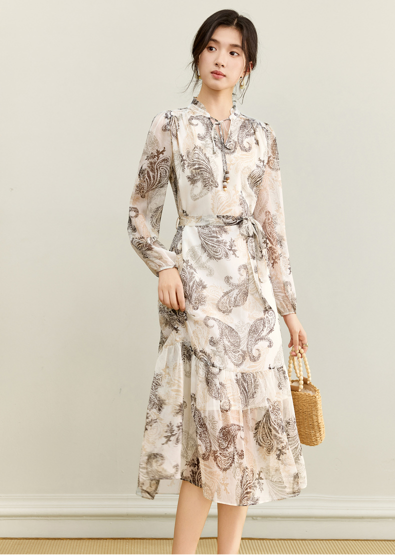 【内购】【腰果花】优雅民族风木耳边立领可拆卸腰带A字印花雪纺连衣裙-Q53LI3747