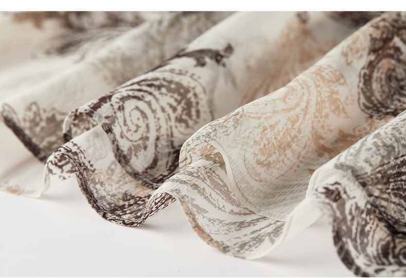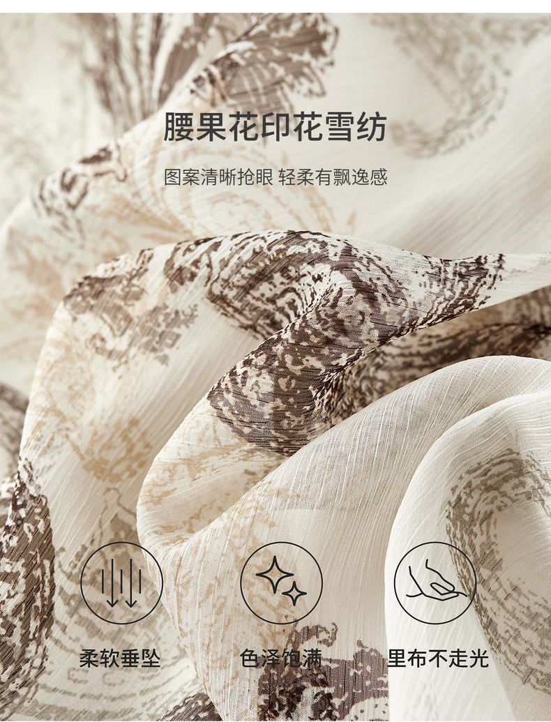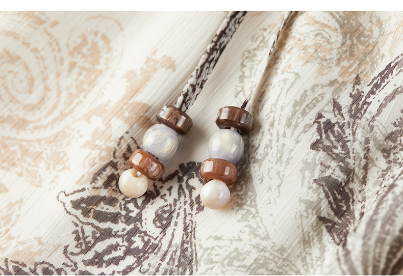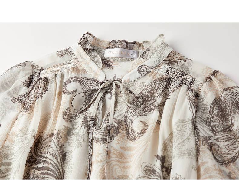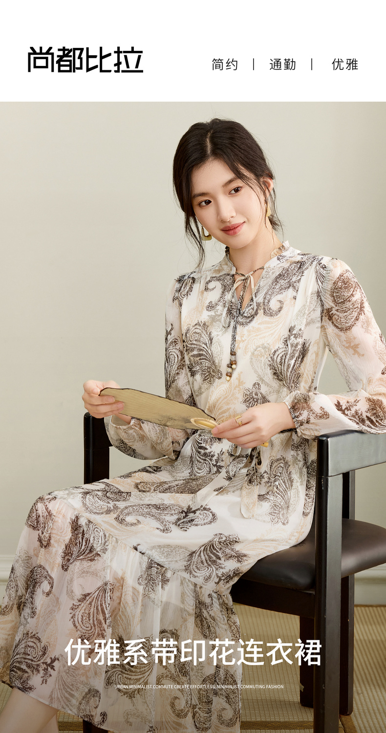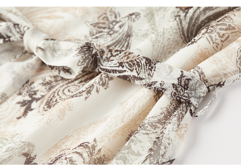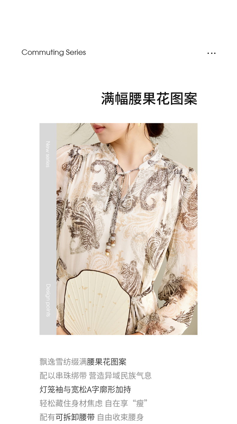 【内购】【腰果花】优雅民族风木耳边立领可拆卸腰带A字印花雪纺连衣裙-Q53LI3747