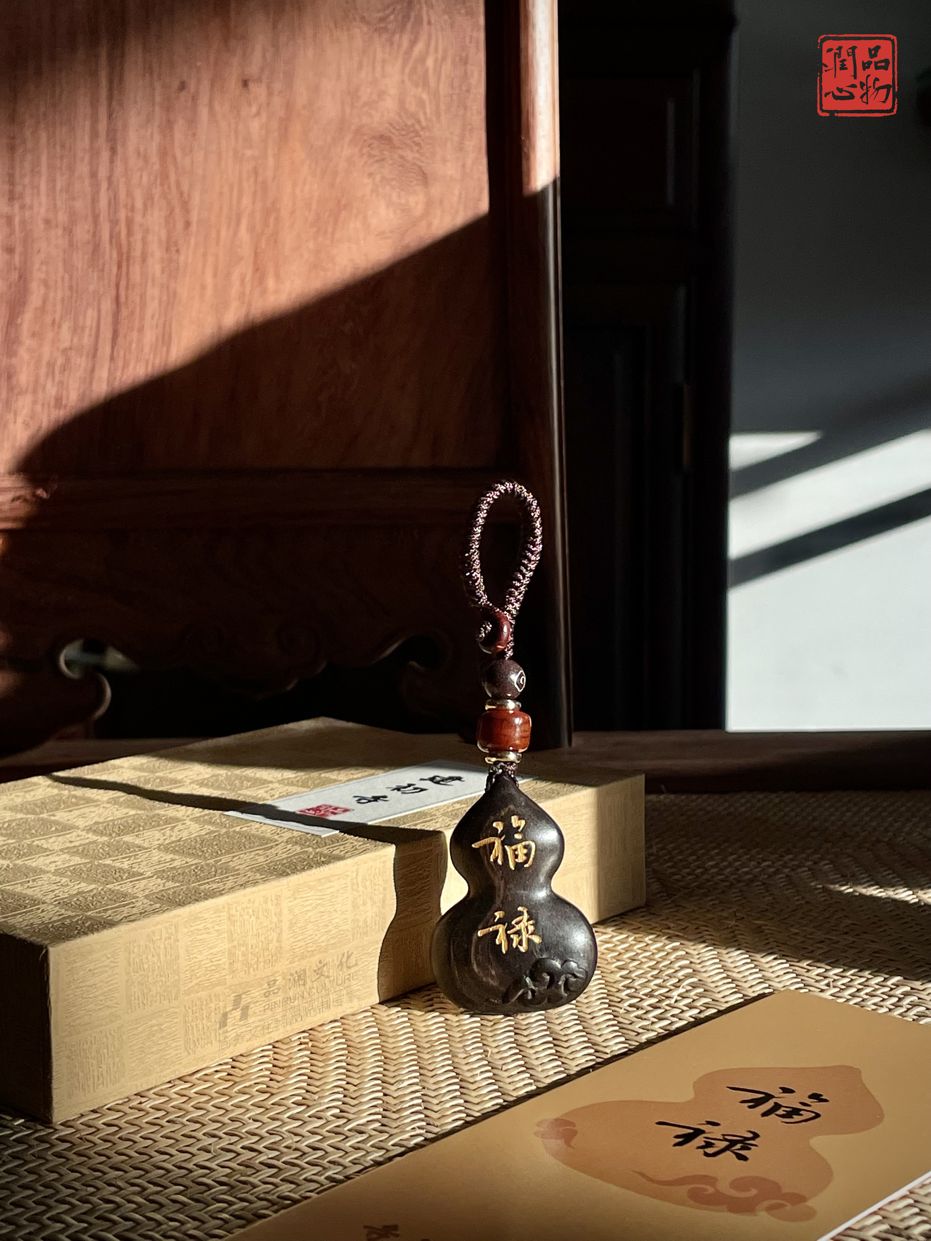 我们请建初寺的大初法师书写墨宝吉祥福语——福禄,采用紫光檀老料,用刻印、手工打磨、手工描金的方式制作。紫光檀,“帝王之木”,学名东非黑黄檀,又称犀牛角紫檀。葫芦与“福禄”谐音,所以常被视为吉祥的象征,代表着福气、禄运。祝您福禄双臻:禄星高照、福气满满!