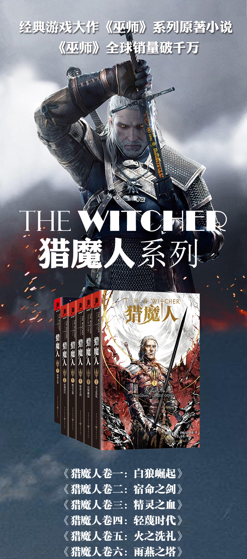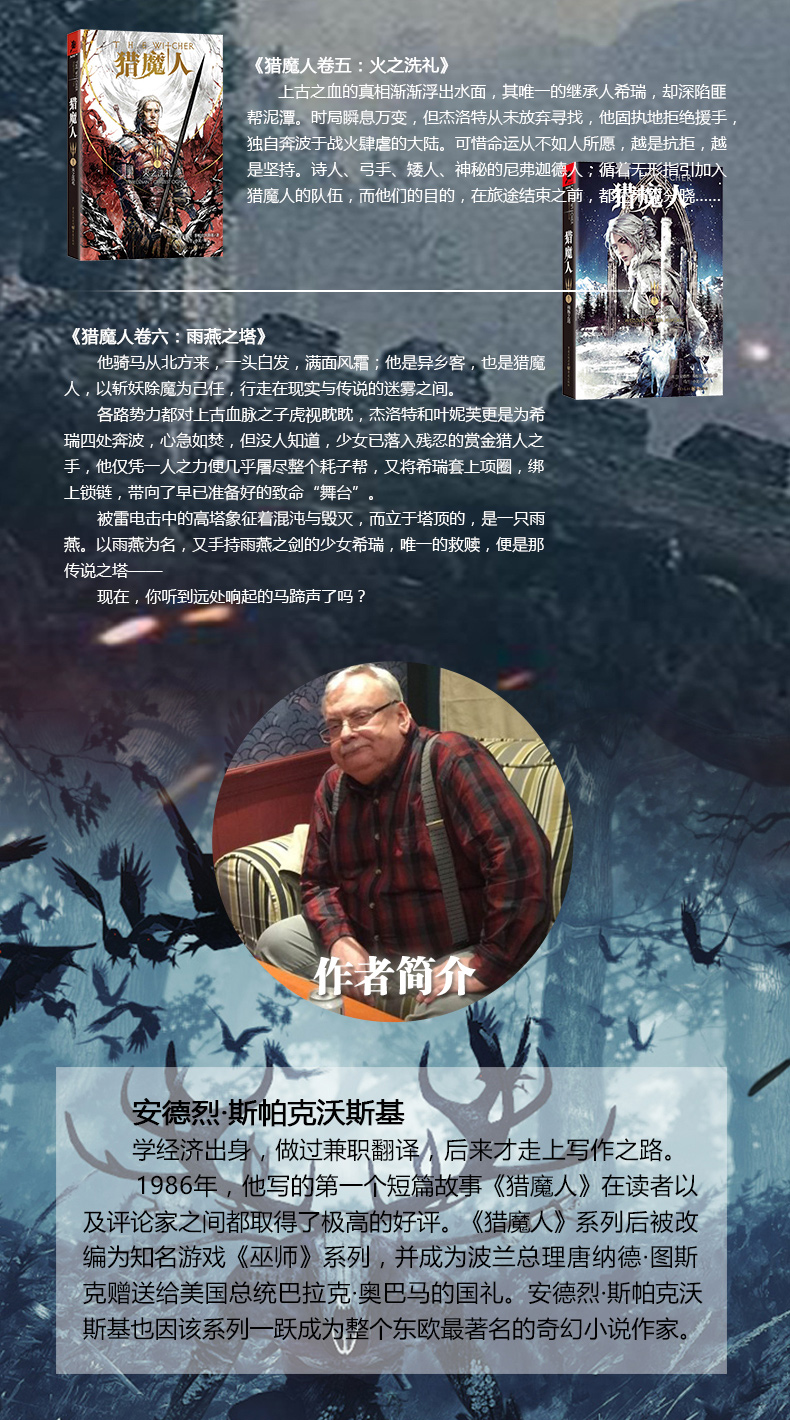 安德烈·斯帕克沃斯基著的《猎魔人(卷3,精灵之血)》讲述了他骑马从北方来,一头白发,满面风霜;他是异乡客,也是猎魔人,以斩妖除魔为己任,行走在现实与传说的迷雾之间。