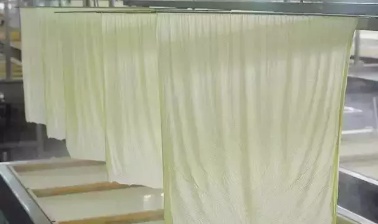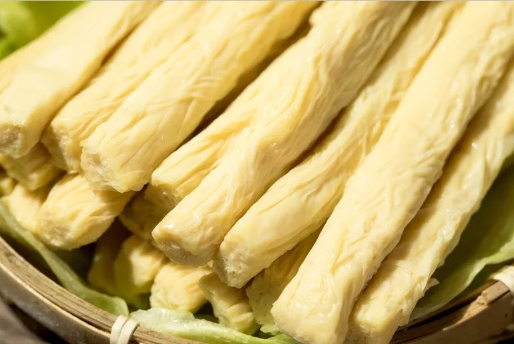 鲜食腐竹从大豆到腐竹,需经过十六道生产工序:精选—清洗—浸泡—磨浆—虑浆—煮浆—成型—挑皮—分切—预冷—加工—杀菌—包装—检测—速冻—入库。