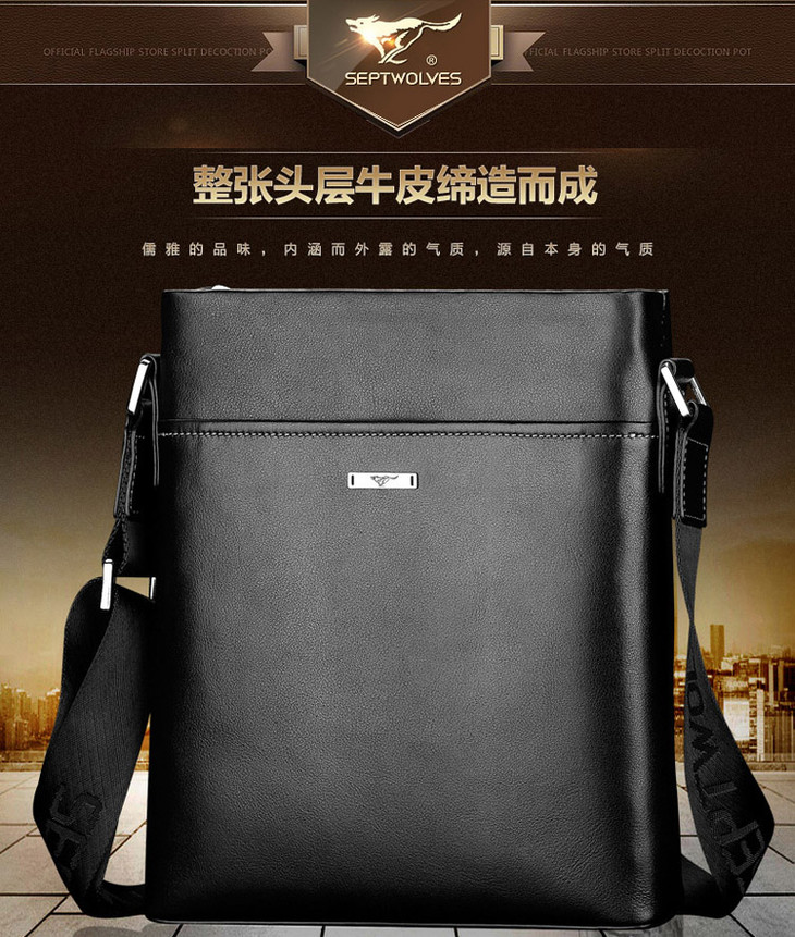 七匹狼男包单肩包男士斜挎包竖款韩版背包休闲小牛皮商务包 英伦风时尚包纯皮背包 黑色 小号1A3464051-01