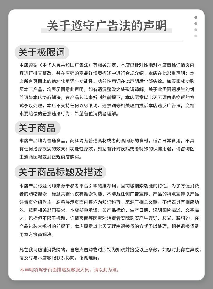 1、店铺商品按物流声明、规格说明安排发货。下单前请仔细阅读商品详情,食品类商品一经售出非质量问题恕不退换。
