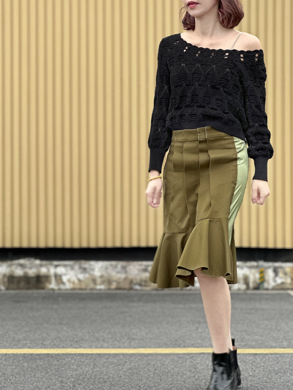 TYNVIE 木耳边装饰镂空长袖上衣-黑白波点