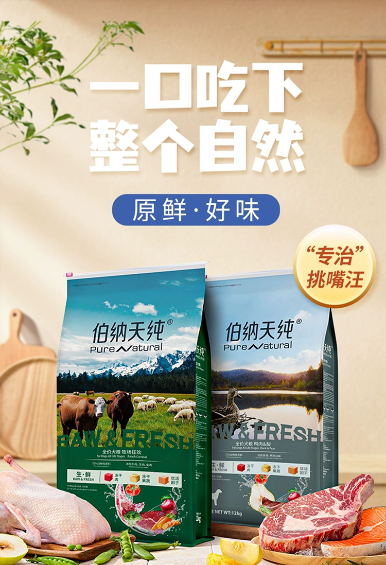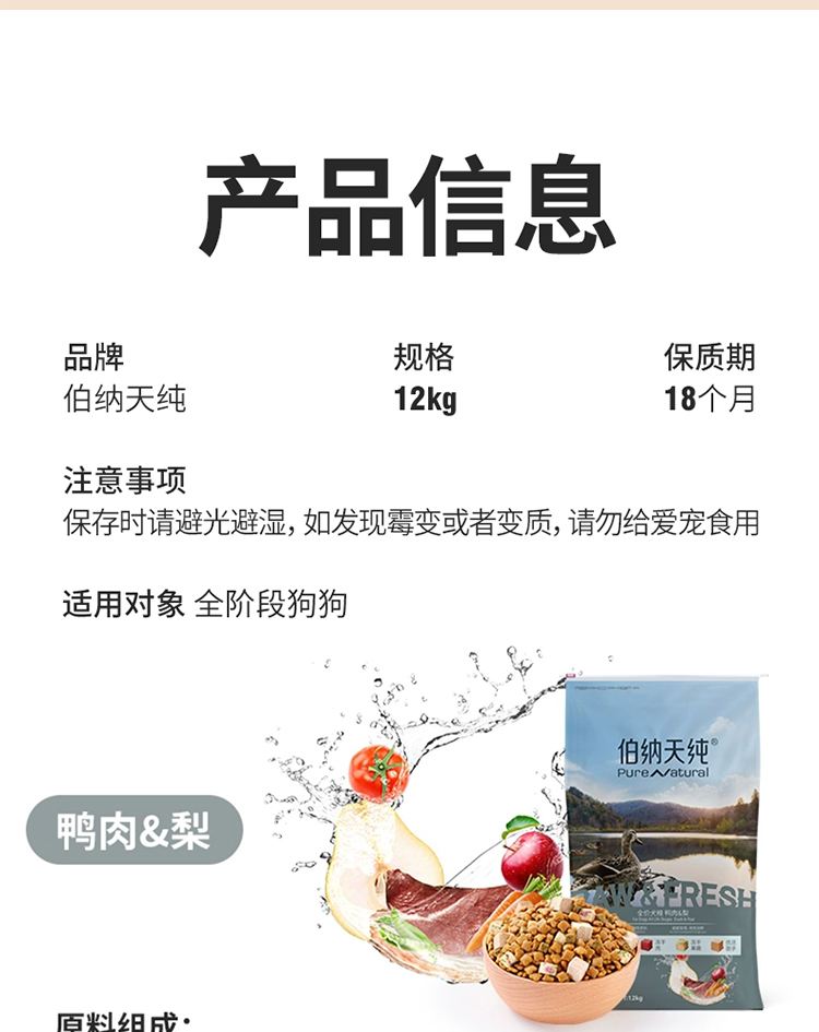 生鲜鸭肉梨伯纳天纯全价全期犬粮12KG无谷低敏易消化冻干粮金毛