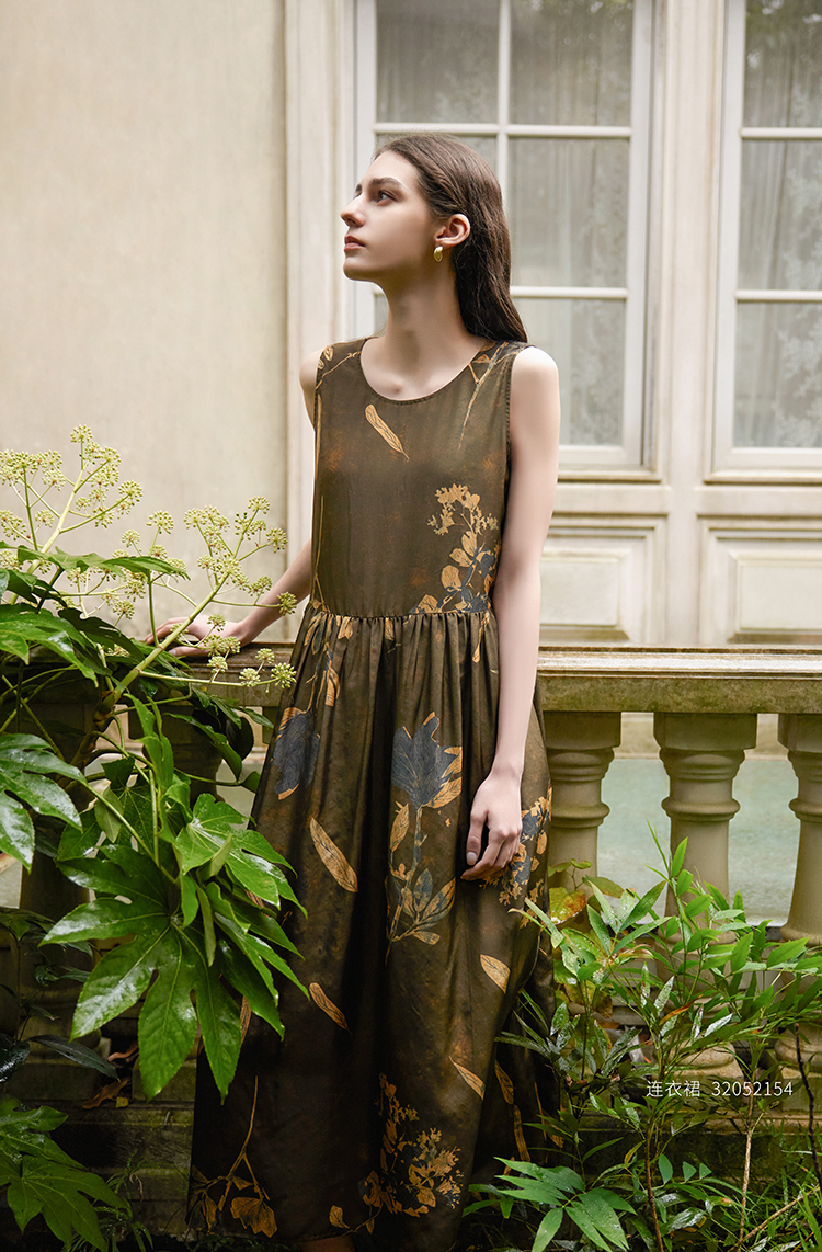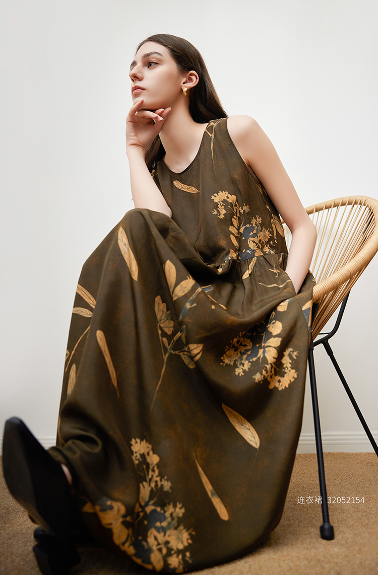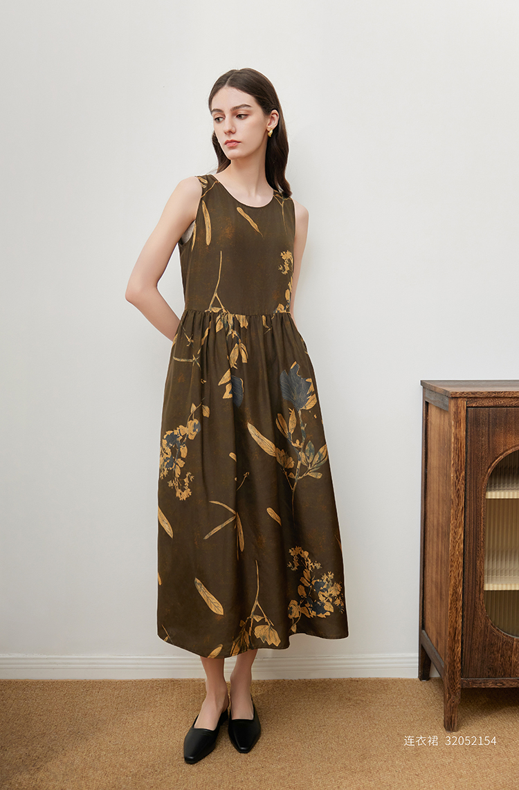 【无袖拼接真丝连衣裙】25年夏季新品100%桑蚕丝印花圆领无袖中长款裙子