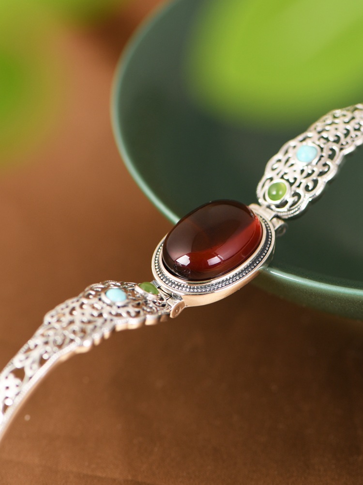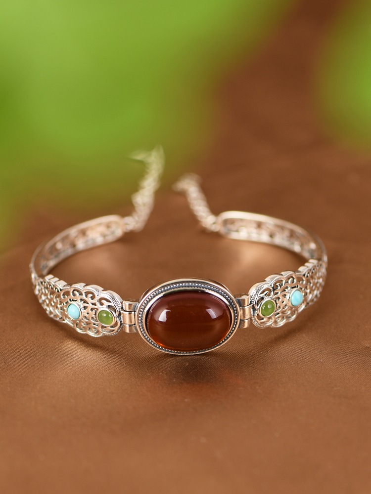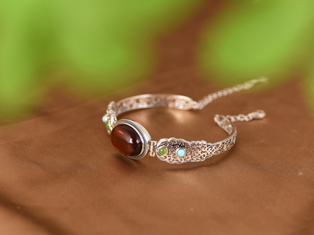 【洪福连连】S925银镂空藤蔓镶碧玉蛋形血珀手镯 【SCH-TRS51006】