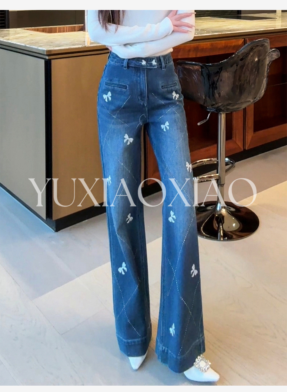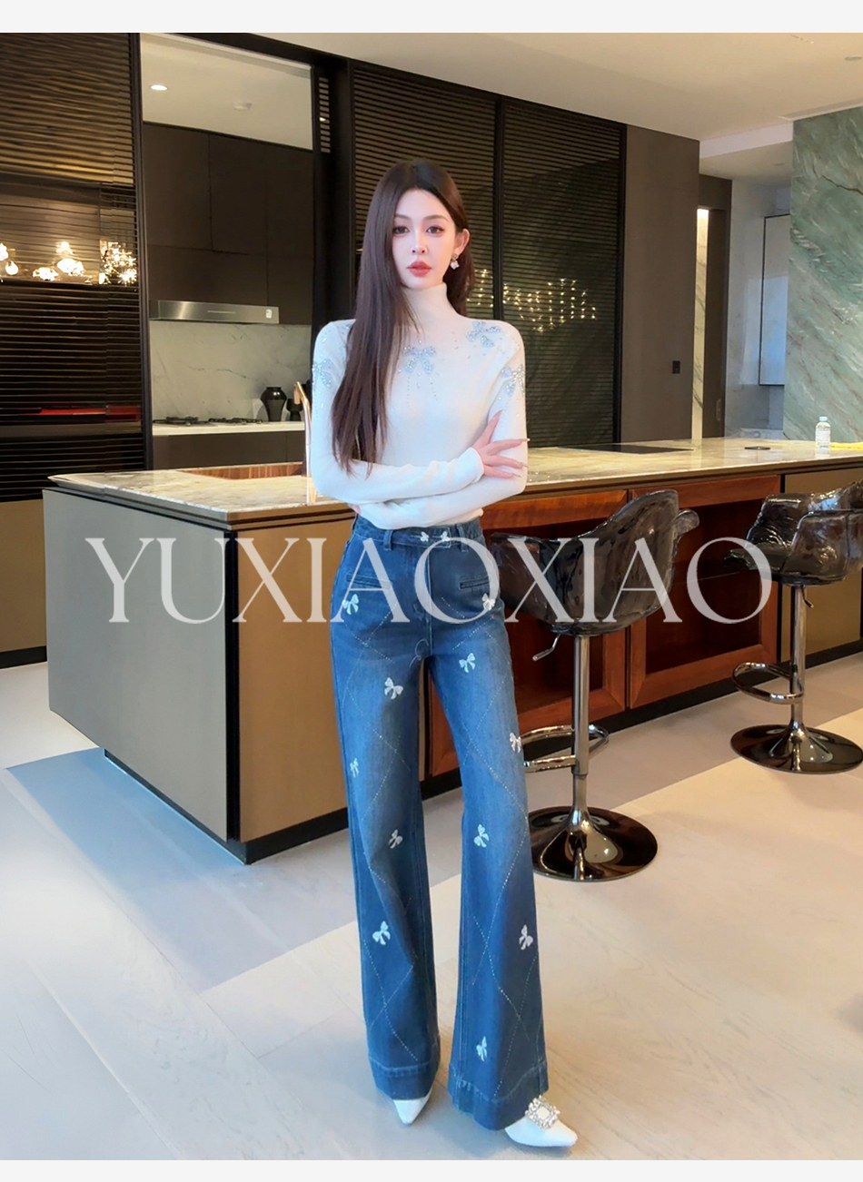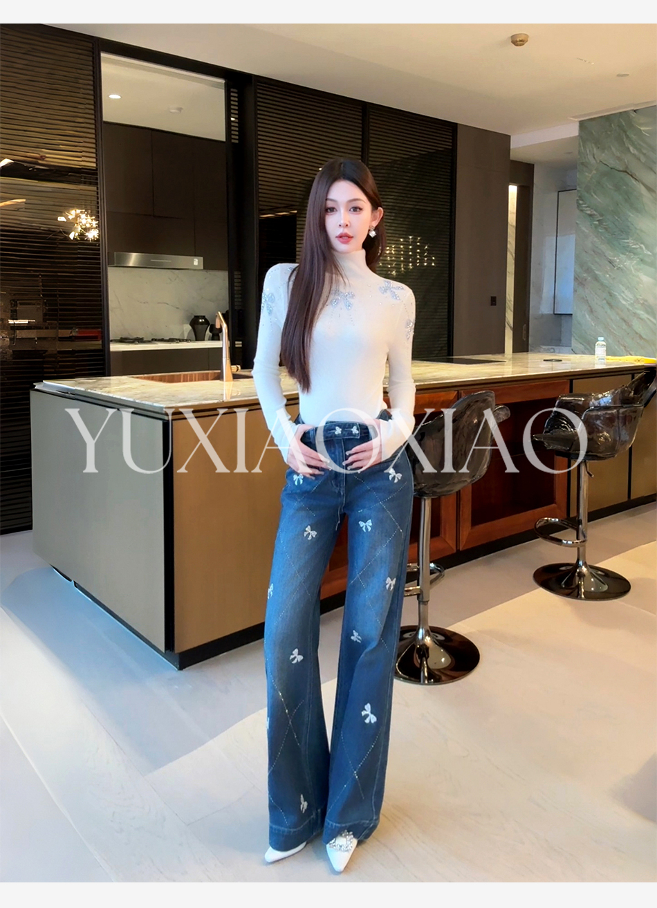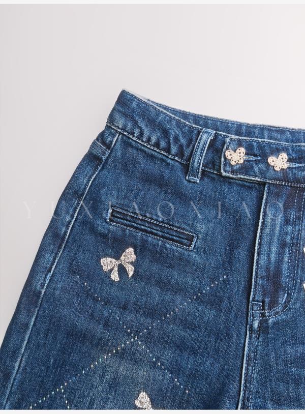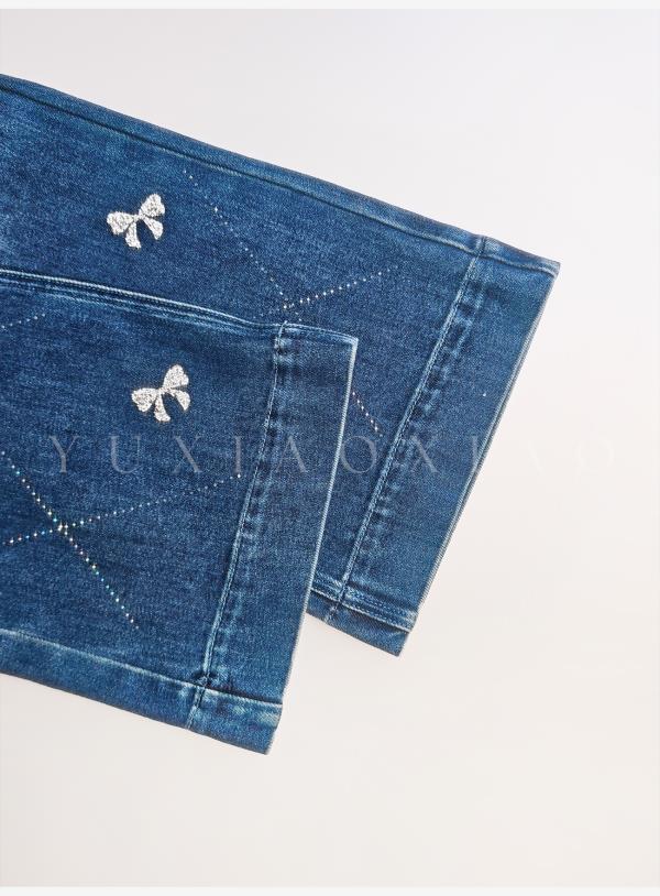 余潇潇【普鲁士甜心】层次感时髦重工精致蝴蝶结烫钻棉感直筒牛仔裤
