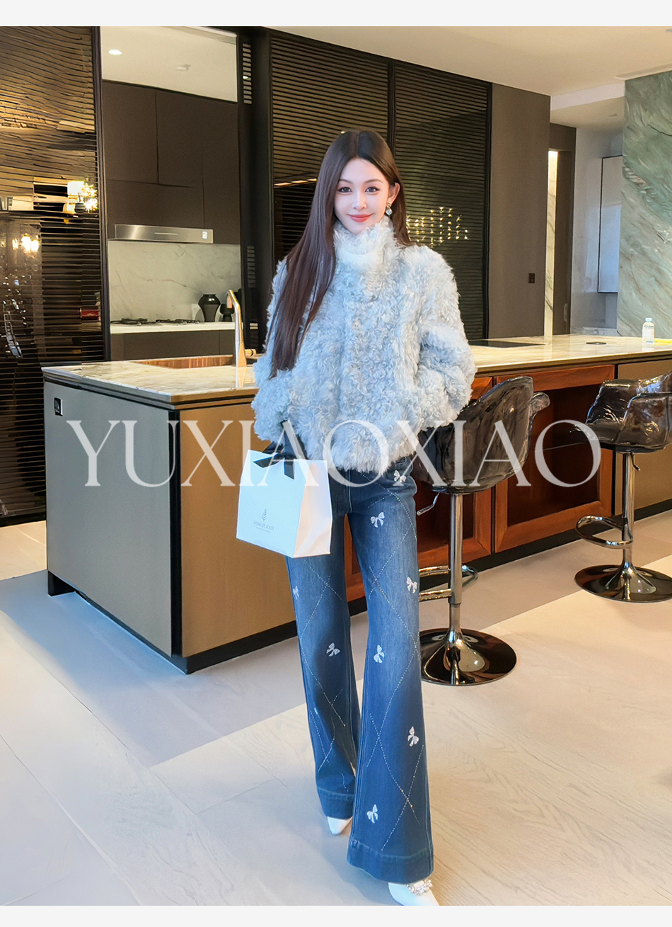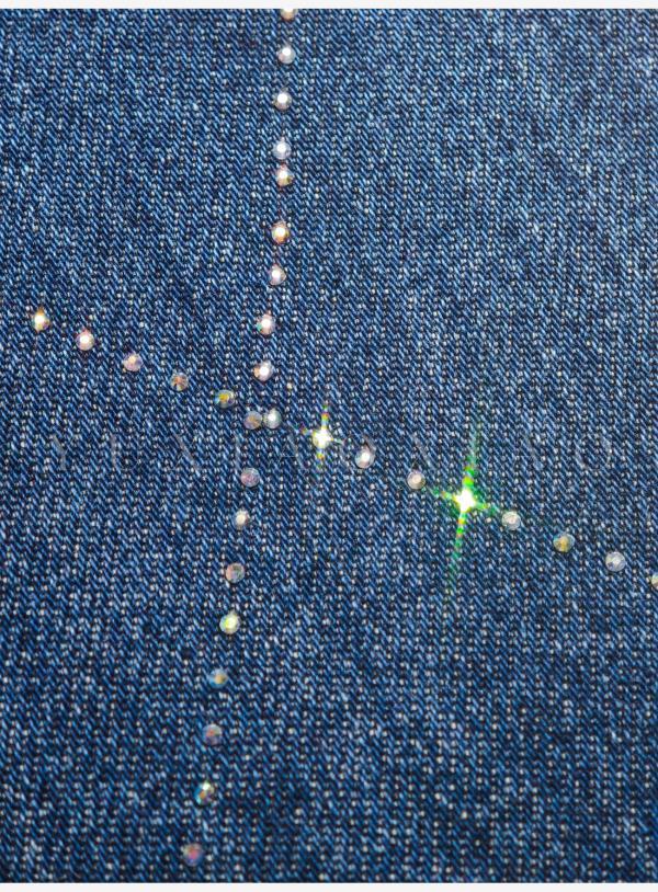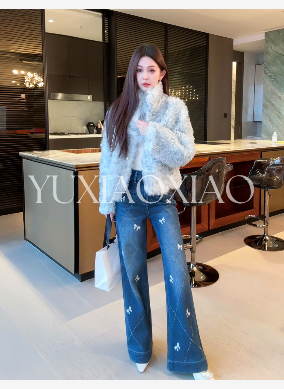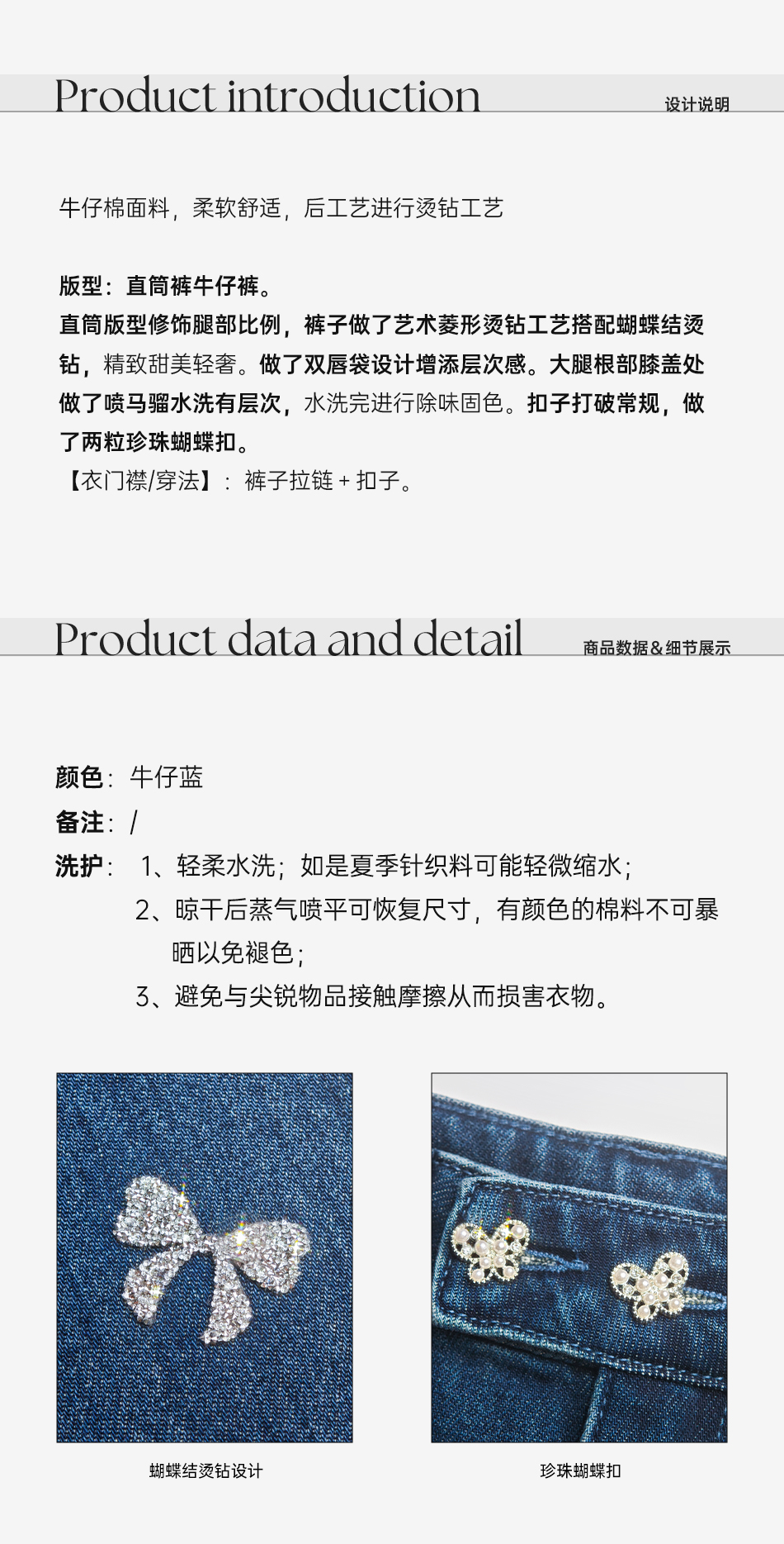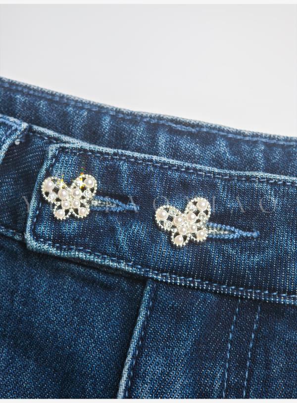 余潇潇【普鲁士甜心】层次感时髦重工精致蝴蝶结烫钻棉感直筒牛仔裤