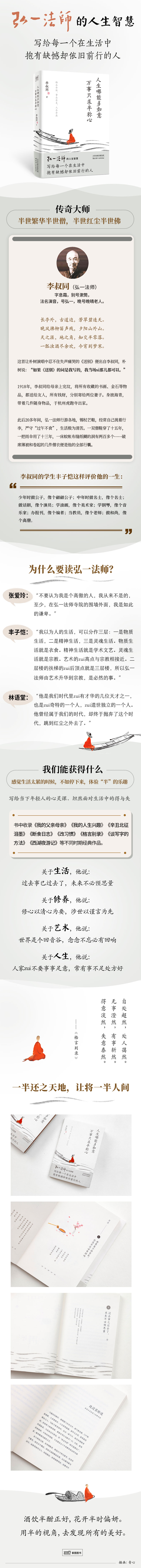 每个人的烦恼和痛苦、成功和快乐,其实都是类似的, 但有的人活得丰富,有的人活得通透,有的人却活得苦恼, 那主要是因为看待事情的态度不同—— 弘一法师的人生智慧告诉你怎样面对生活中的得与失 ◎【内卷、焦虑、迷茫的时代,内心平静是最富有的生活态度】 诗文词赋、人生领悟,犹如洗涤心灵的净化剂,帮助我们洗去浮世铅华,释放生命本真,留一半真心给别人,留一半善意爱自己。半人半我,才是做人最舒服最自在的状态 ◎【人生智慧书:物忌全胜,事忌全美,人忌全盛】 纵观李叔同的一生,沟坎起伏不断,失意得意交替,却一直得意淡然,失意泰然。人生多艰,不如意事常八九,吾人于此当镇定精神,胸中必另有一番境界。 ◎【生活实践书:学一分退让,讨一分便宜。增一分享用,减一分福泽】 李叔同前半生可谓花团锦簇,于繁华处流连;后半生晨钟暮鼓,青灯古佛度流年。本书以李叔同人生经历为轴,以看自己、看亲友、看人生等多维度为主题,学着放下,放下执着;学会超脱,放下困扰;放下小爱,学会大爱。而唯有这样,人生才得从容。 ◎【绚烂归于平淡:人生优选的活法,前半生拿得起,后半生放得下】 晚年的李叔同,长居闽地,据说他当时颇爱一种叫“一品红”的花。这种花的花瓣形状形似叶片,花瓣上纹路清晰,单看很难分辨出孰花孰叶,花叶融为一体。这何尝不是李叔同对自己一生恳切的期冀?要很好也要平淡。