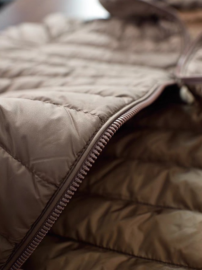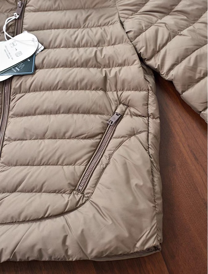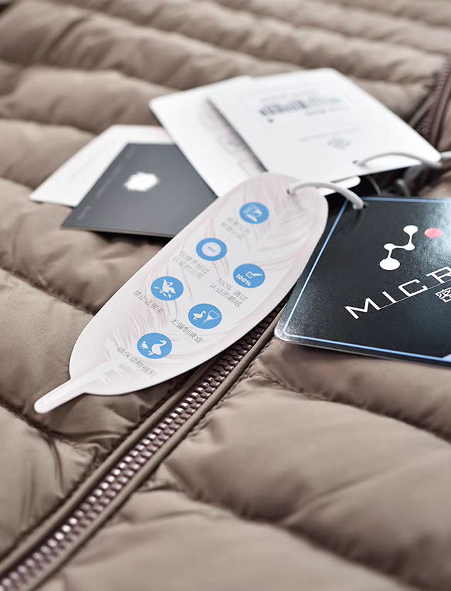 采用密克柔超高密度无胆防绒羽绒面料 (MONCL**供应商)定制高密度棉感记忆面料轻量、轻薄、柔软而且持久耐用,手感柔软,无胆防绒,表面丝绸感光泽,防泼水,密度超高,无需担心钻绒。