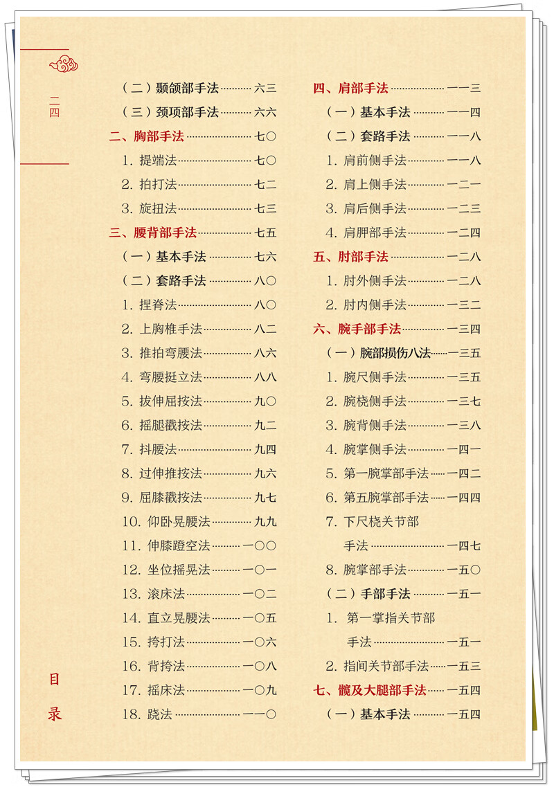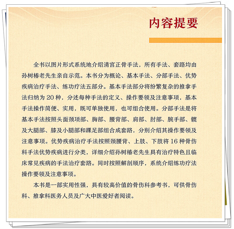 中医正骨手法作为祖国医学的重要组成部分,历经两千余年的历史,流传深广,历代以来,形成流派较多。清宫正骨手法源于上驷院绰班处,手法讲究轻巧柔和,常于谈笑间将病治好,疗效独特。由于清宫正骨手法深处清宫,服务特殊人群,所以外人知之甚少,具有很高的神秘性。孙树椿老先生继承清宫正骨手法,结合临床经验,将手法发扬光大,广泛应用于临床。本书在首版基础上进行修订,突出特色疾病治疗手法,图文并茂、实用性强。全书分五部分——概论、基本手法、分部手法、特色疾病治疗手法、练功疗法。本书所有手法、套路均由孙树椿老先生亲自示范。可供骨伤、推拿专业人员临床应用,也可以用于临床的科研与教学,以及广大业余爱好者参考使用。