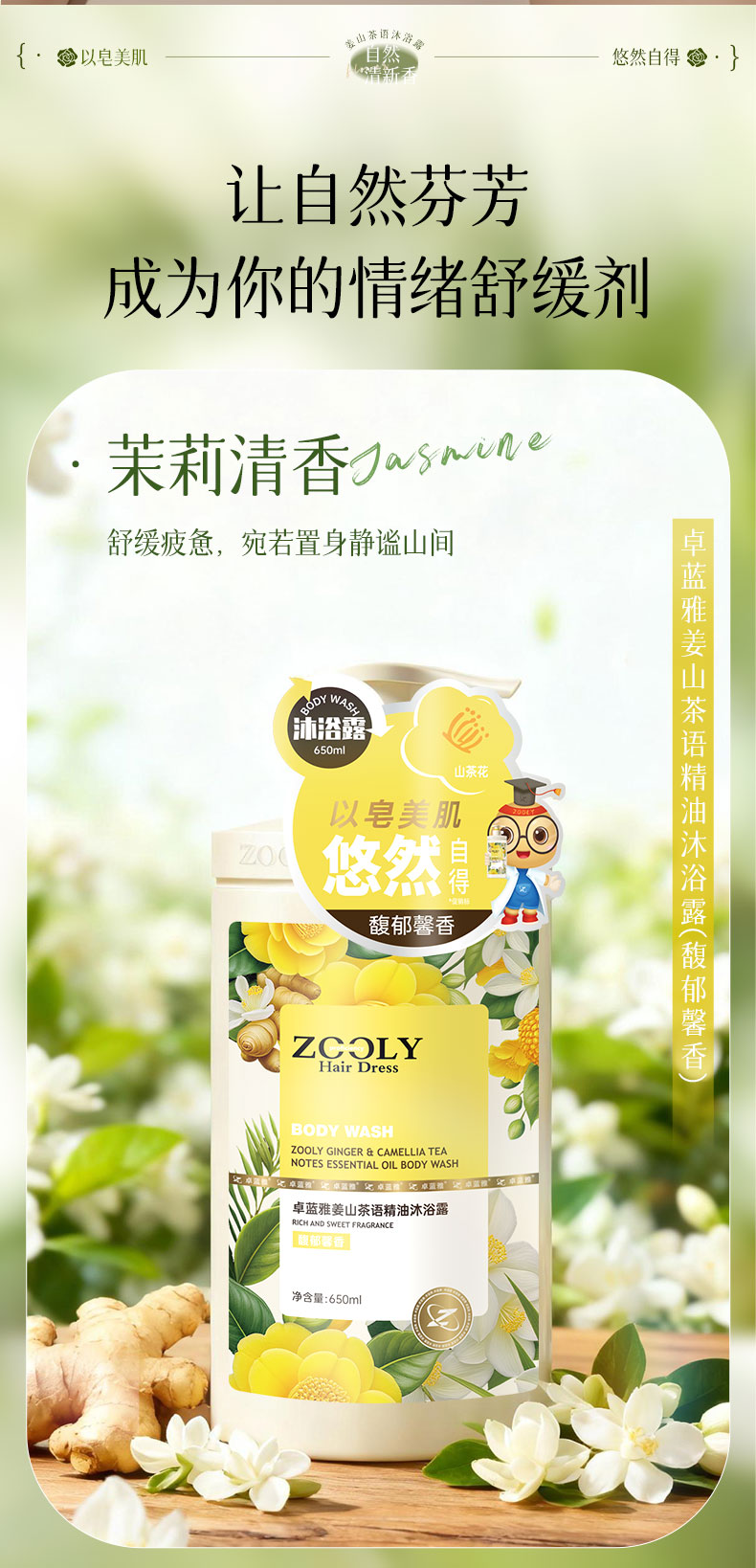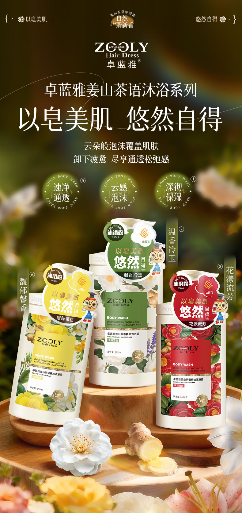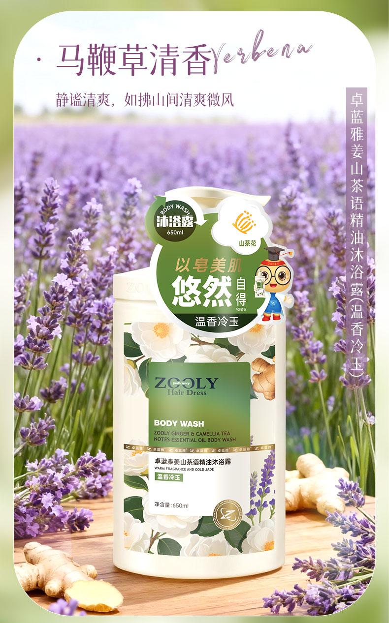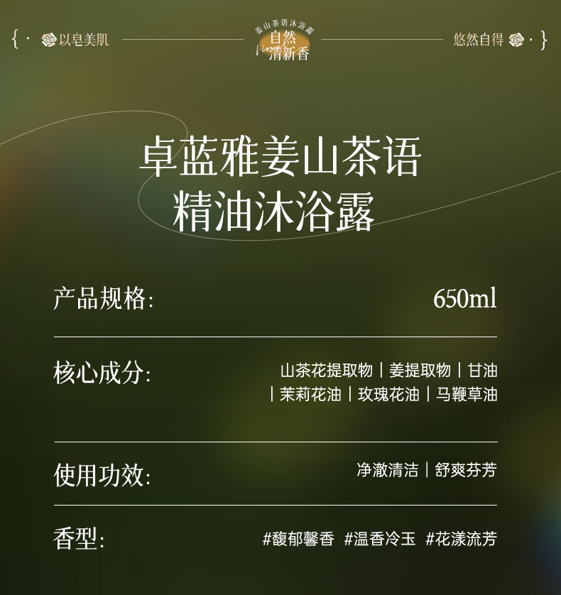 新品上市 卓蓝雅姜山茶语系列精油沐浴露650ml 滋润不假滑 洁净不拔干