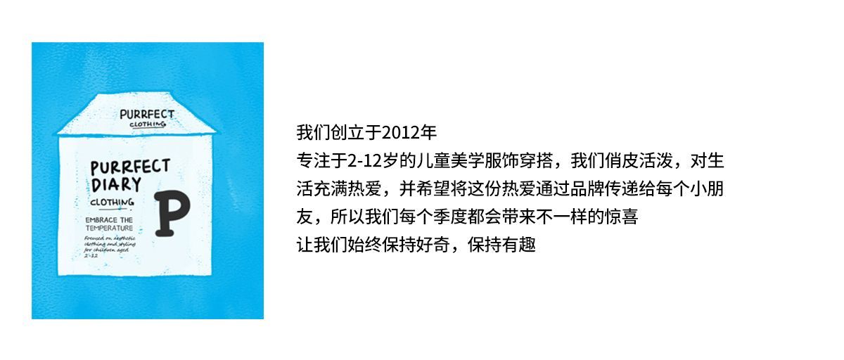 - Purrfect-Diary专注于贴近自然随性的穿着概念,轻奢平价的童装文化传播,在产品设计上更加注重婴童穿着的舒适性、安全性、更出众的国际化品牌,将欧美的育婴文化在中国进行深入的传播与推广。