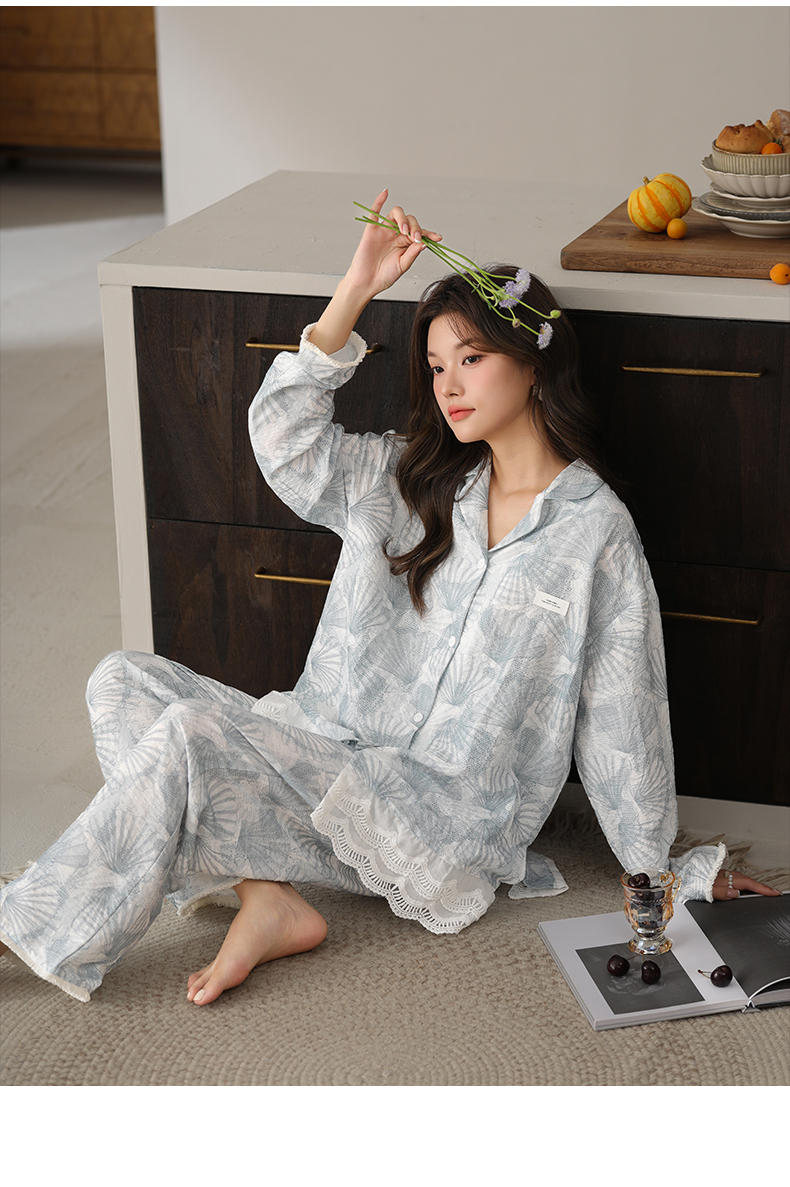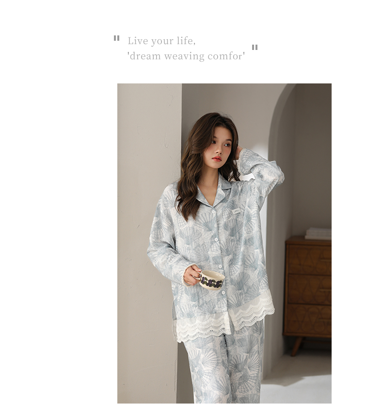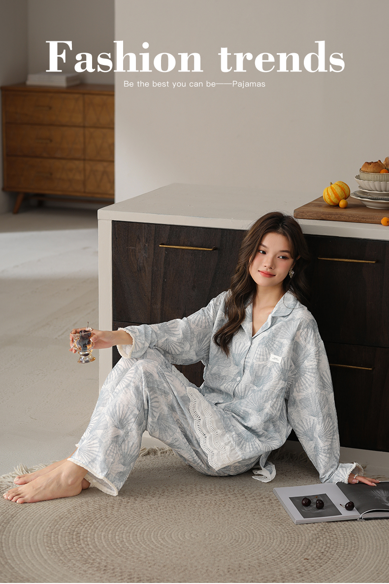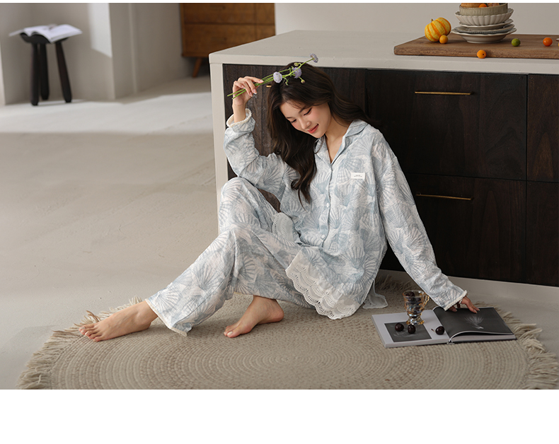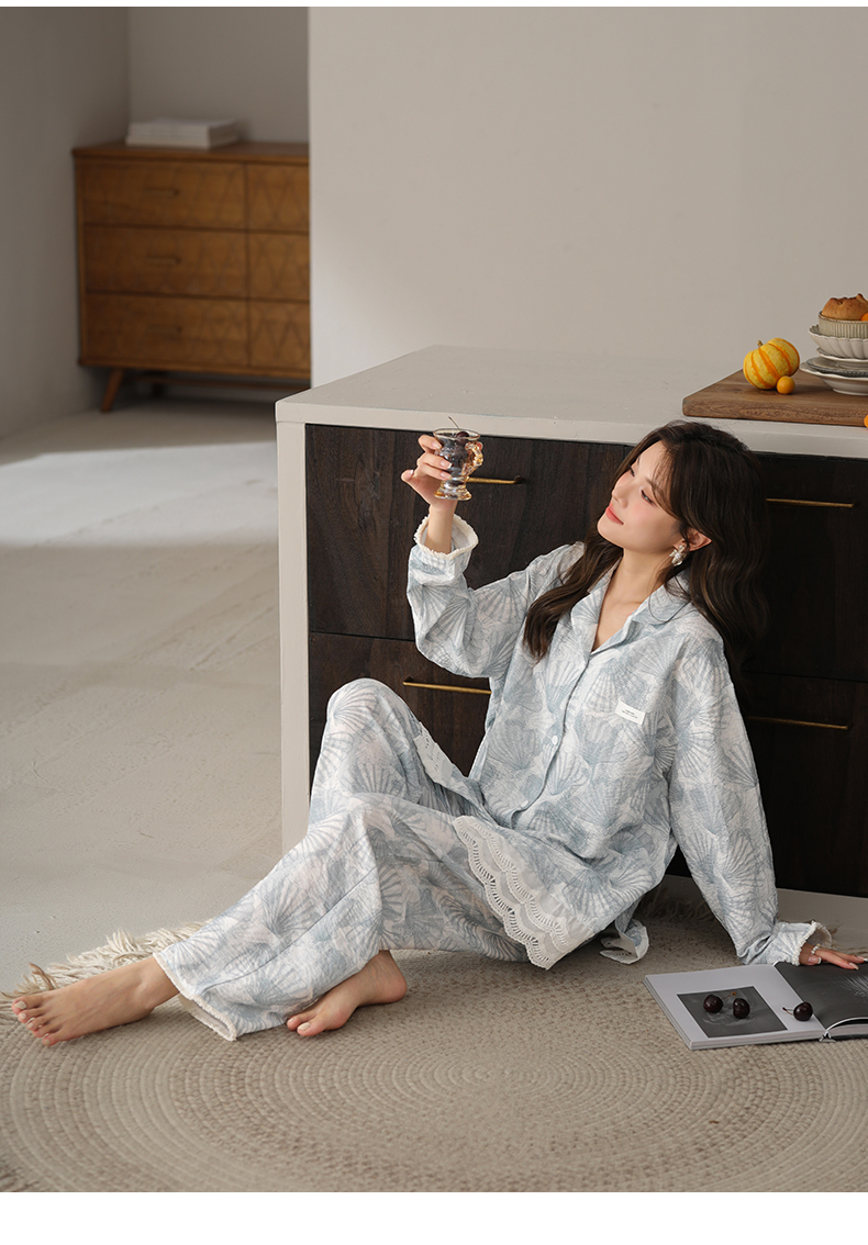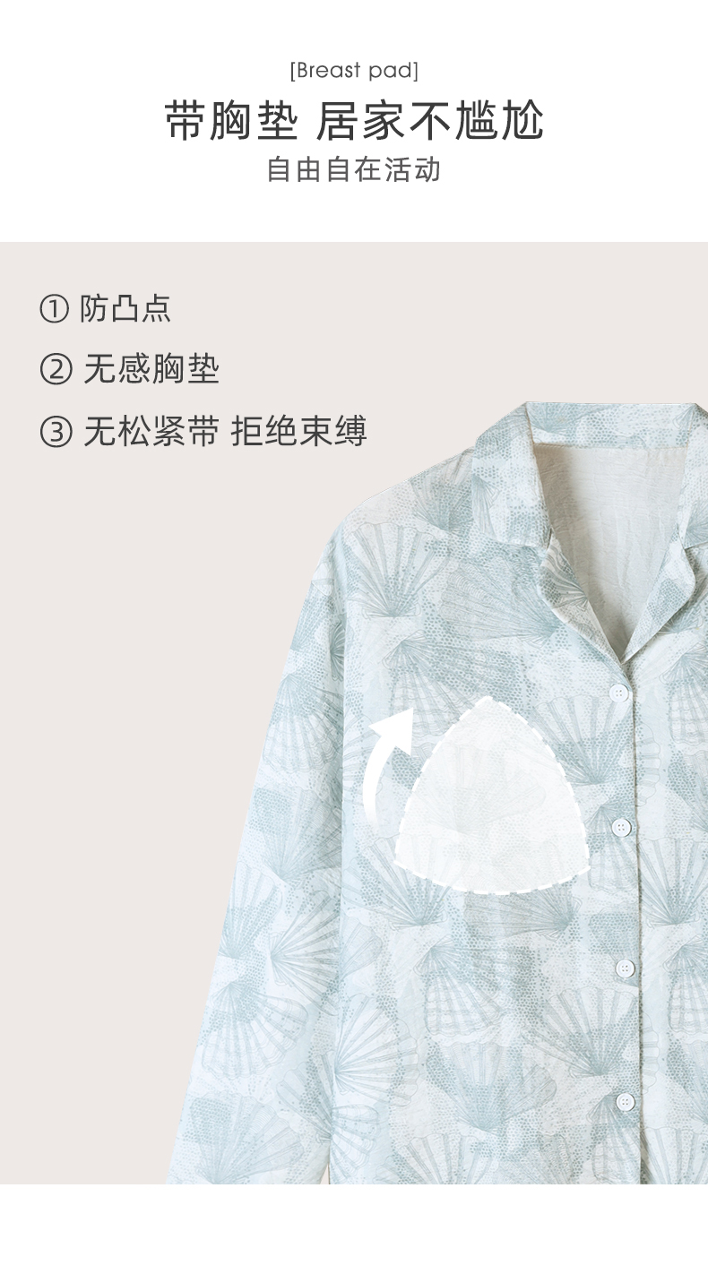 可人儿春秋季带胸垫泡泡绵女士长袖长裤睡衣可外出小众家居服套装