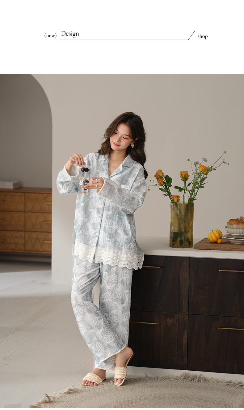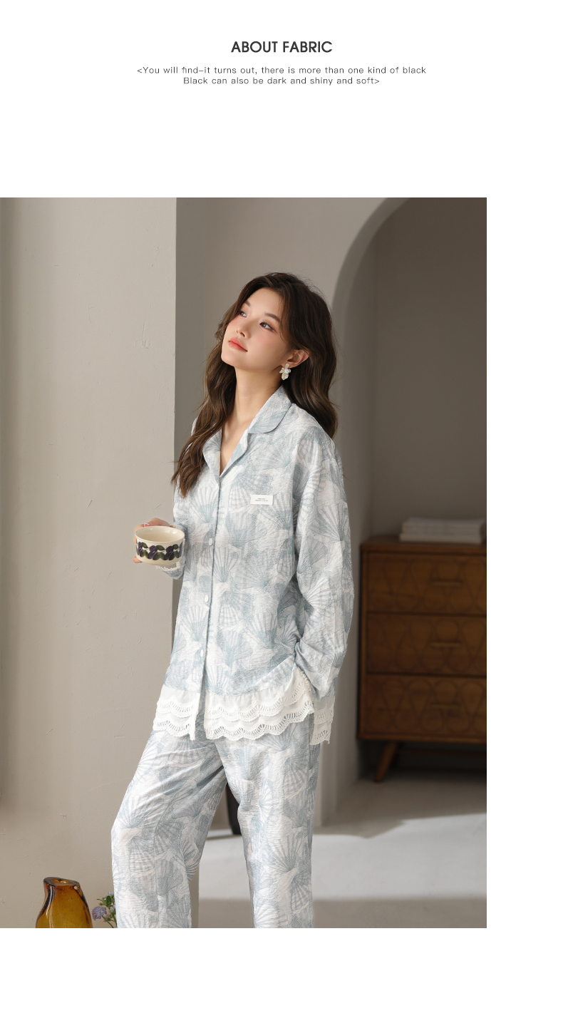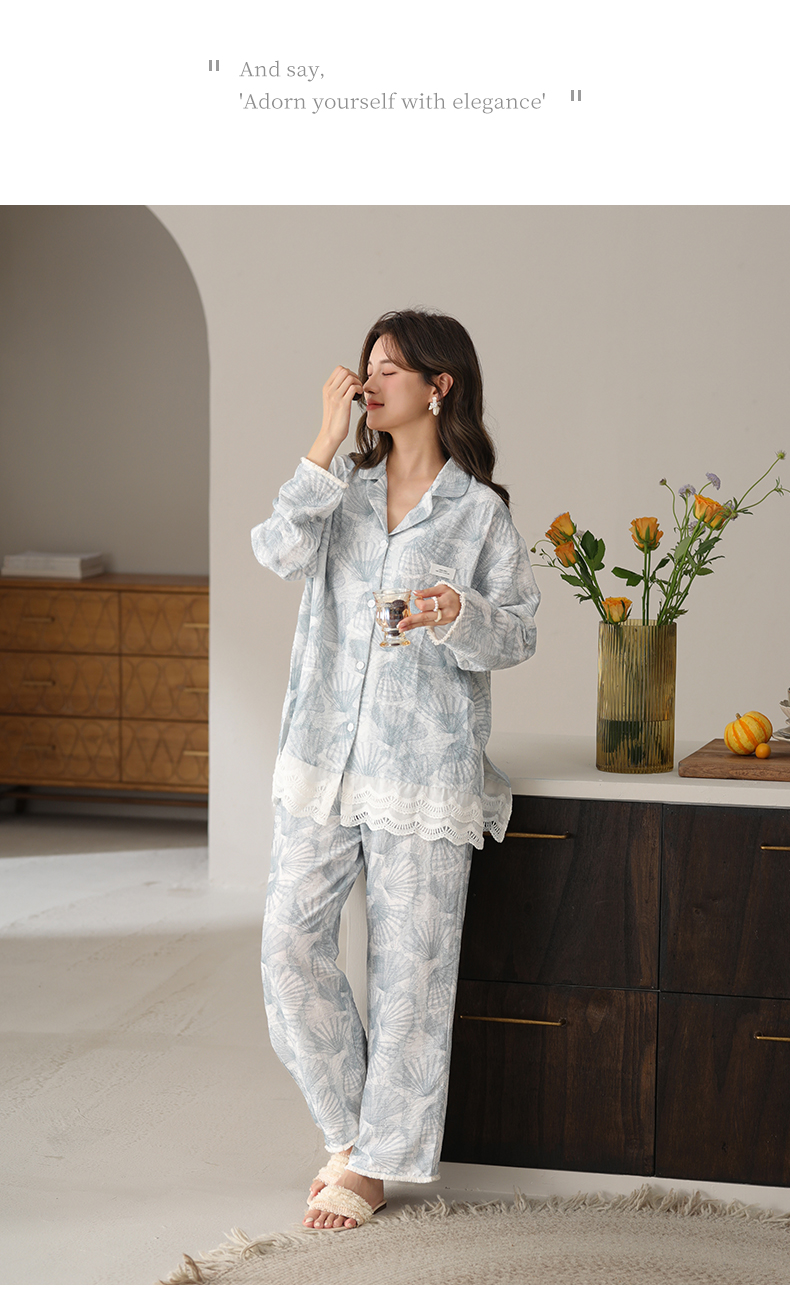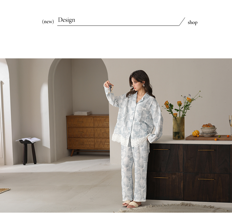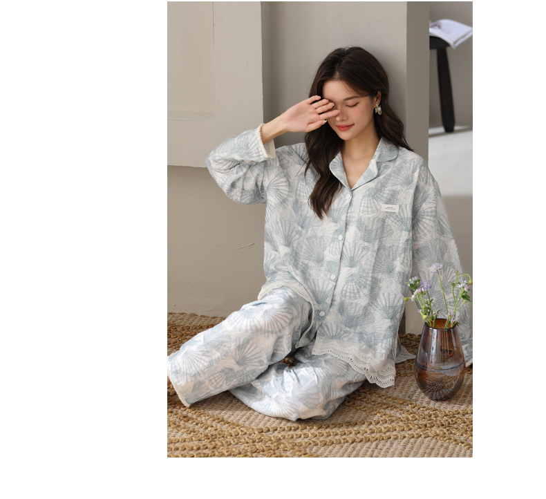 可人儿春秋季带胸垫泡泡绵女士长袖长裤睡衣可外出小众家居服套装