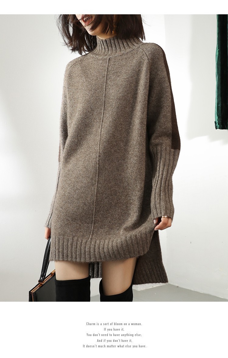秋冬季新款半高领拼色连衣裙毛衣女士中长款上衣宽松大码针织裙外穿