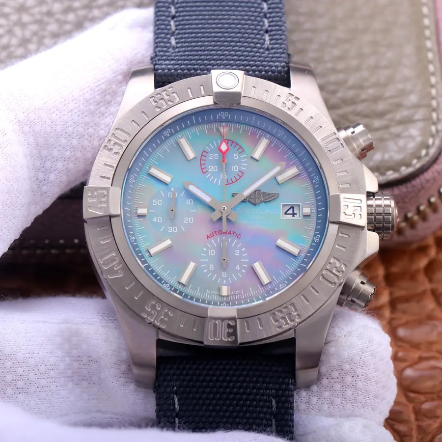 表壳采用超前革新的战斗机材料钛金属材质打造而成;表盘采用天然贝壳面镶嵌航空模制时标,并配备由百年灵自制自动上弦机芯驱动的专属12小时时间显示。