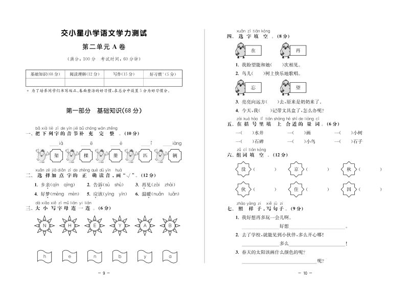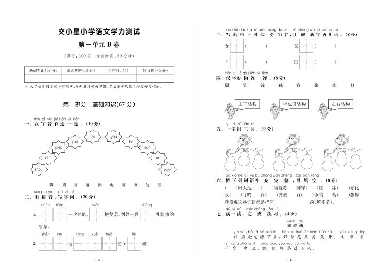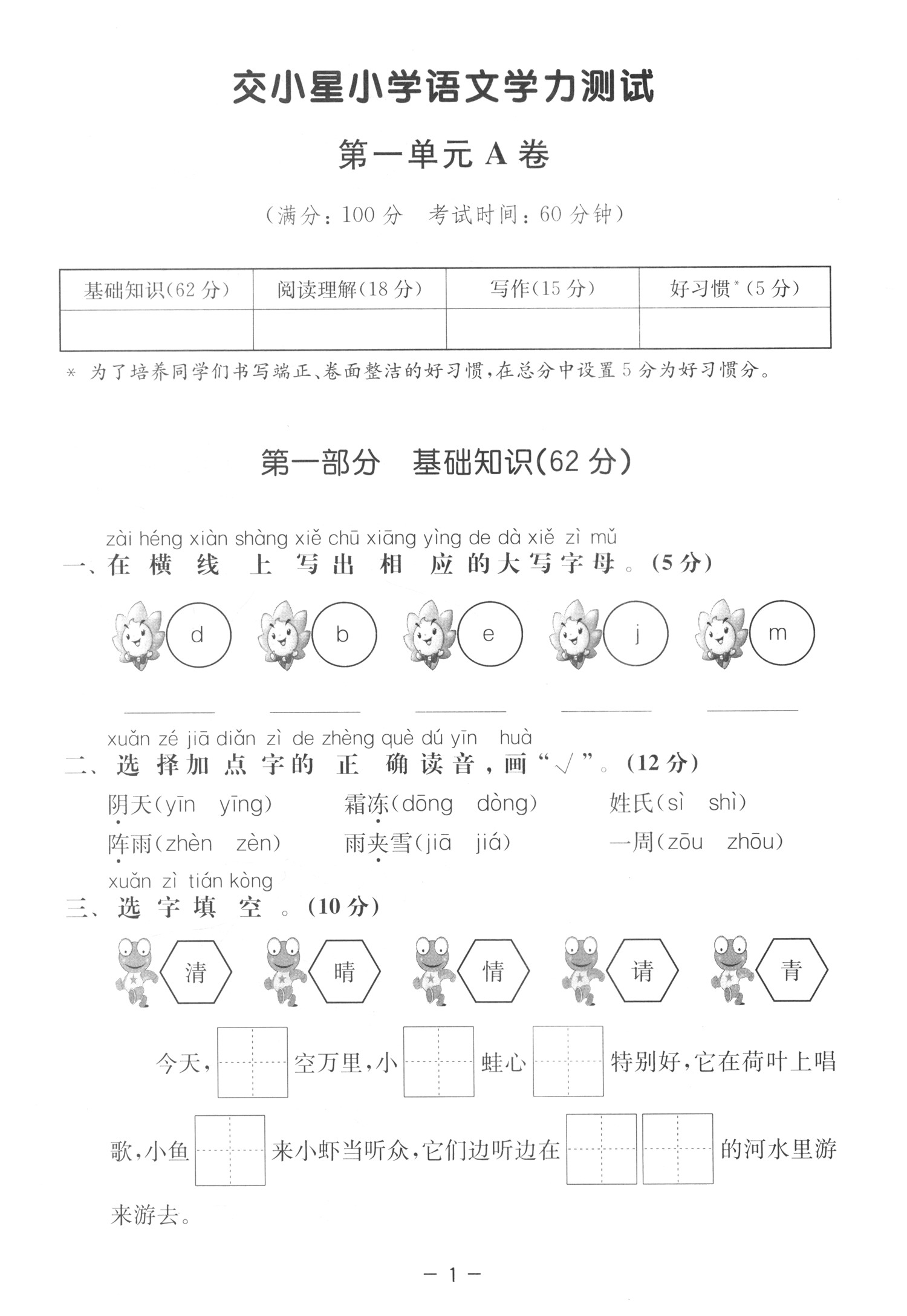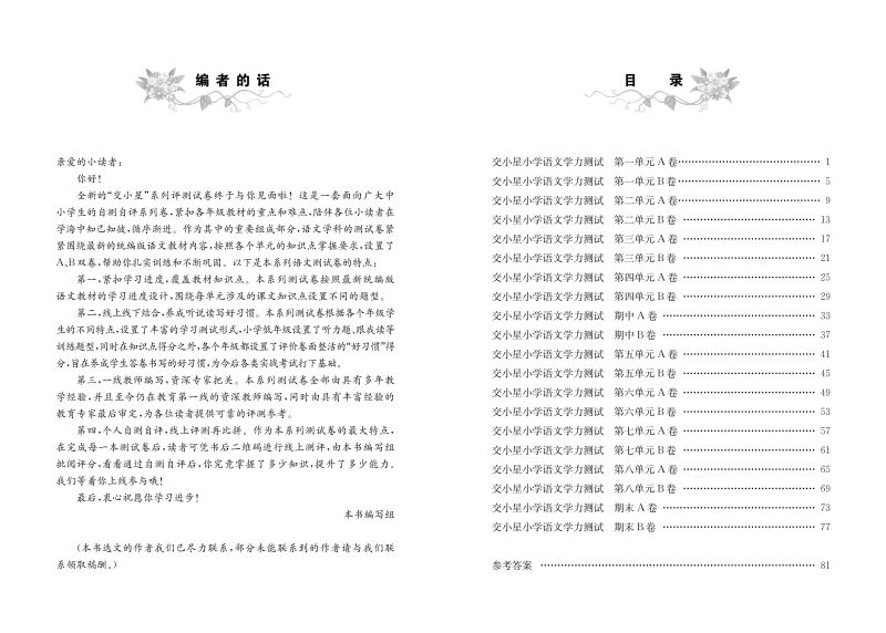 全新的“交小星”系列评测试卷终于与你见面啦!这是一套面向广大中小学生的自测自评系列卷,紧扣各年级教材的重点和难点,陪伴各位小读者在学海中知己知彼,循序渐进。作为其中的重要组成部分,语文学科的测试卷紧紧围绕最新的统编版语文教材内容,按照各个单元的知识点掌握要求,设置了A、B双卷,帮助你扎实训练和不断巩固。以下是本系列语文测试卷的特点: