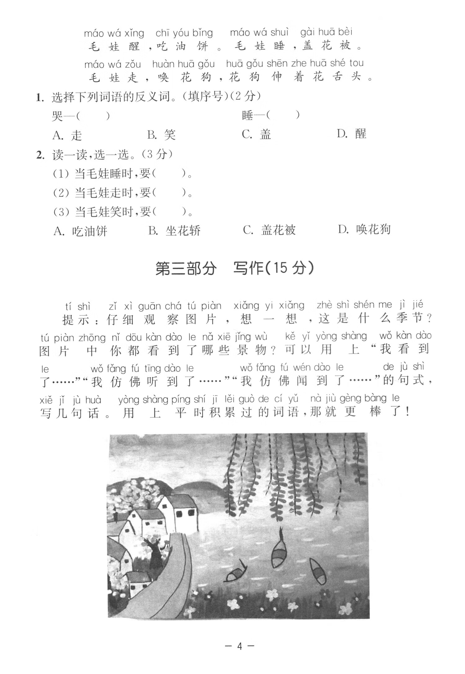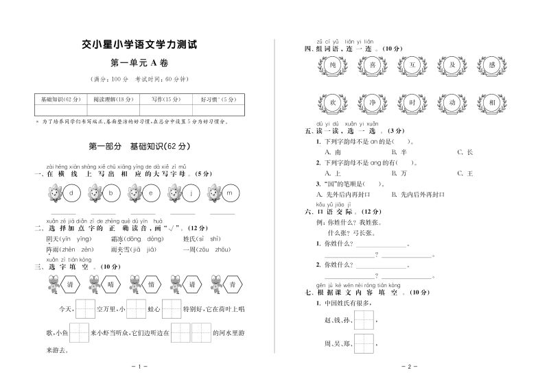 二,线上线下结合,养成听说读写好习惯。本系列测试卷根据各个年级学生的不同特点,设置了丰富的学习测试形式,小学低年级设置了听力题、跟我读等训练题型,同时在知识点得分之外,各个年级都设置了评价卷面整洁的“好习惯”得分,旨在养成学生答卷书写的好习惯,为今后各类实战考试打下基础。