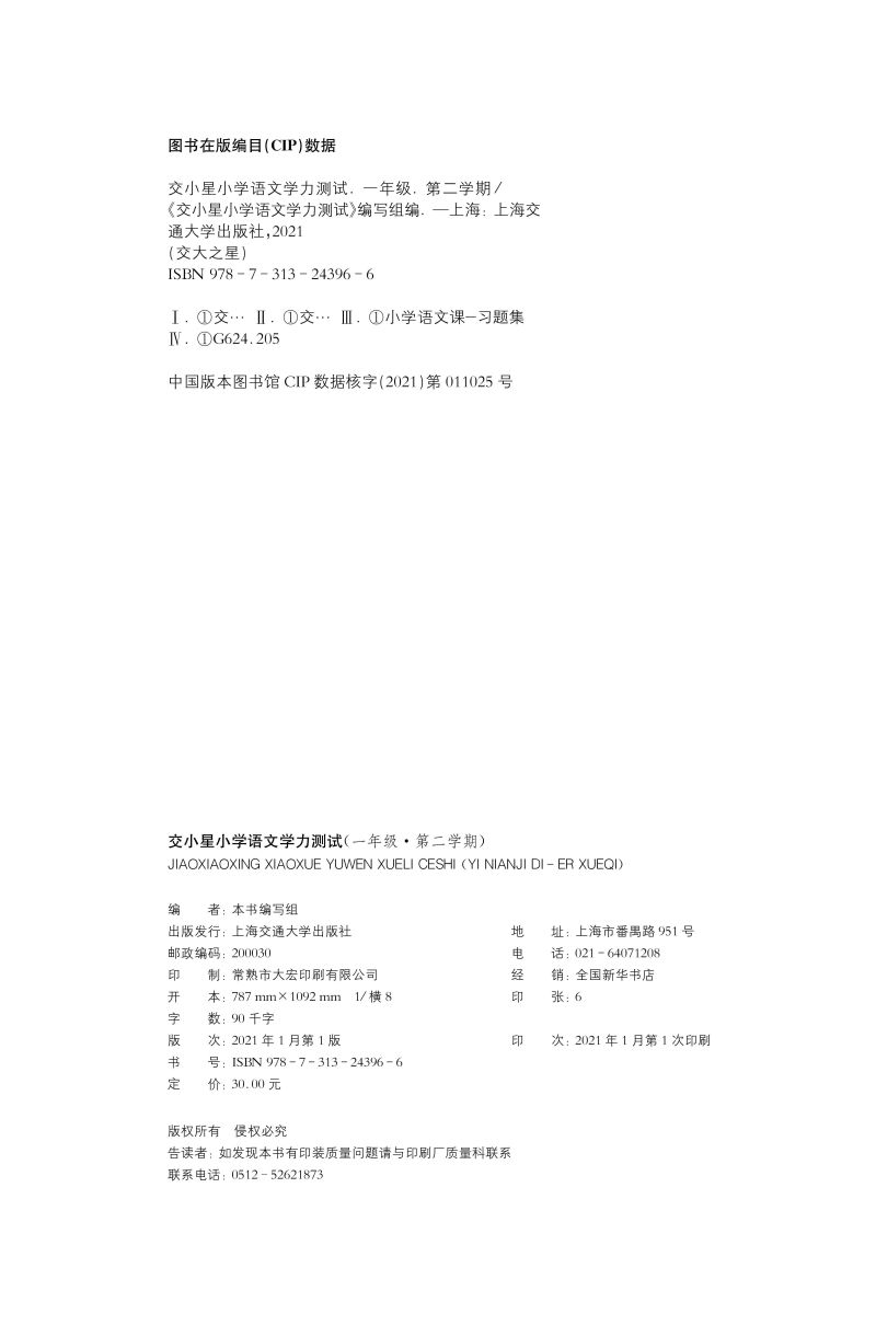 (仓发) 交小星小学语文学力测试 一年级1年级 第二学期 上海同步 交大之星/上海交通大学出版社/9787313243966