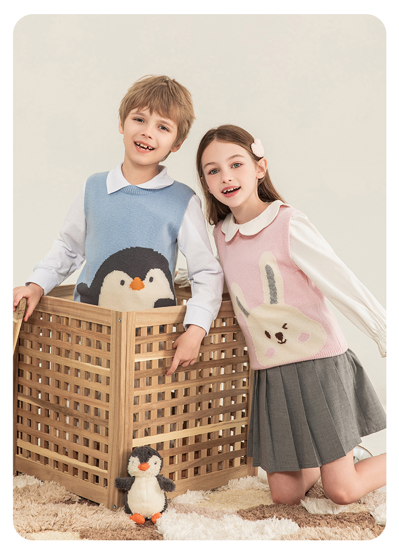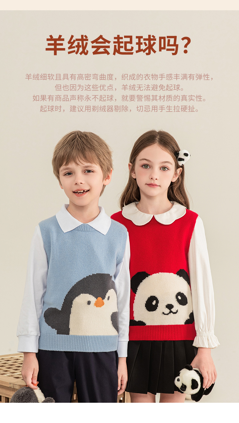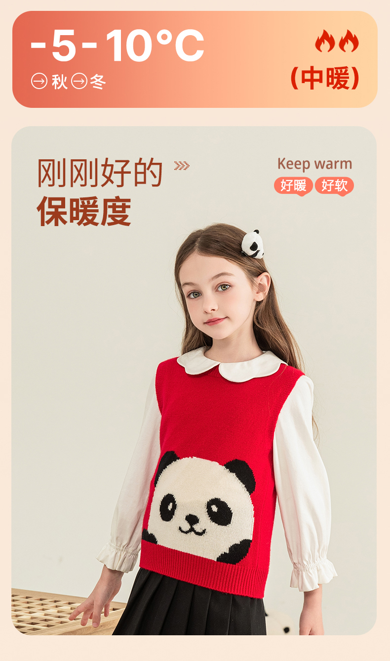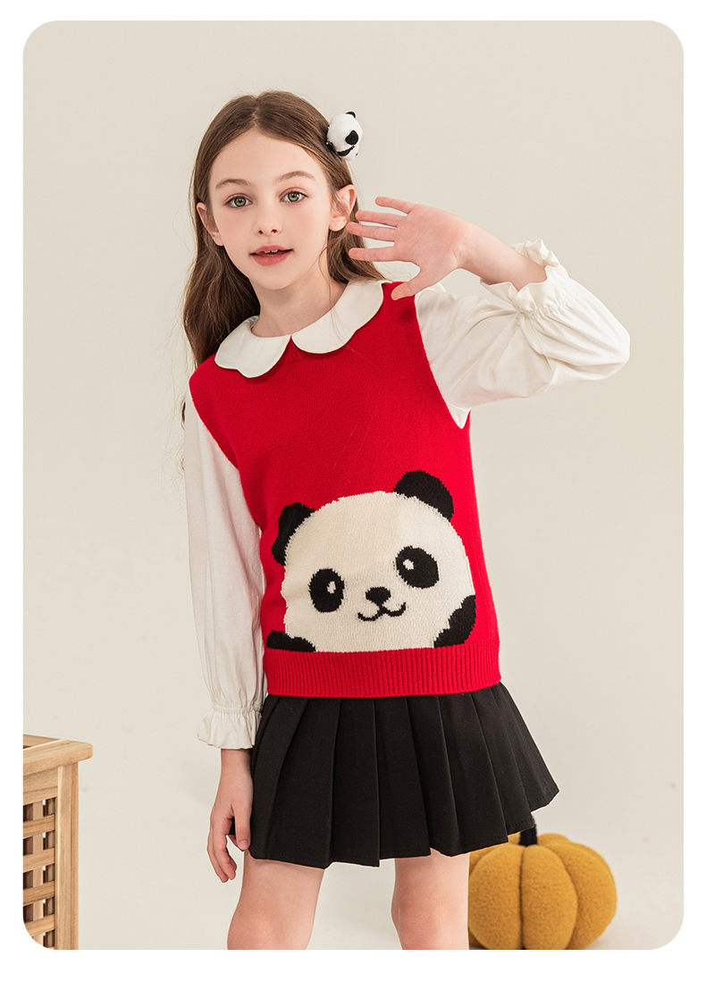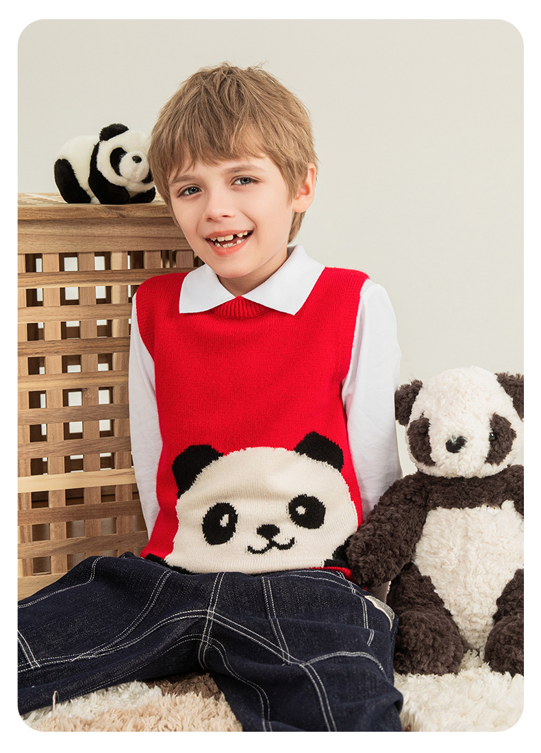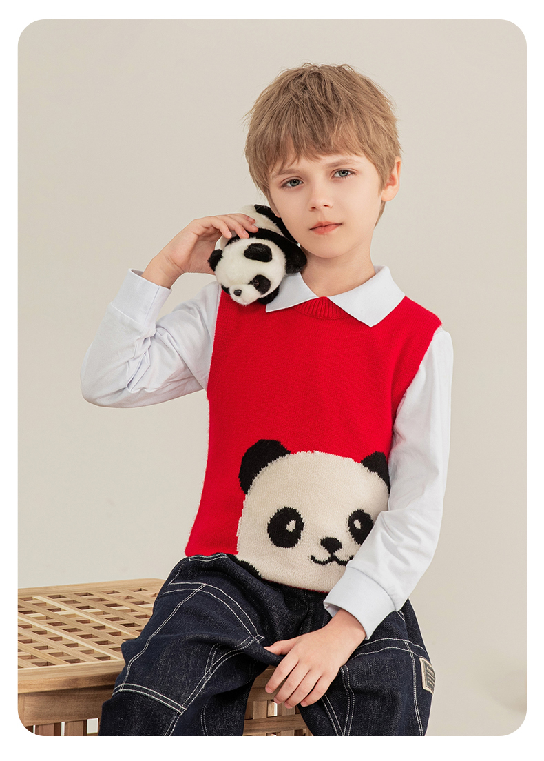 mettekids儿童羊绒背心2023秋季熊猫图案男童针织马甲女童毛衣