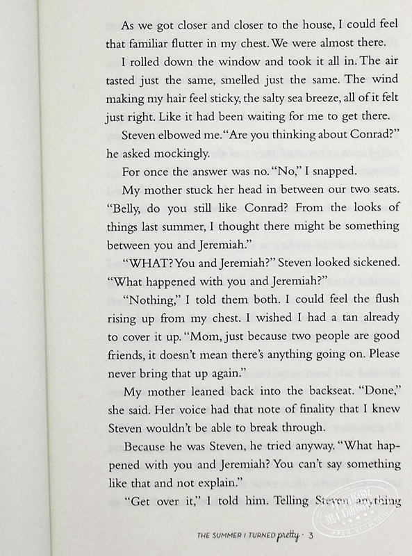 贝利用夏天来衡量她的生活。一切美好的事物,一切神奇的事物都发生在六月和八月之间。冬天只是一个数着周数直到下一个夏天的时间,一个远离海滨别墅、远离苏珊娜的地方,Z重要的是,远离耶利米和康拉德。他们是贝利从第Yi个夏天起就认识的男孩--他们是她的兄弟形象,她的暗恋对象,以及两者之间的一切。但是,在一个夏天,一个美妙而又可怕的夏天,一切都发生了变化,一切都结束了,就像一直以来应该有的那样。