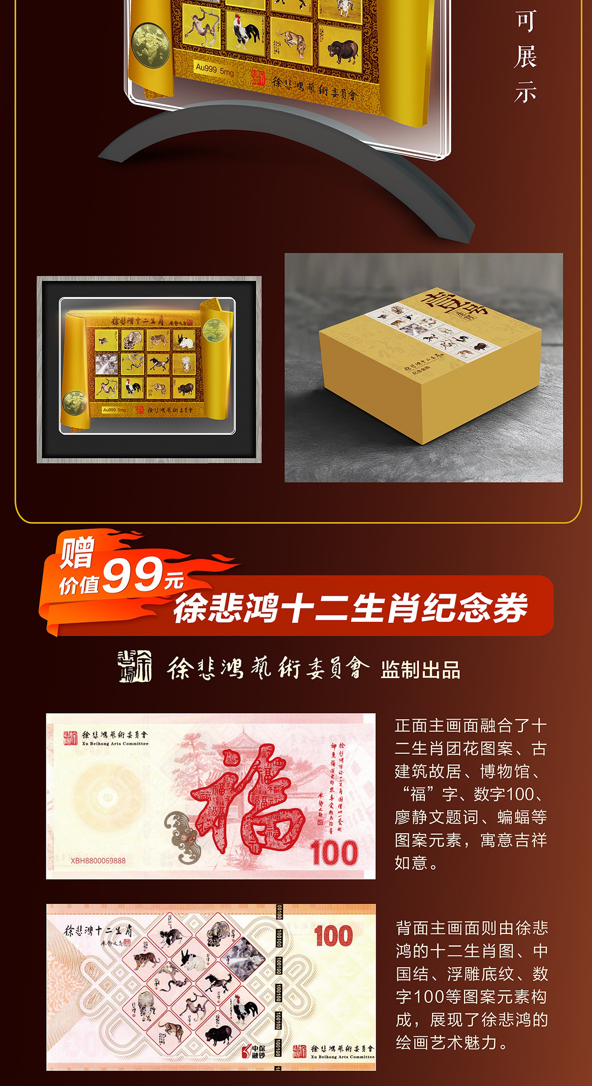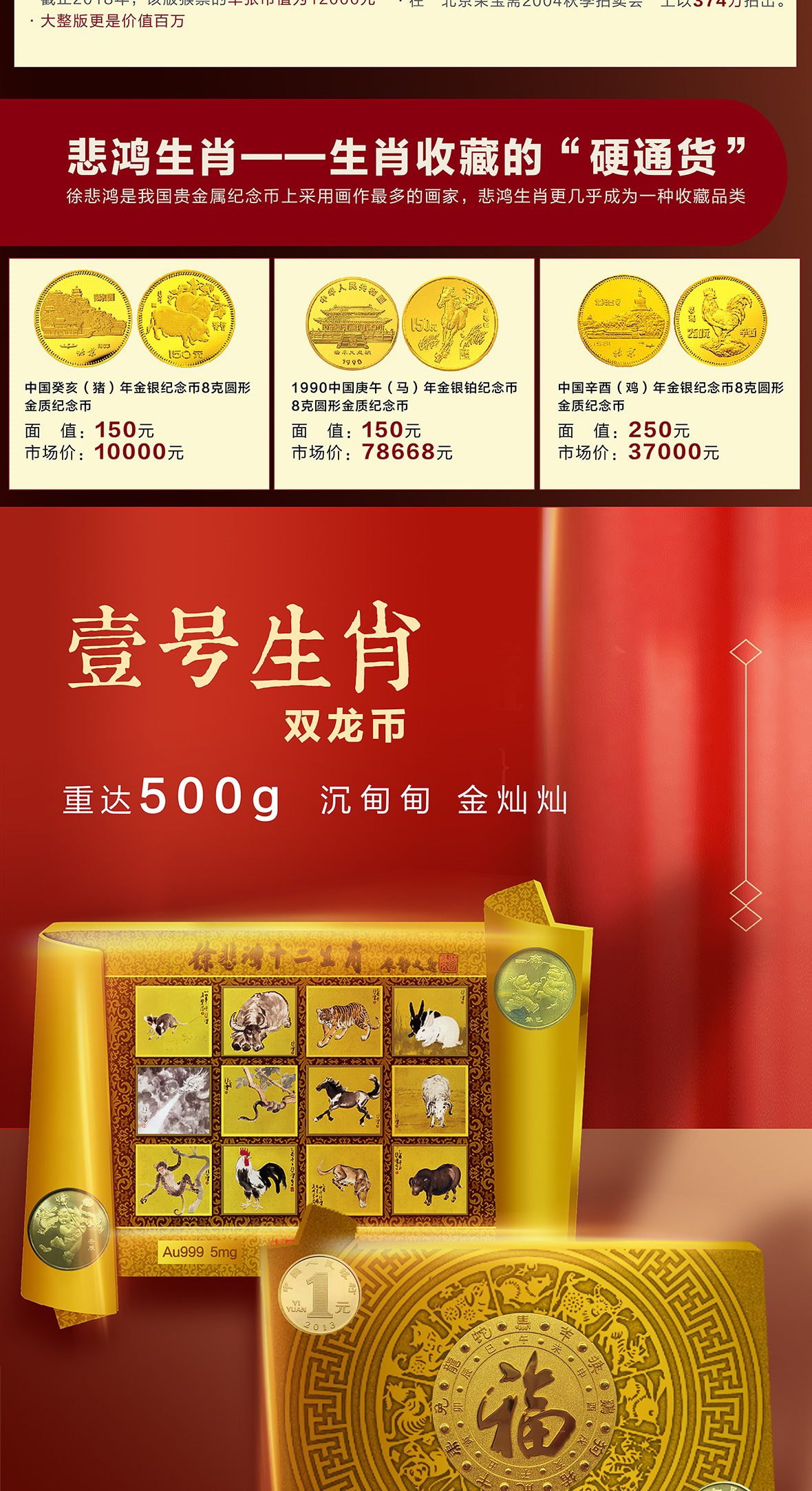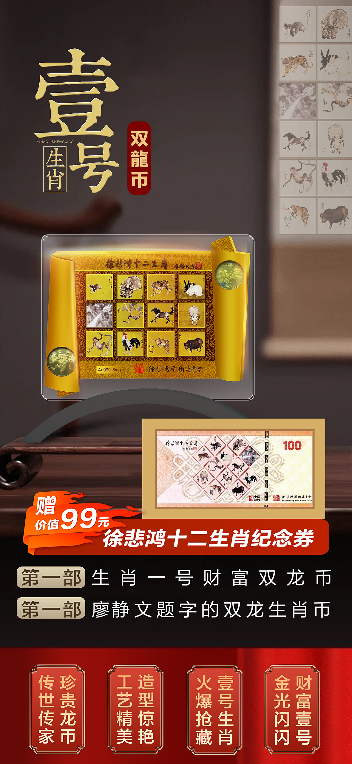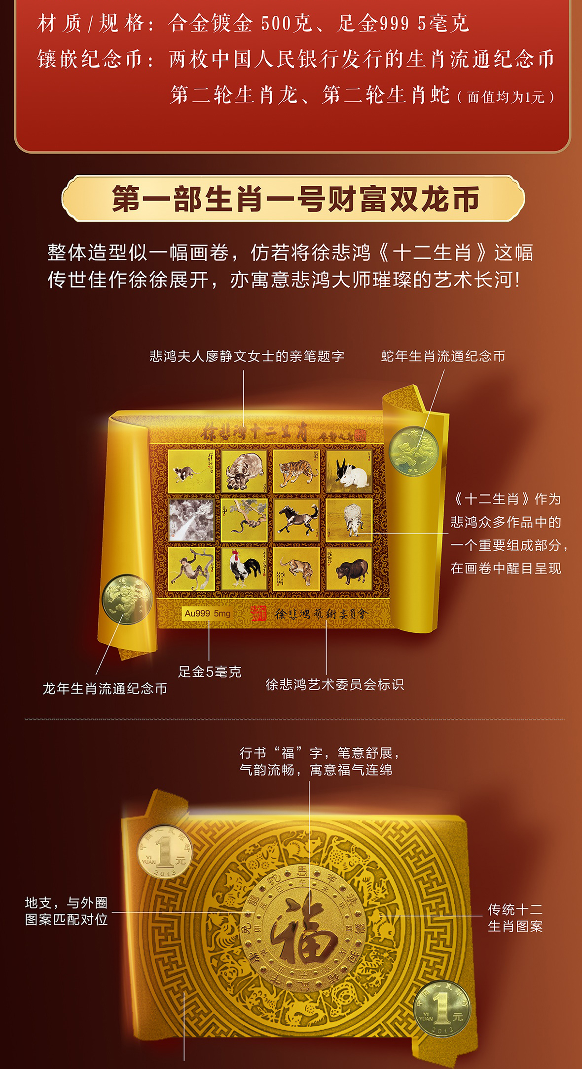 徐悲鸿《生肖壹号》双龙币 足金999 5mg 龙去福留、蛇来聚财 限量赠送(十二生肖纪念券)
