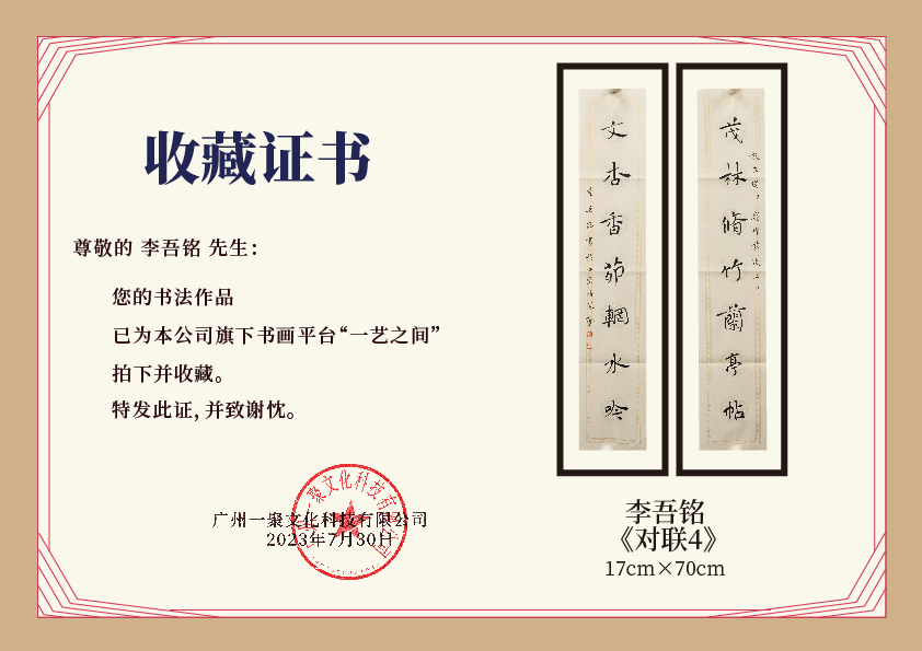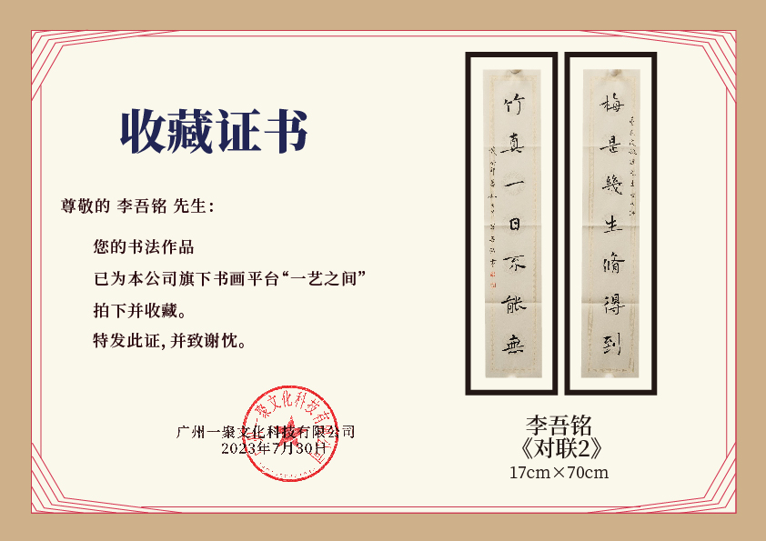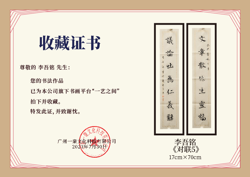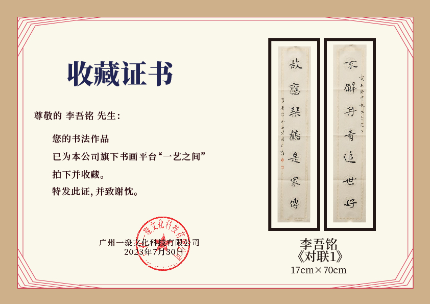 注意:下方收藏证书仅为微信视频号官方要求示意在“一艺之间”下单销售产品均为老师本人授权正版,并非随单赠送,敬请理解。