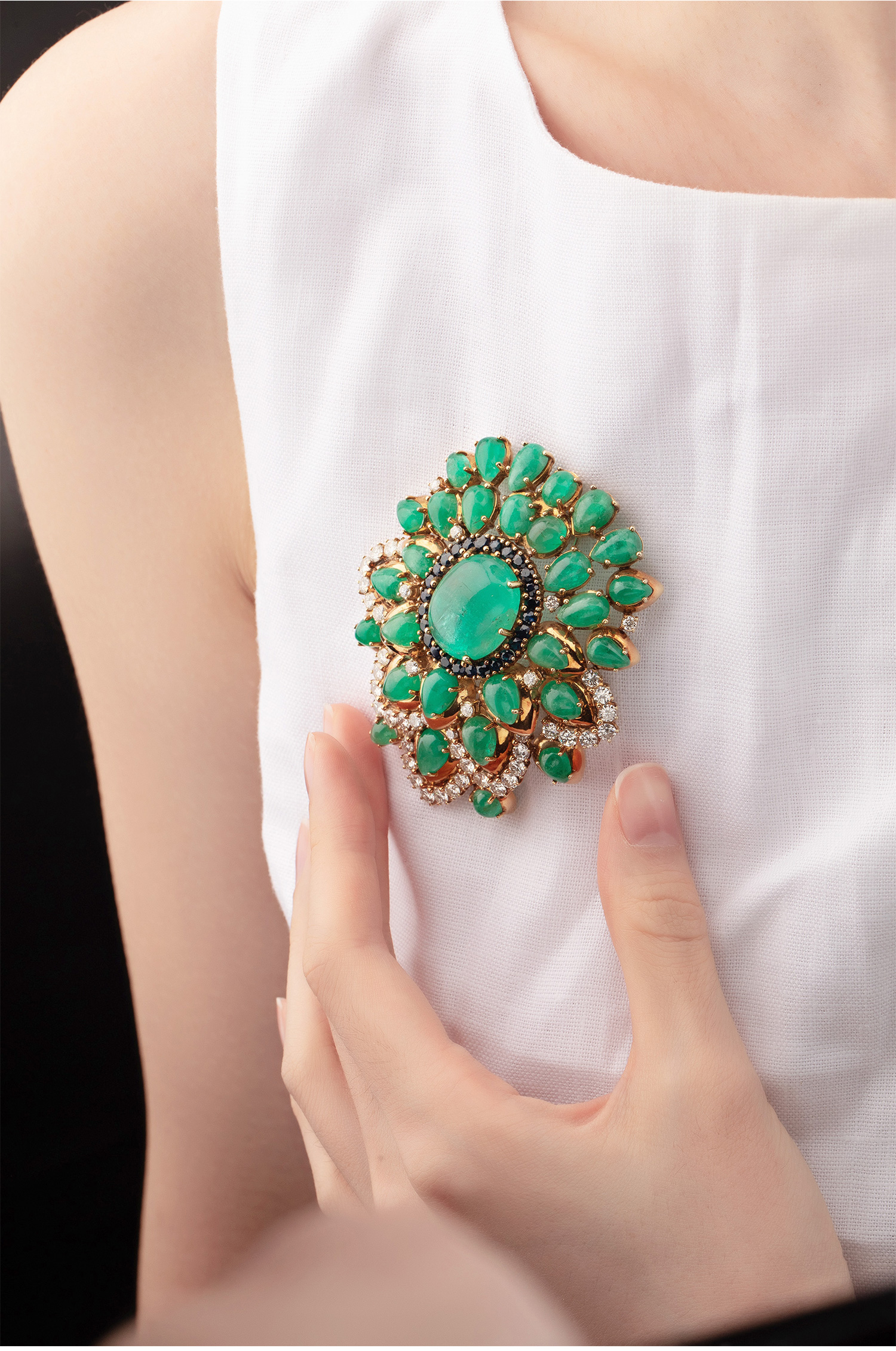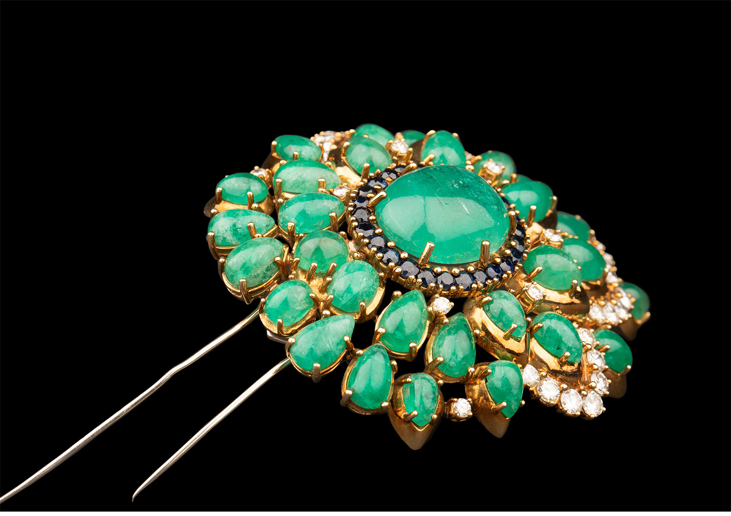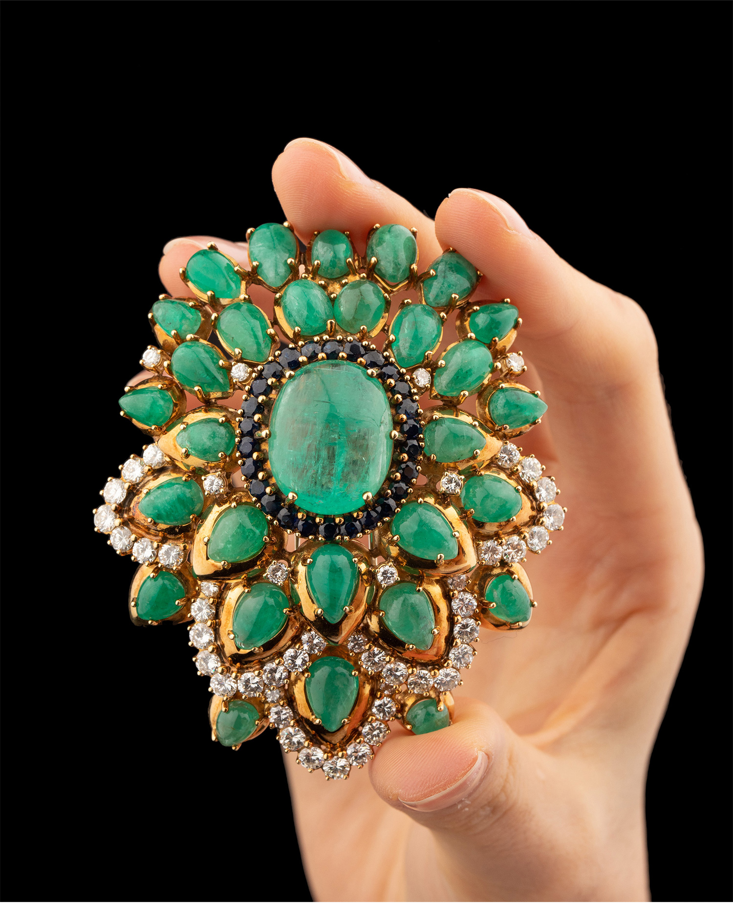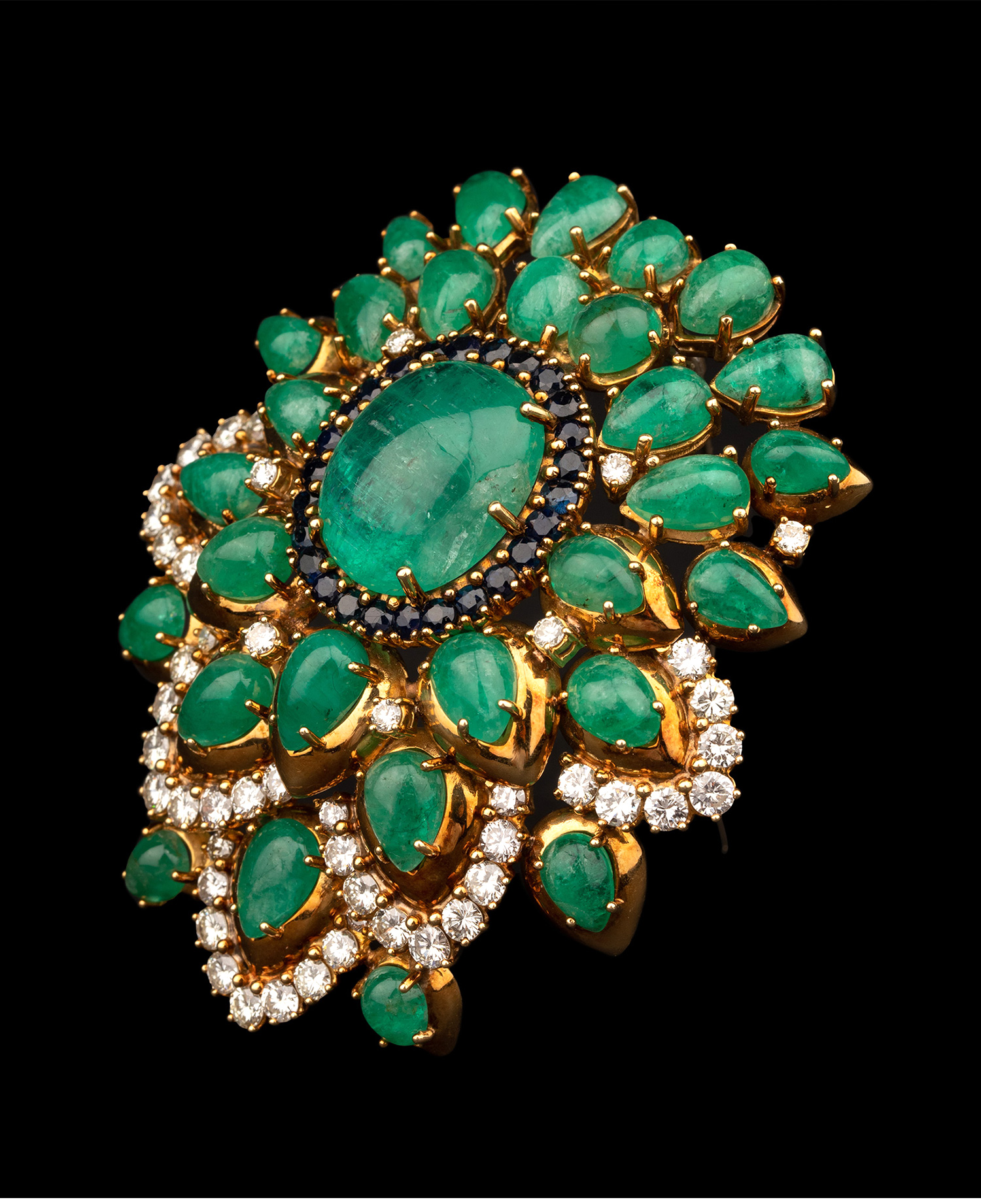 重量:66.7克,钻石49颗,总重约7.1克拉;蓝宝石26颗,总重约2.5克拉;祖母绿30颗,总重约77克拉