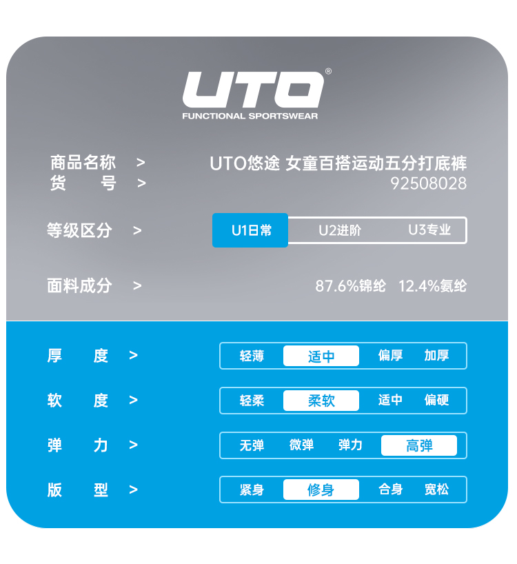 UTO悠途潜心于贴身运动装备的研发、设计和生产。从纤维到组织,从设计到工艺,在无缝贴身运动装备领域,树立国内标杆。 UTO着力于品牌互联网化,不断采集大量运动数据,为跑步、健身、滑雪等不同类型的运动爱