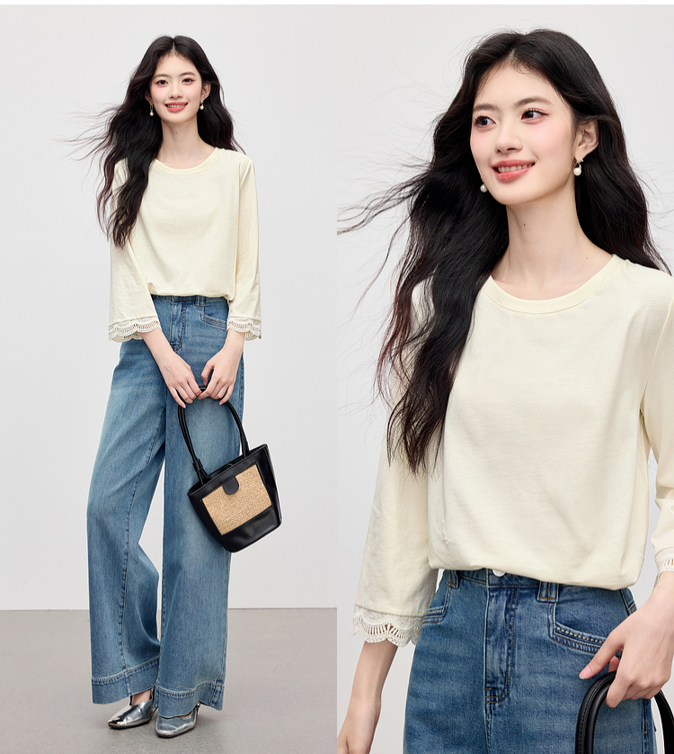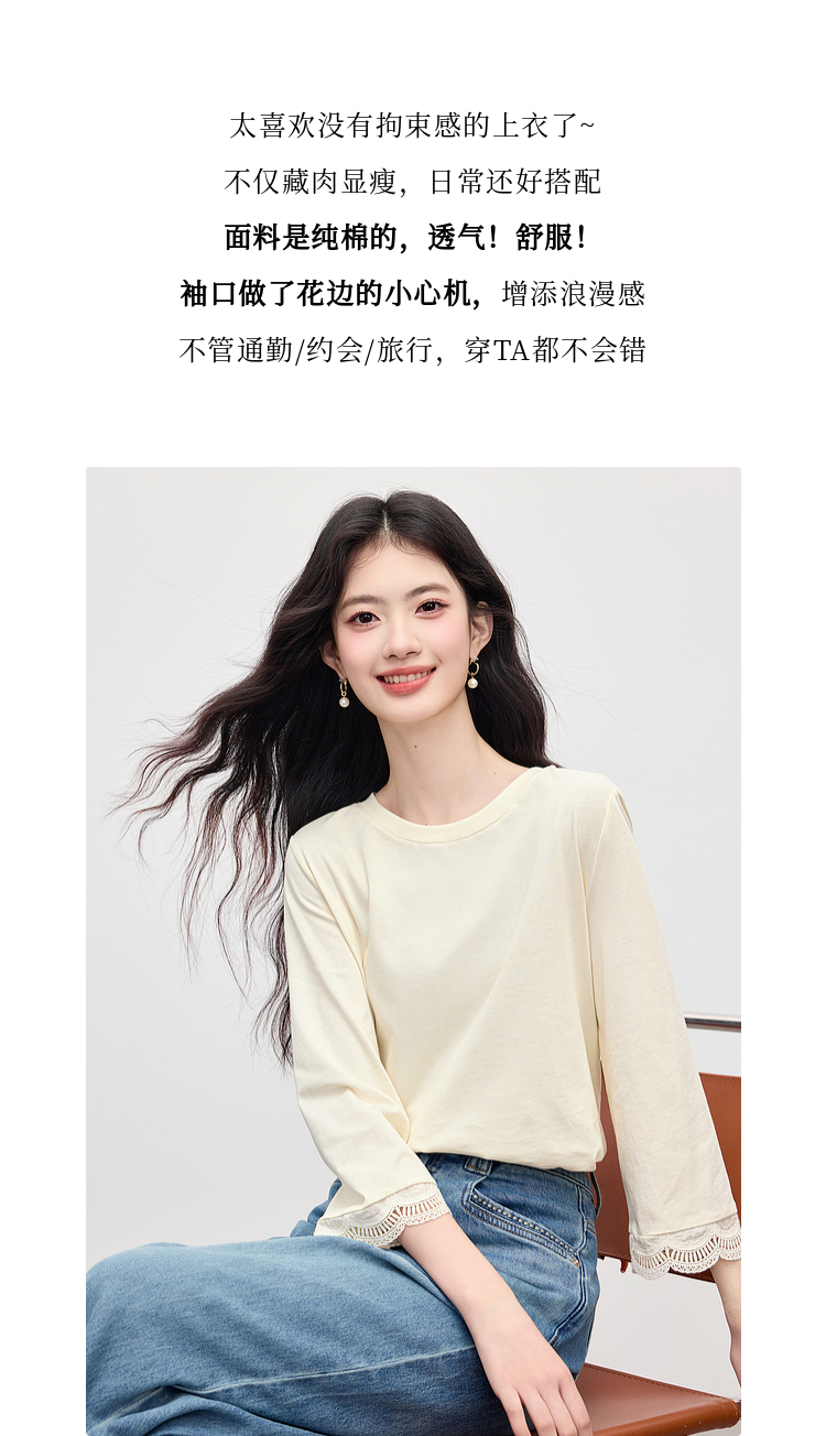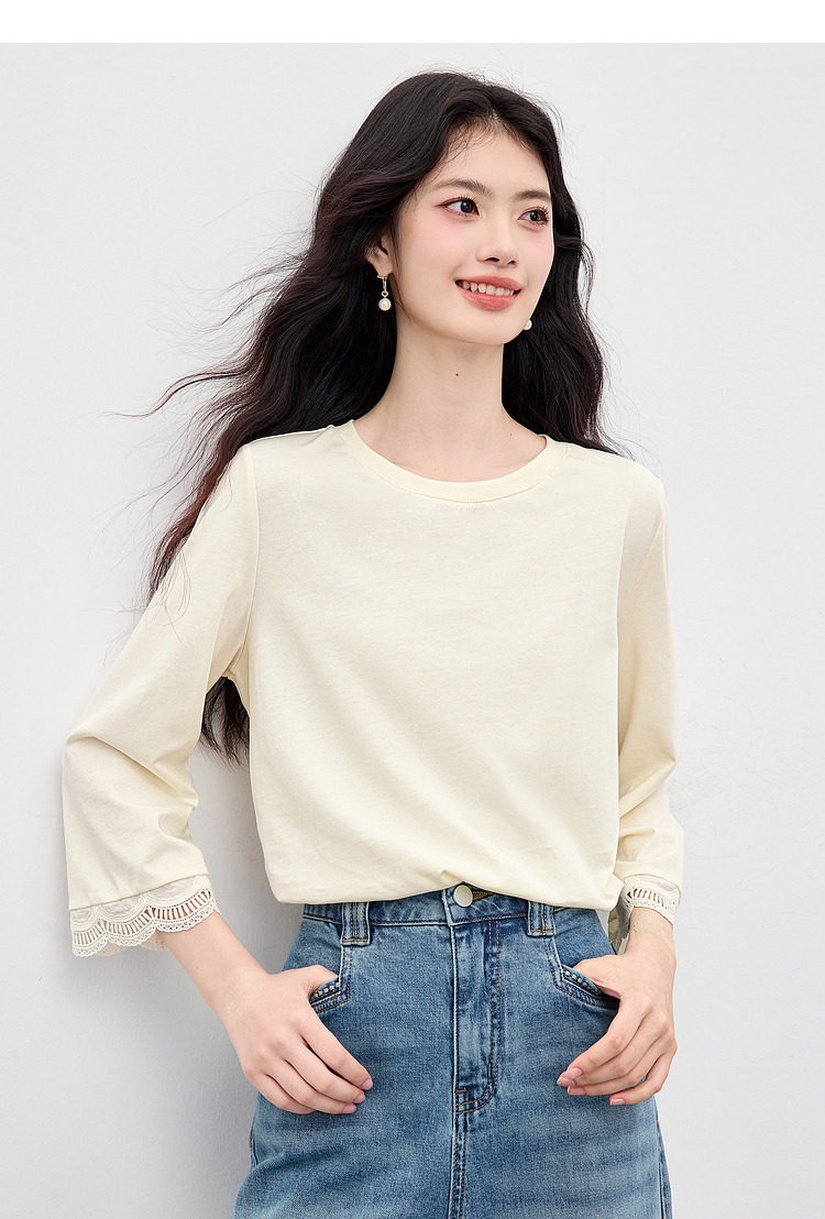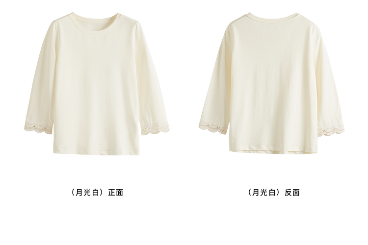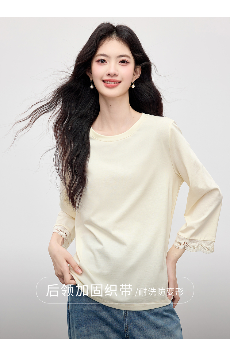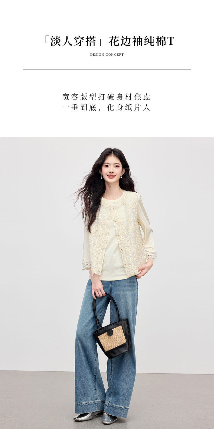 【08/12新品】熙世界镂空花边七分袖T恤女2025年早秋新款圆领独特别致全棉上衣