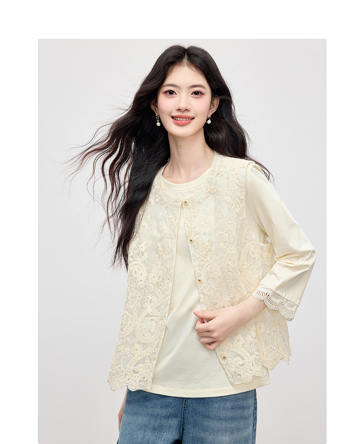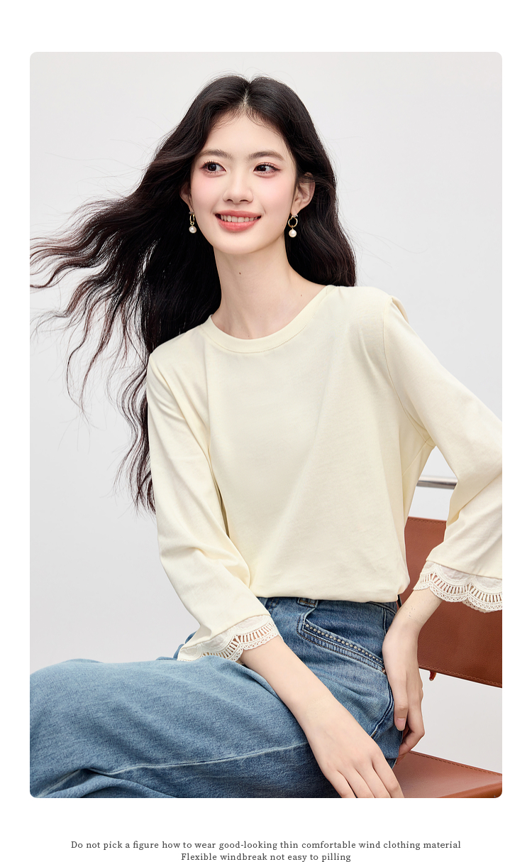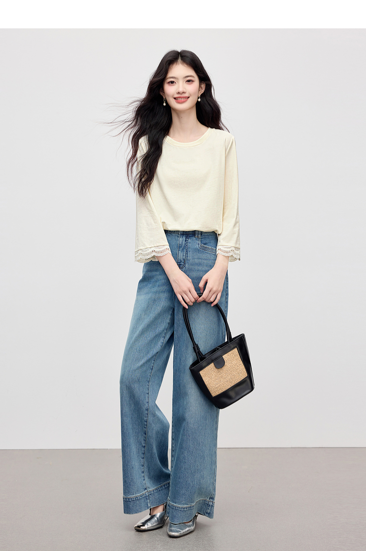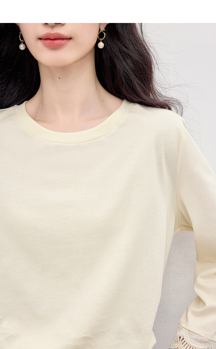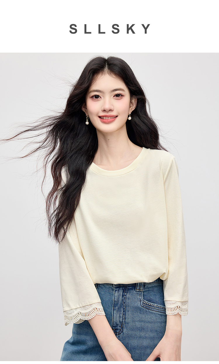 【08/12新品】熙世界镂空花边七分袖T恤女2025年早秋新款圆领独特别致全棉上衣