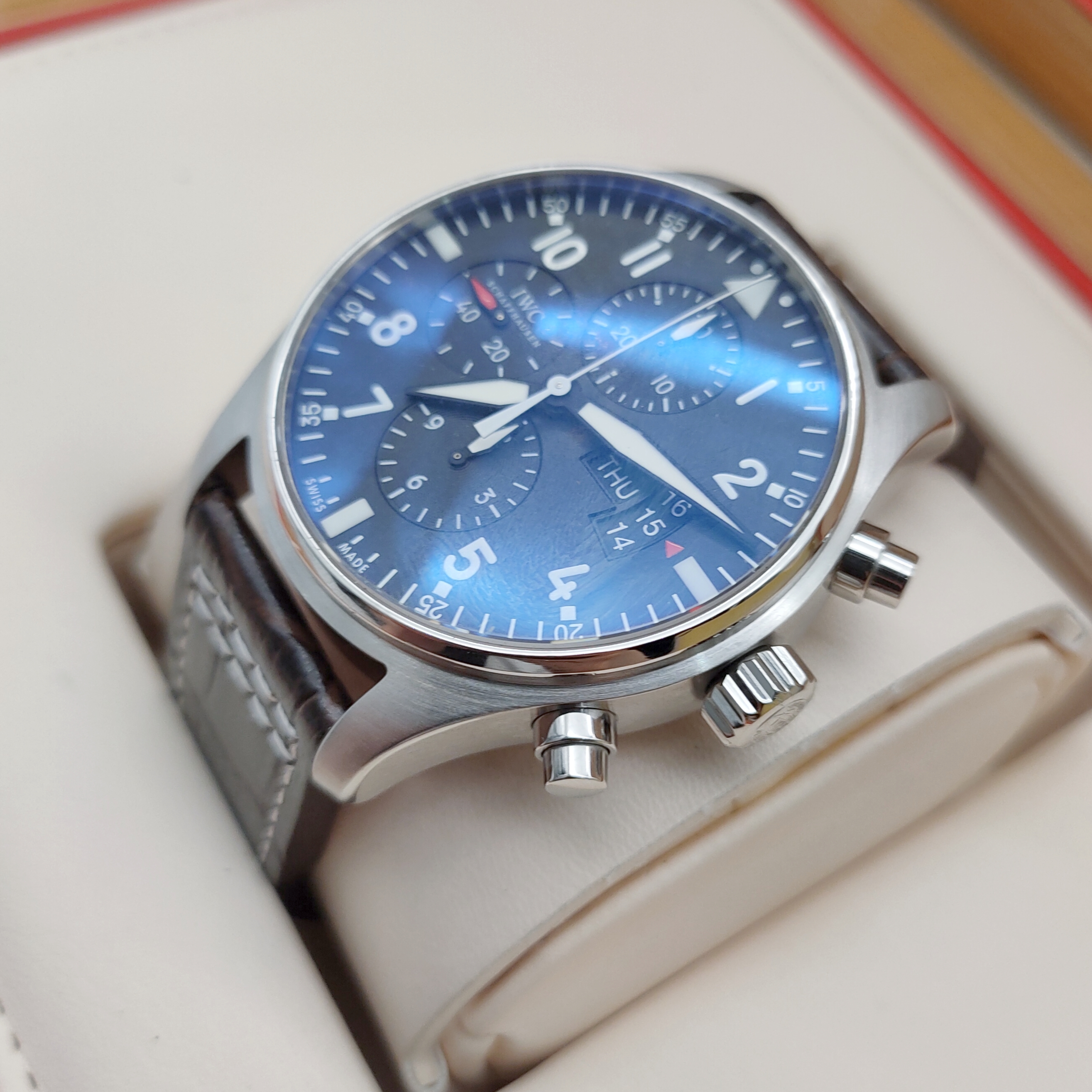 IWC万国表飞行员系列IW377701男款机械表(飞计),43mm表径,黑色喷砂表盘,阿拉伯数字刻度,夜光喷砂指针,精钢表壳皮带,星期日历计时显示,95成新,附件无,专柜价41000,现好价
