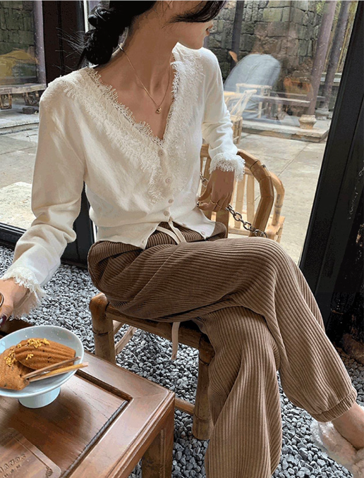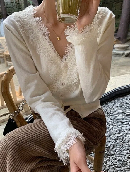 老米优品🎈轻法式优雅风《蕾丝V领针织打底衫》睫毛蕾丝好温柔~ V领小性感设计!春日里的一抹温柔~