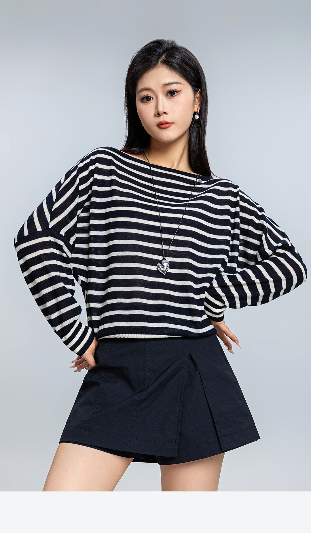 秋上新黑白条纹宽松版型一字领长袖针织衫1253087