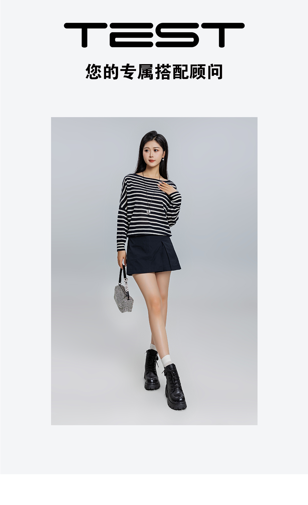 秋上新黑白条纹宽松版型一字领长袖针织衫1253087 商品图3
