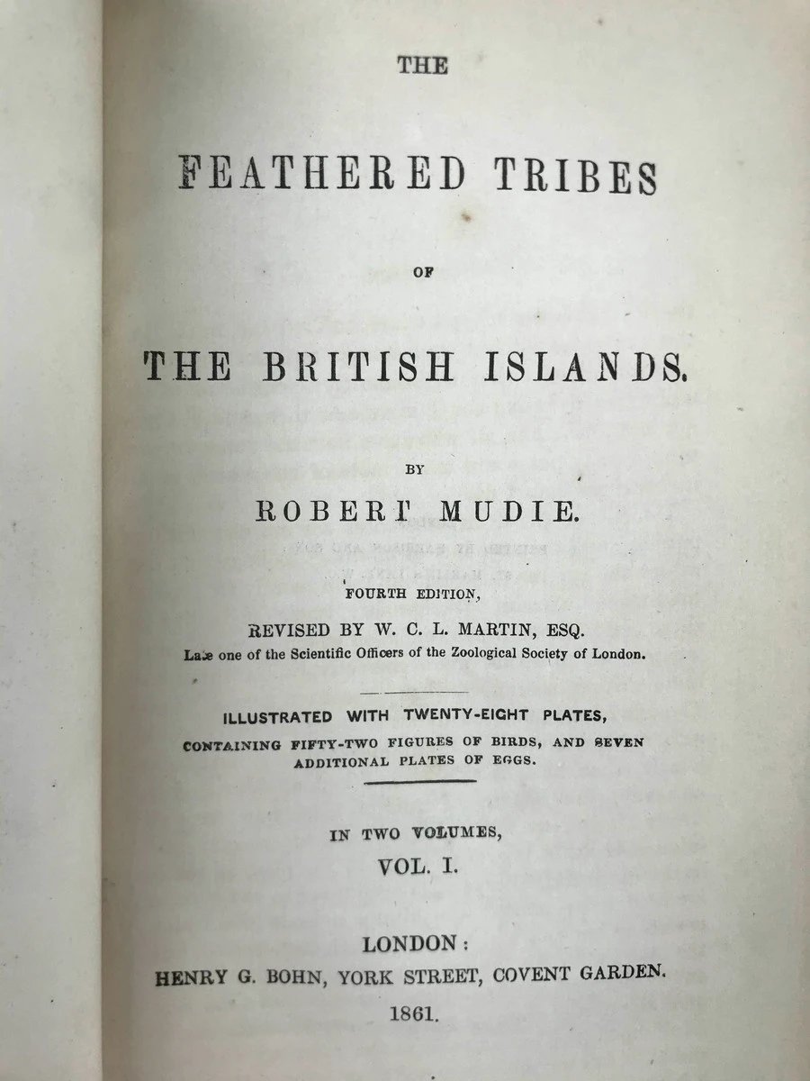 是书正式书名为《英国群岛的羽毛族群》(The Feathered Tribes of the British Islands)是由罗伯特·穆迪(Robert Mudie)撰写,于1861年由伦敦的Henry G. Bohn出版。此书分为两卷,包含共计28幅插图,展示了52种鸟类的图像以及7幅鸟蛋的插图。书中详细介绍了英国群岛的鸟类种类、栖息环境、习性、繁殖及其与人类的关系,是鸟类学领域的重要参考书籍。罗伯特·穆迪(1777-1842)是一位报纸编辑,同时也是一位热衷于鸟类学研究的作者。除了《英国群岛的羽毛族群》外,他还出版了《鸟类的自然史》等著作,对鸟类的分类、习性及其生态进行了细致研究。穆迪的作品融入了生动的描写和科学观察,特别是他对于鸟类形态、栖息地和行为的描述,丰富了当时人们对英国本土鸟类的认知。本书中的插图展现了当时最新的鸟类描绘技术,这些细致的插图不仅帮助读者更好地理解鸟类的特征,还为鸟类爱好者和学者提供了珍贵的视觉资料。书中详细介绍了各类鸟类的生活习性,如如何觅食、飞行以及繁殖,同时也涉及了它们与植物、气候变化等环境因素的相互关系。穆迪不仅专注于鸟类的自然历史,还探讨了鸟类在英国文化和生活中的象征意义,展现了人类与自然界的和谐共生。
