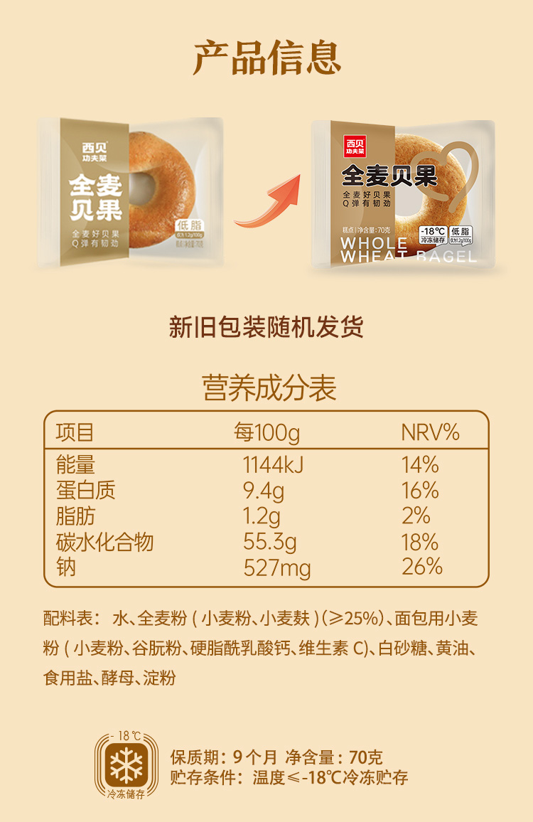 西贝低脂全麦贝果70g/个 全麦面包早餐饱腹粗粮健身代餐休闲零食【社群】