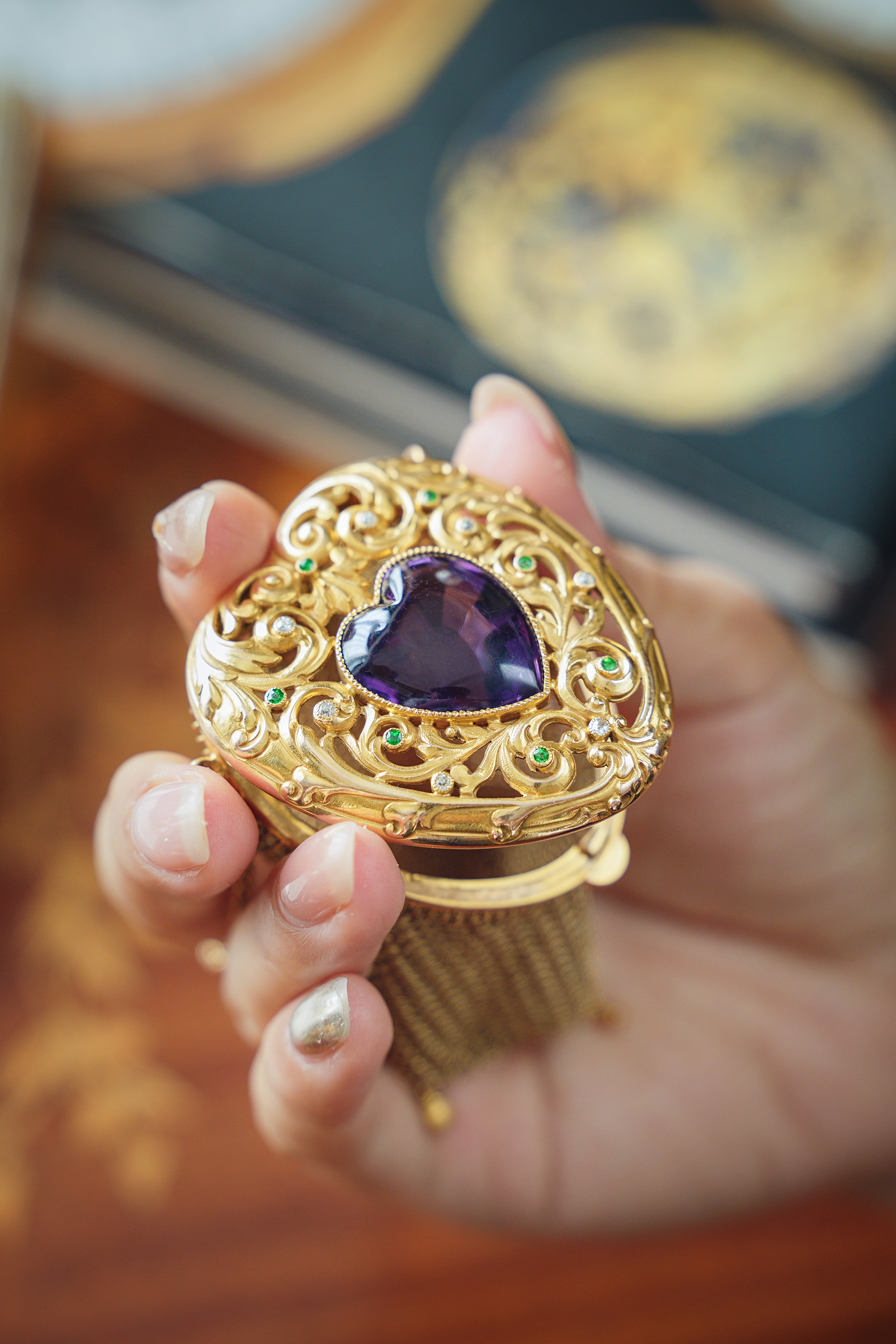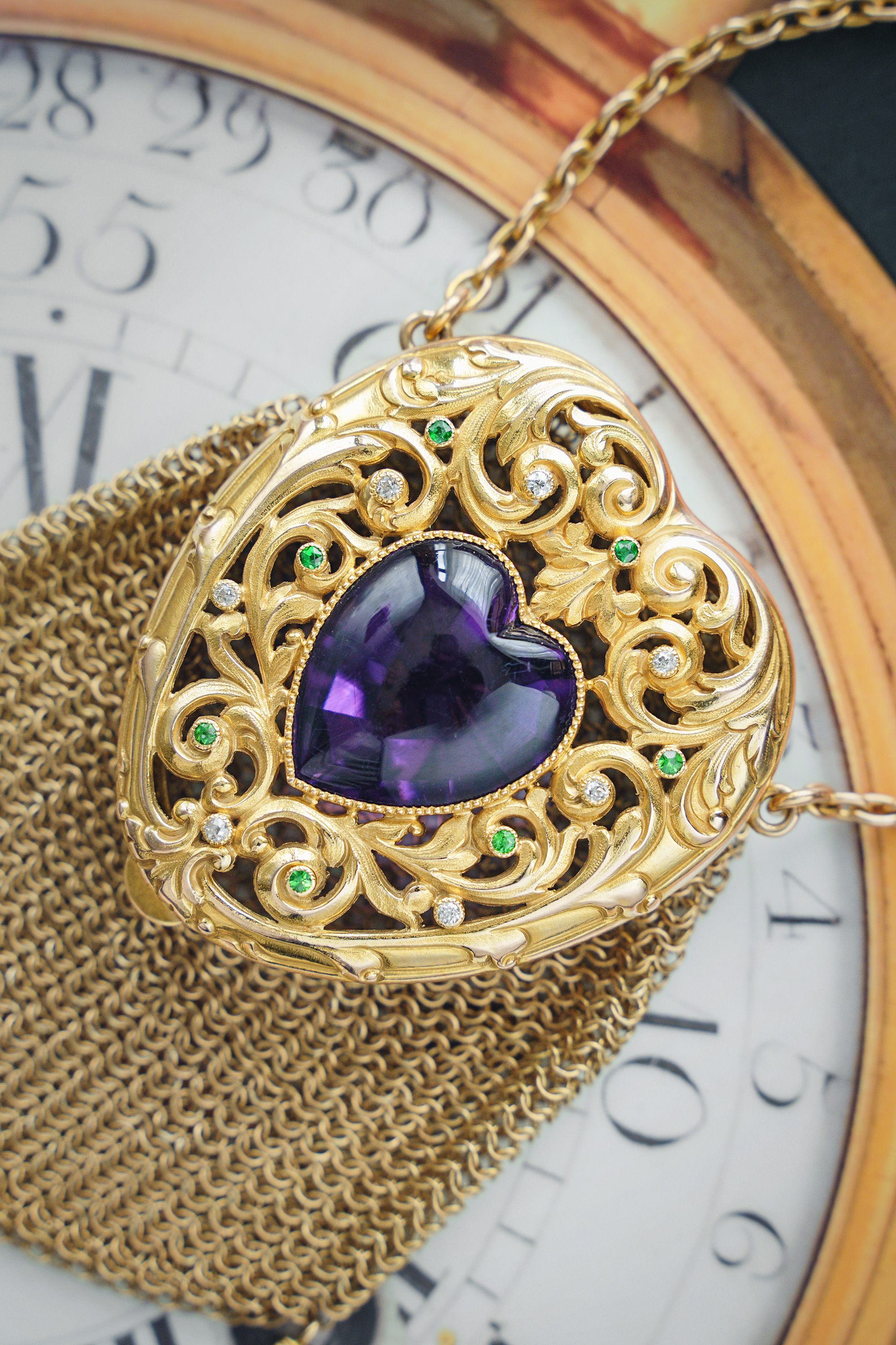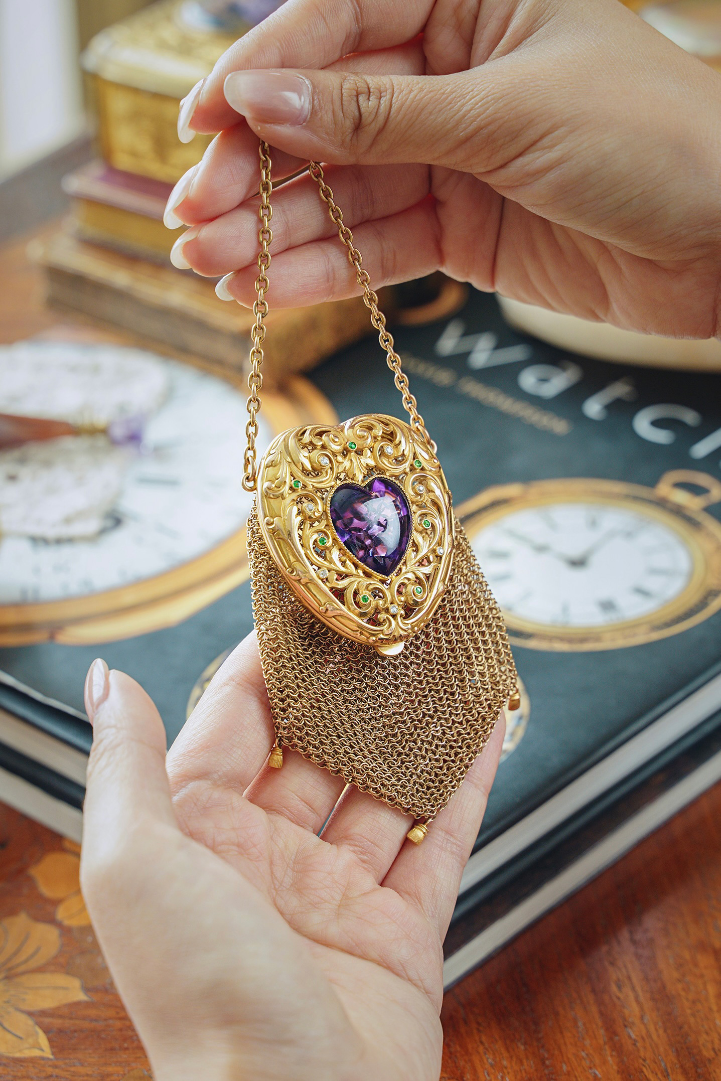 【已售】独角鹿西洋古董20世纪欧洲出品藤蔓爱心造型14K黄金镂雕镶嵌紫水晶钻石及沙弗莱石网状编织零钱包