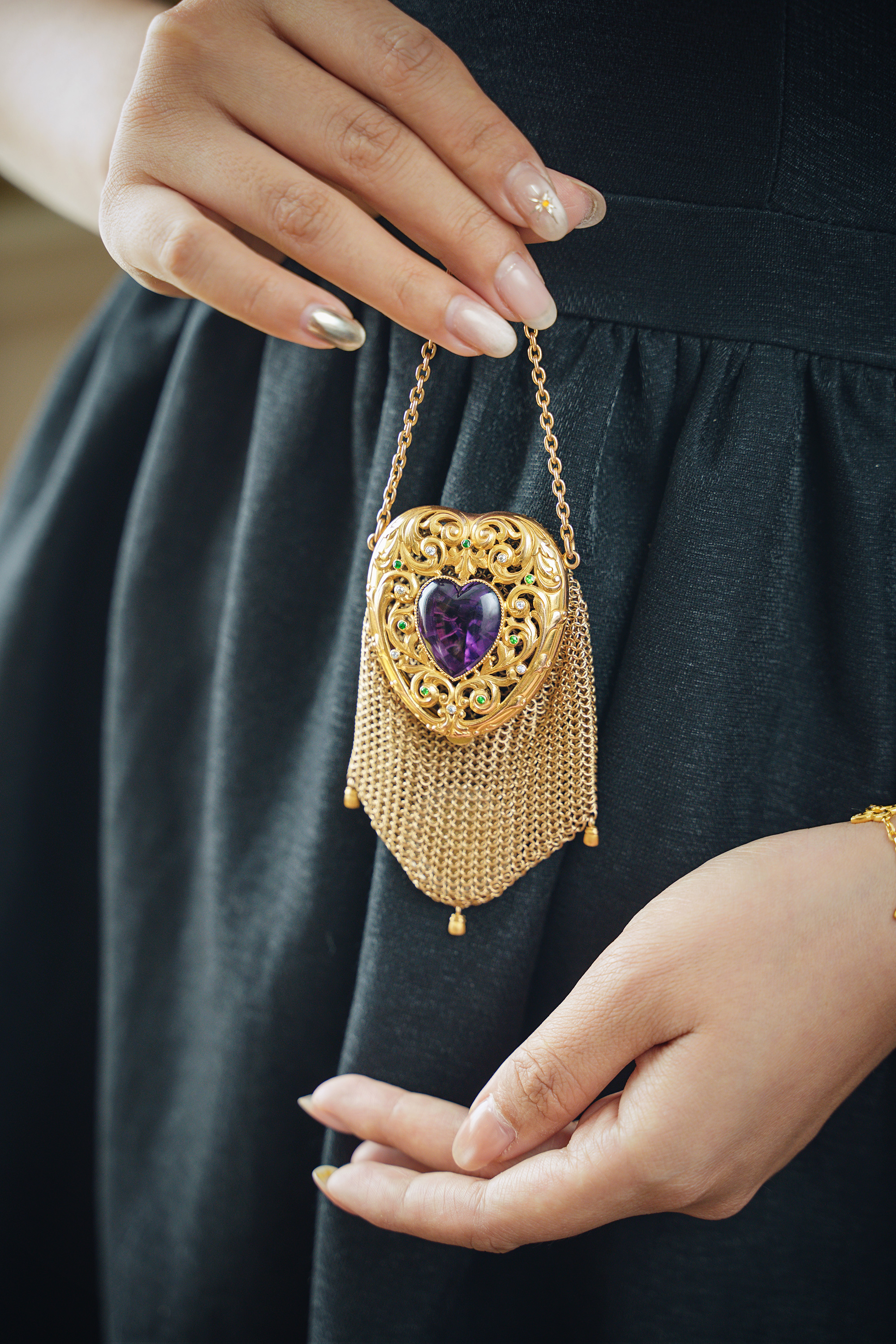 20世纪欧洲出品藤蔓爱心造型14K黄金镂雕镶嵌紫水晶钻石及沙弗莱石网状编织零钱包