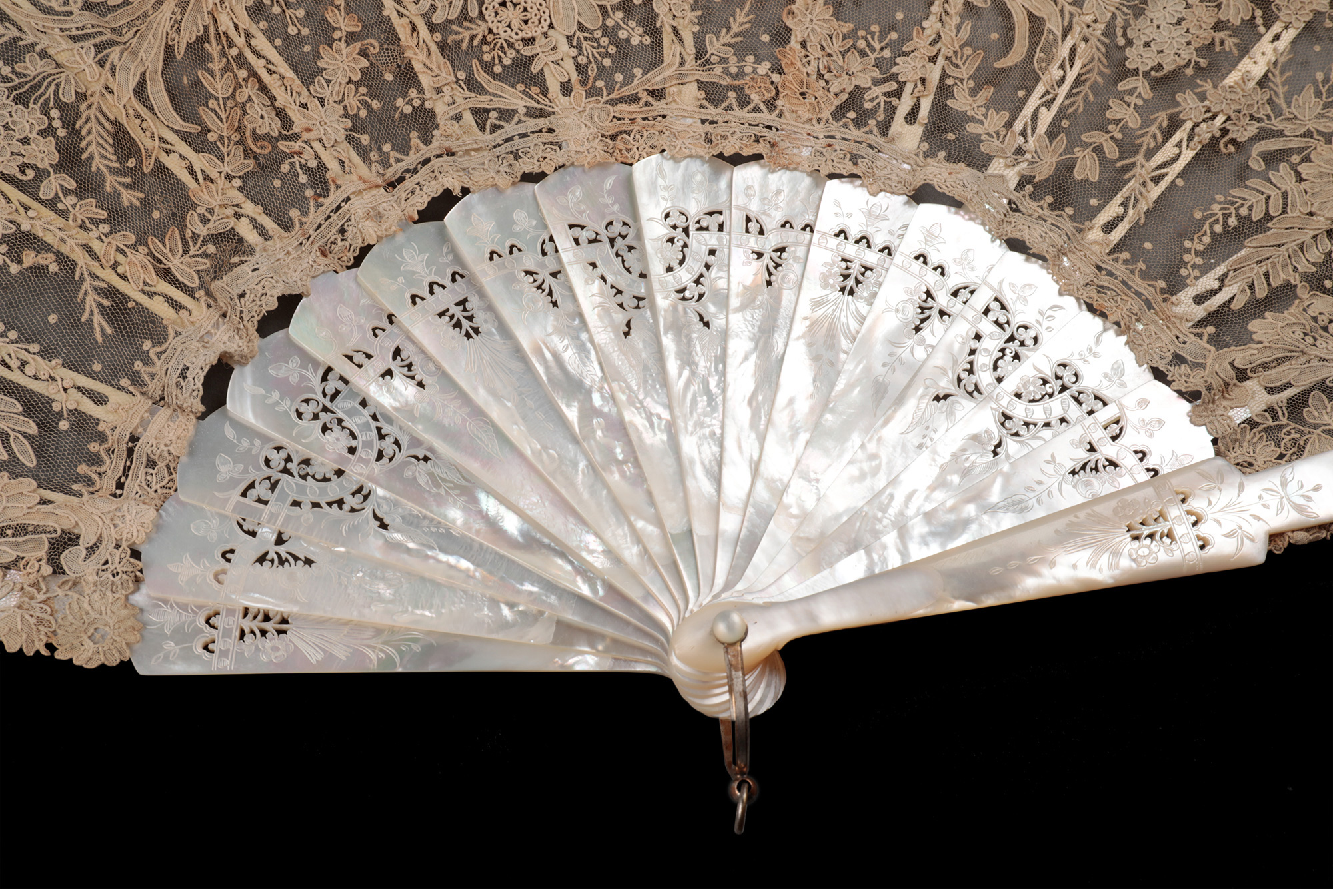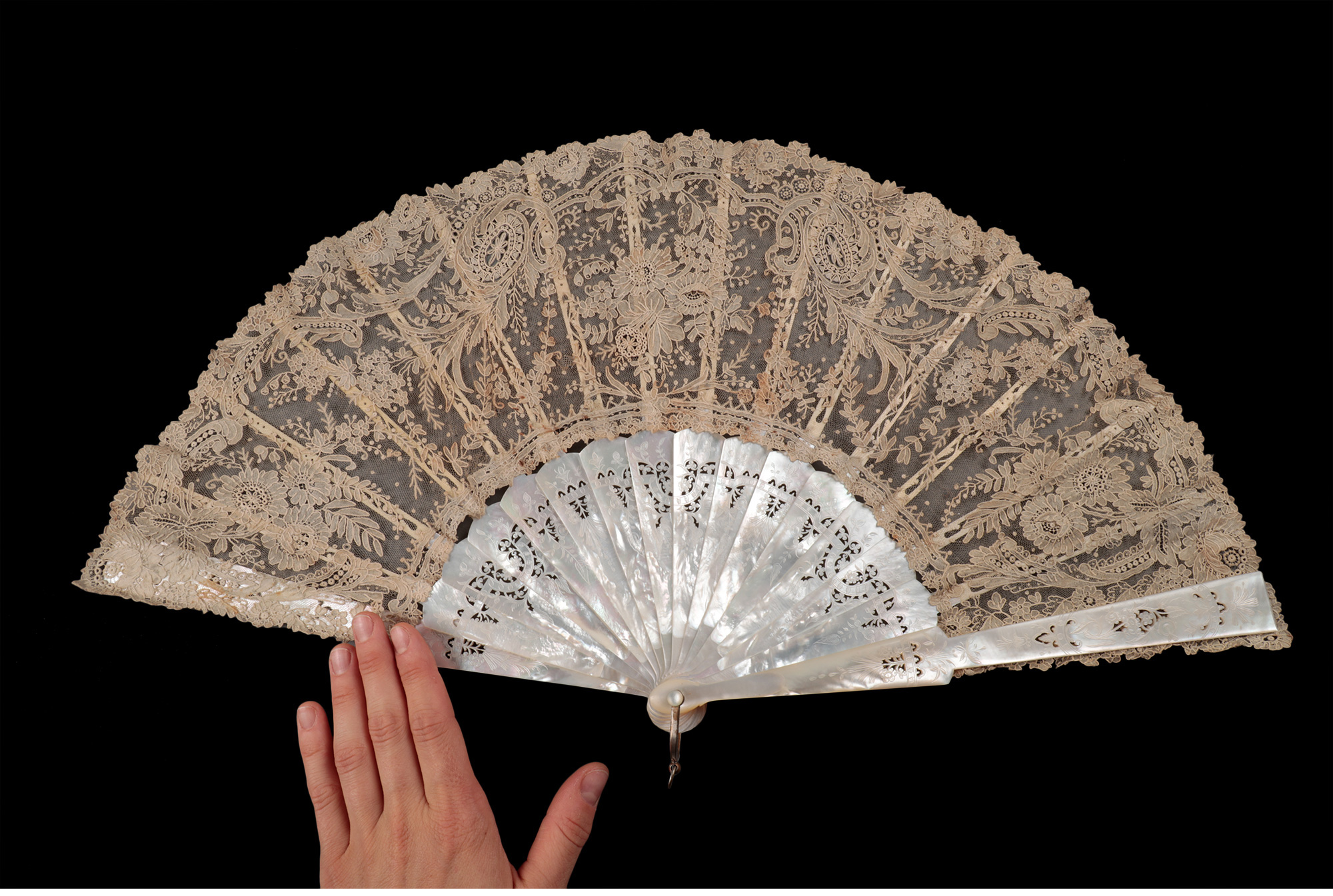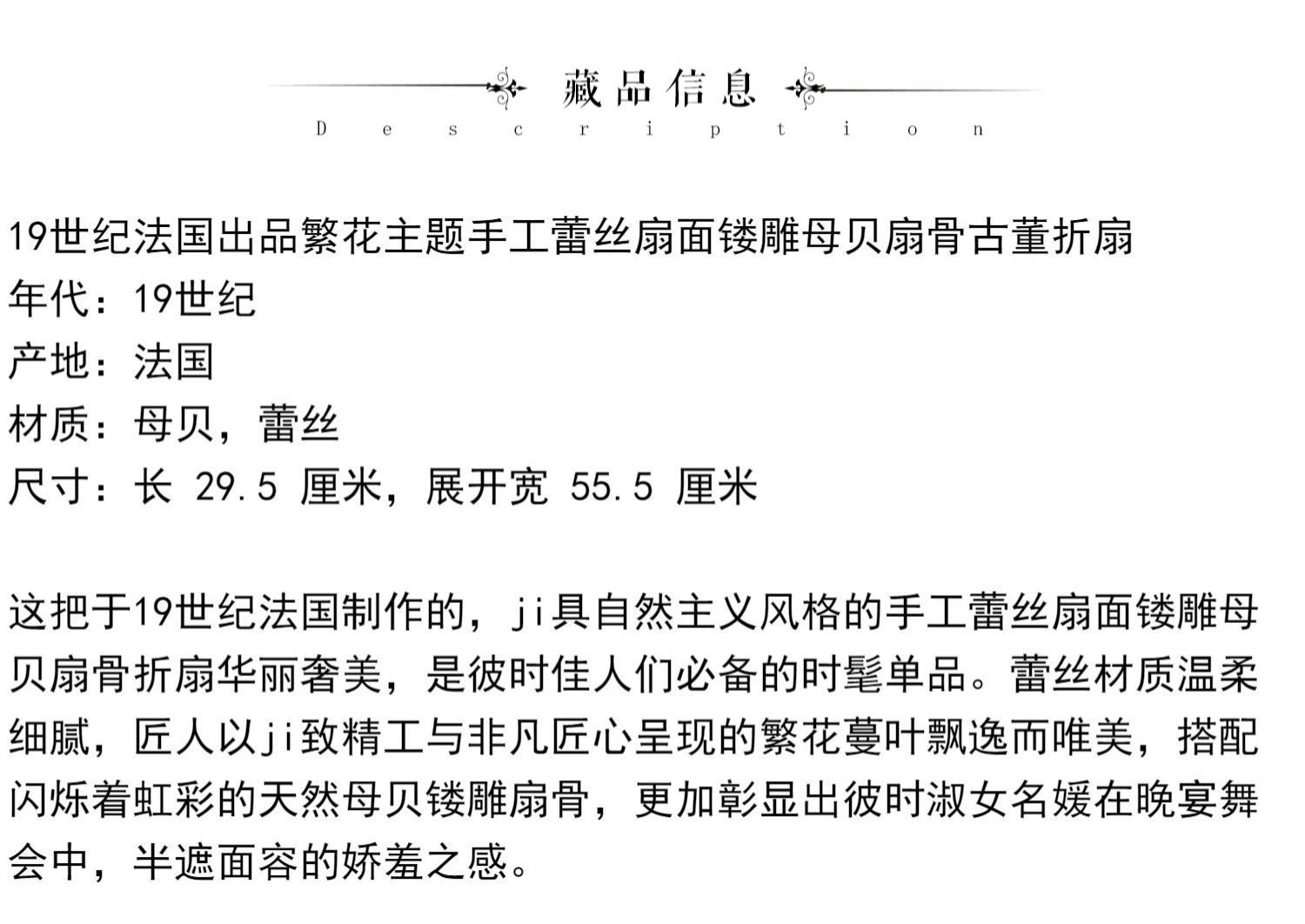 独角鹿西洋古董法国繁花主题手工蕾丝扇面镂雕母贝扇骨古董折扇