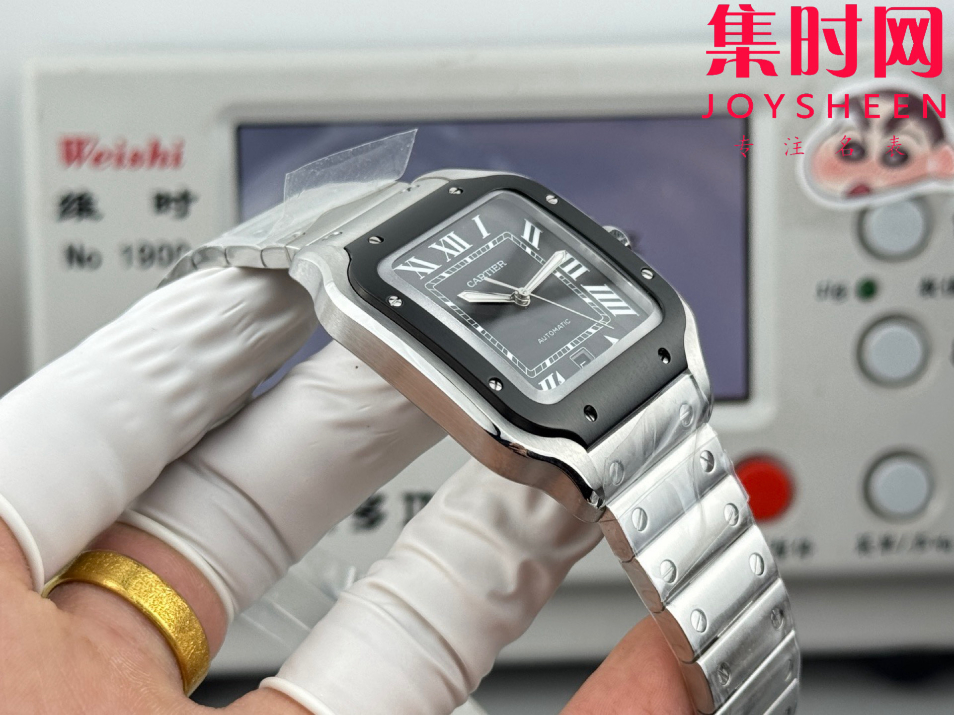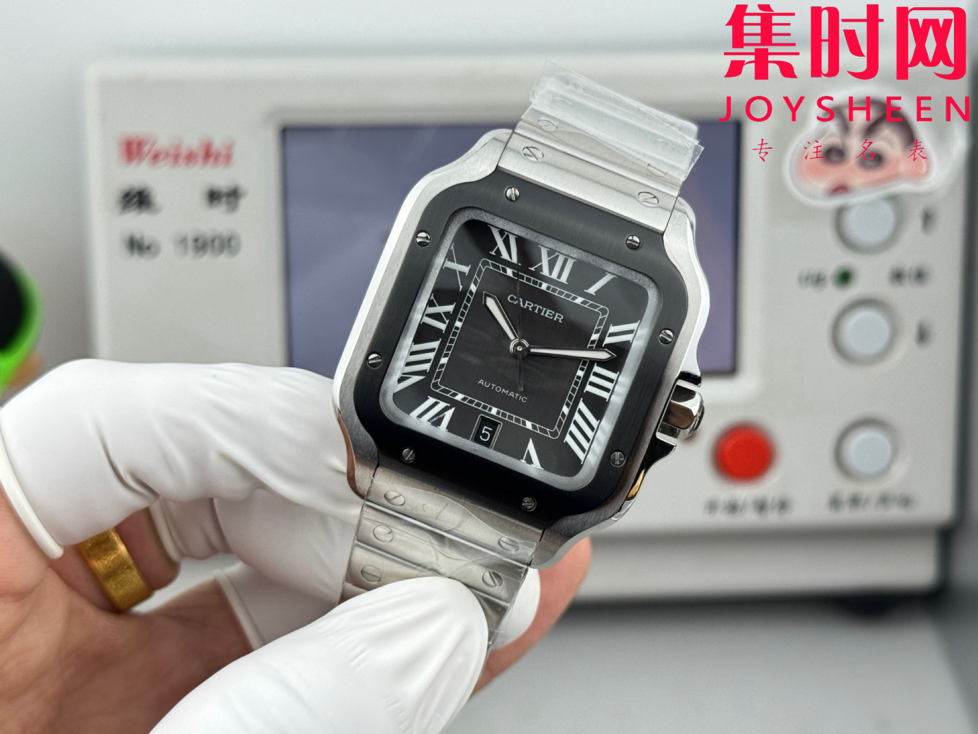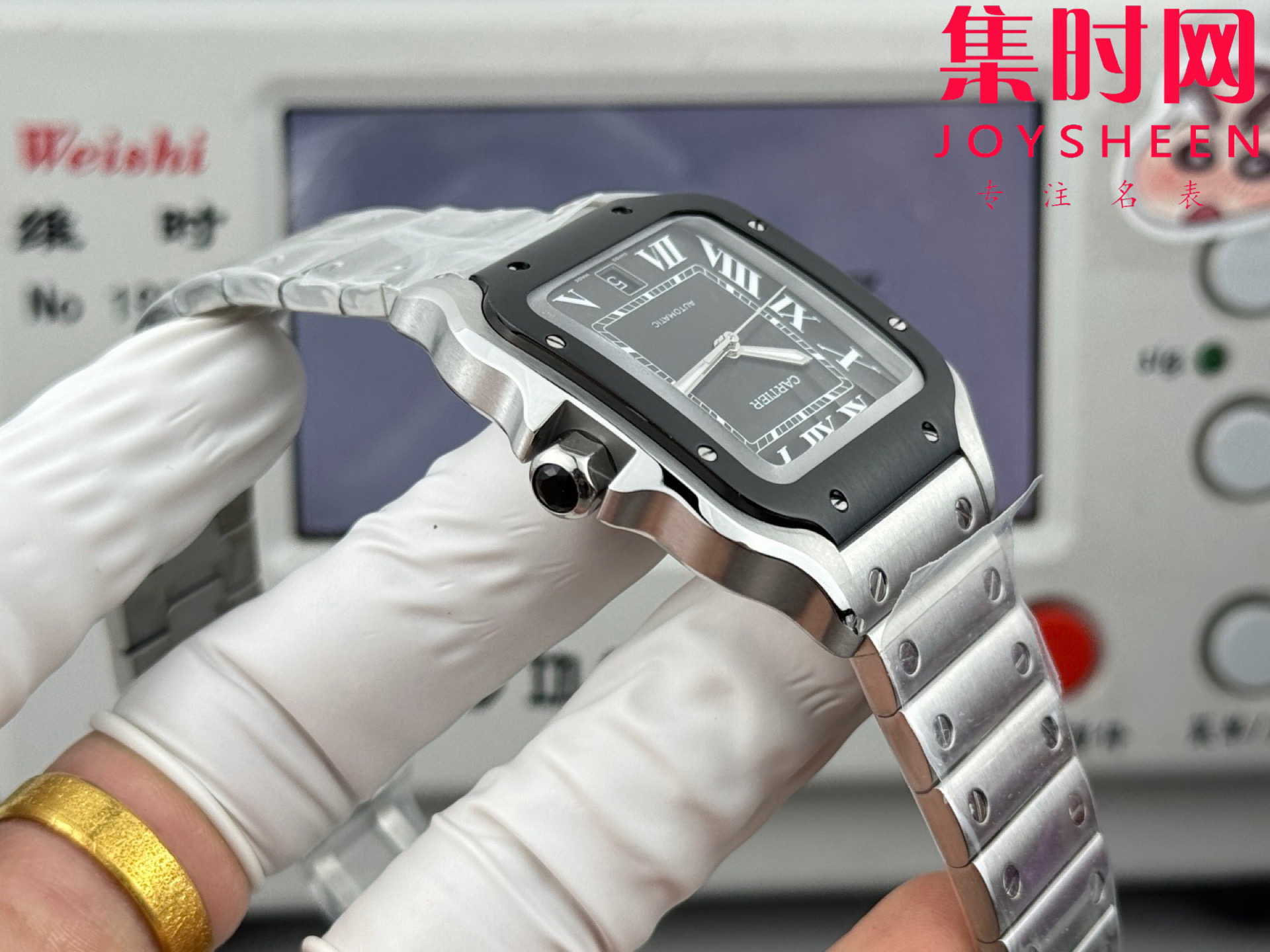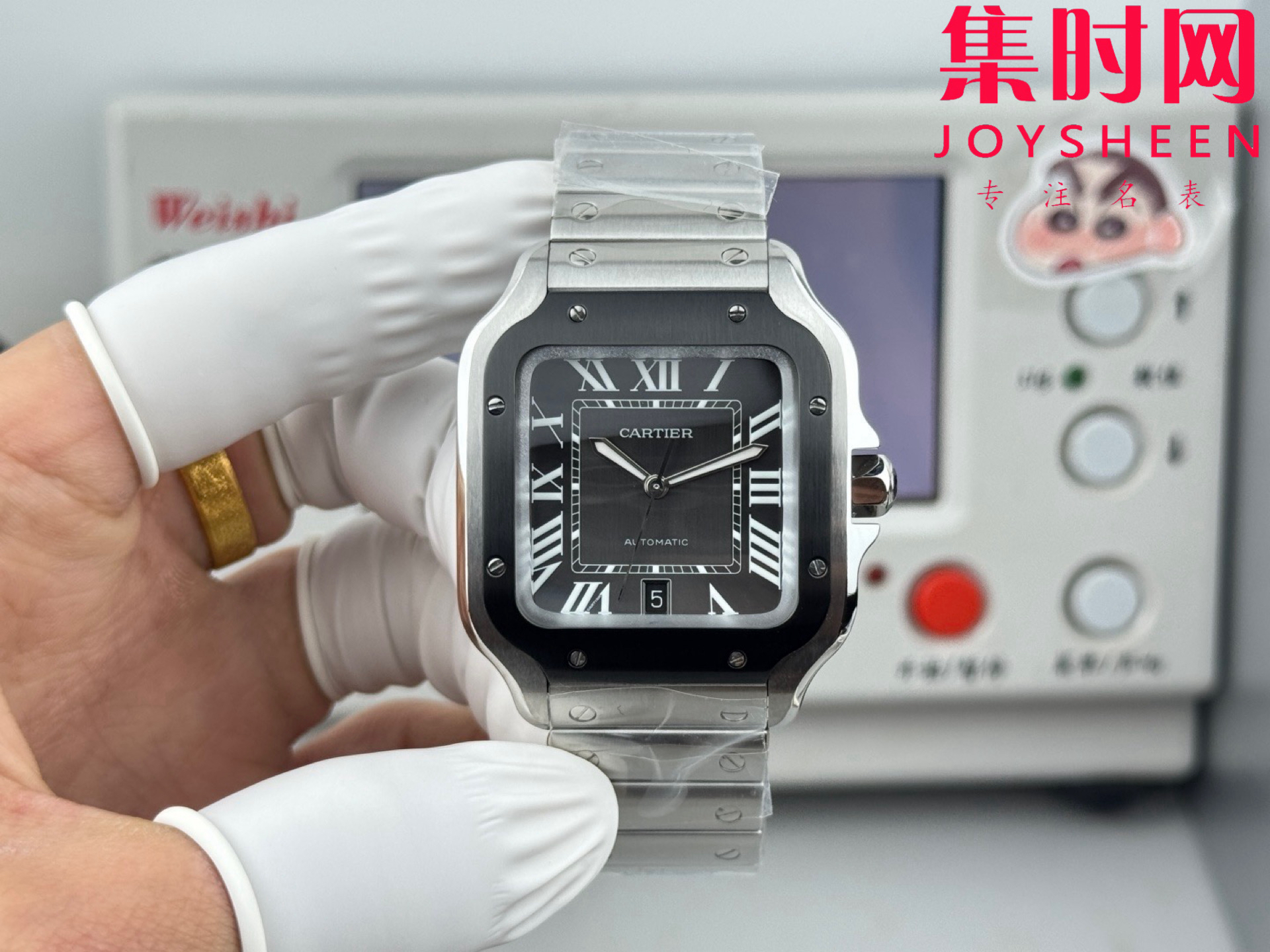 GF卡地亚山度士系列 山度士大号 钢带款 间黑方形男士腕表 绝对是绕不开的经典 表径39.8mm,舒适感很不错。从细节上看,表冠镶有蓝色合成多切面尖晶石,增添了许多精致感。6点钟还设置了日期显示窗口。采用进口9015改Cal.1847 MC自动上链机械机芯,在稳定性和日常佩戴的可靠性上没有问题。防水达到100米。总的来说,这款山度士更适合那些既看重品牌调性,又希望腕表能兼顾实用性的用户。