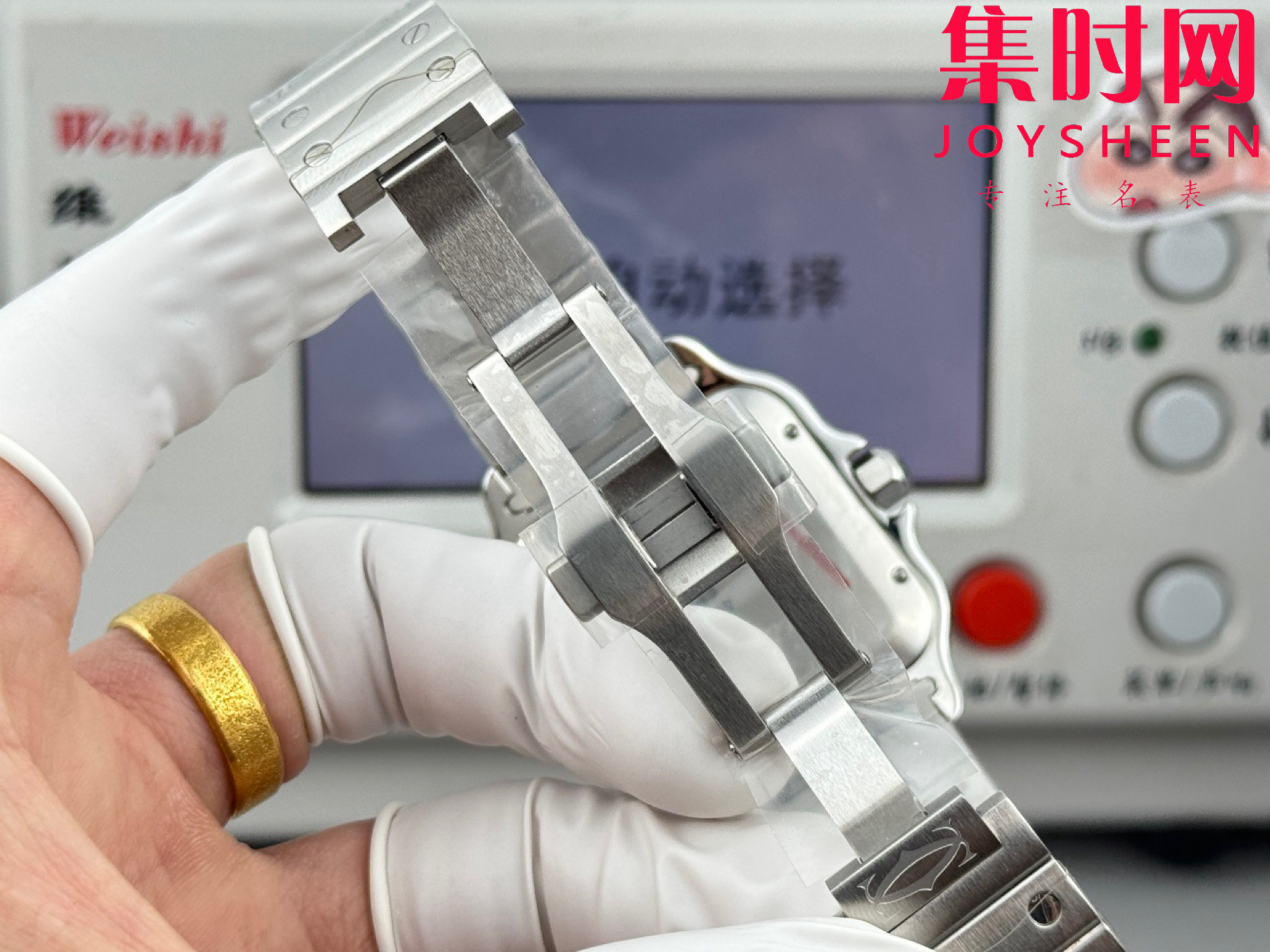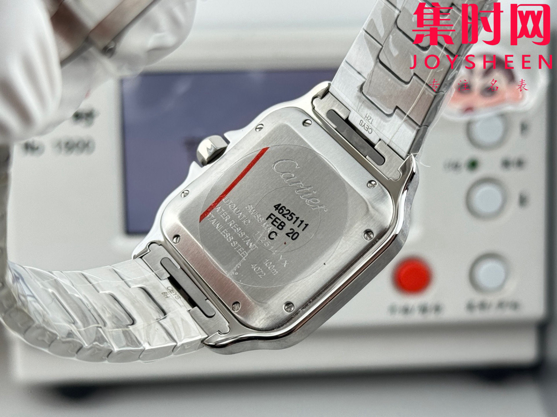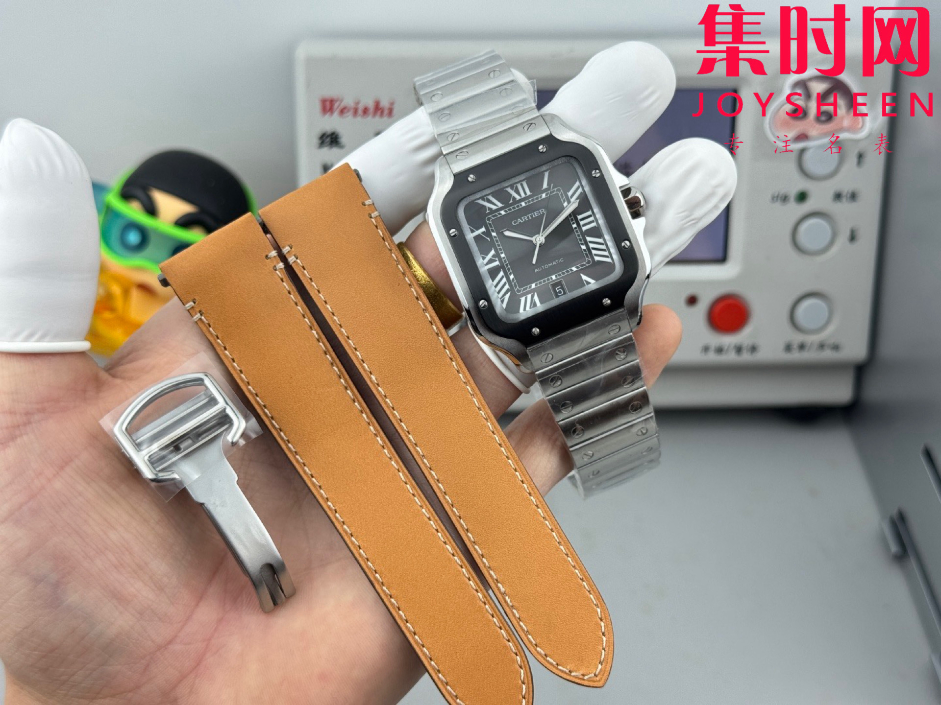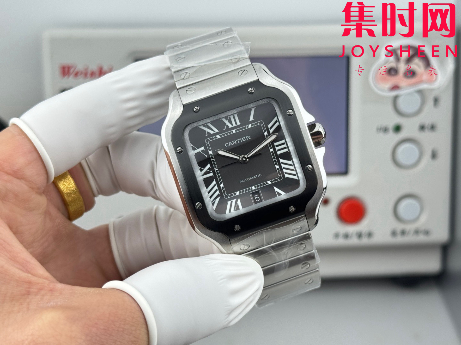 GF卡地亚山度士系列 山度士大号 钢带款 间黑方形男士腕表 绝对是绕不开的经典 表径39.8mm,舒适感很不错。从细节上看,表冠镶有蓝色合成多切面尖晶石,增添了许多精致感。6点钟还设置了日期显示窗口。采用进口9015改Cal.1847 MC自动上链机械机芯,在稳定性和日常佩戴的可靠性上没有问题。防水达到100米。总的来说,这款山度士更适合那些既看重品牌调性,又希望腕表能兼顾实用性的用户。