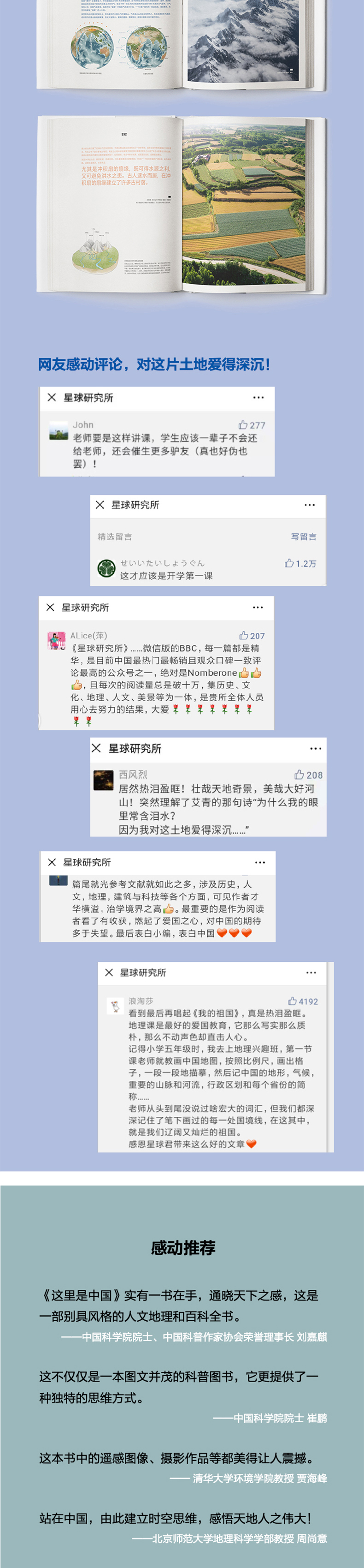 《这里是中国》作为地学科普的一次有益尝试,为读者构建了自然科学与人文艺术交融的阅读体验,是媒体融合发展的成功探索,也是建设生态文明和美丽中国的生动宣传物。——中国地质博物馆馆长 姚义川