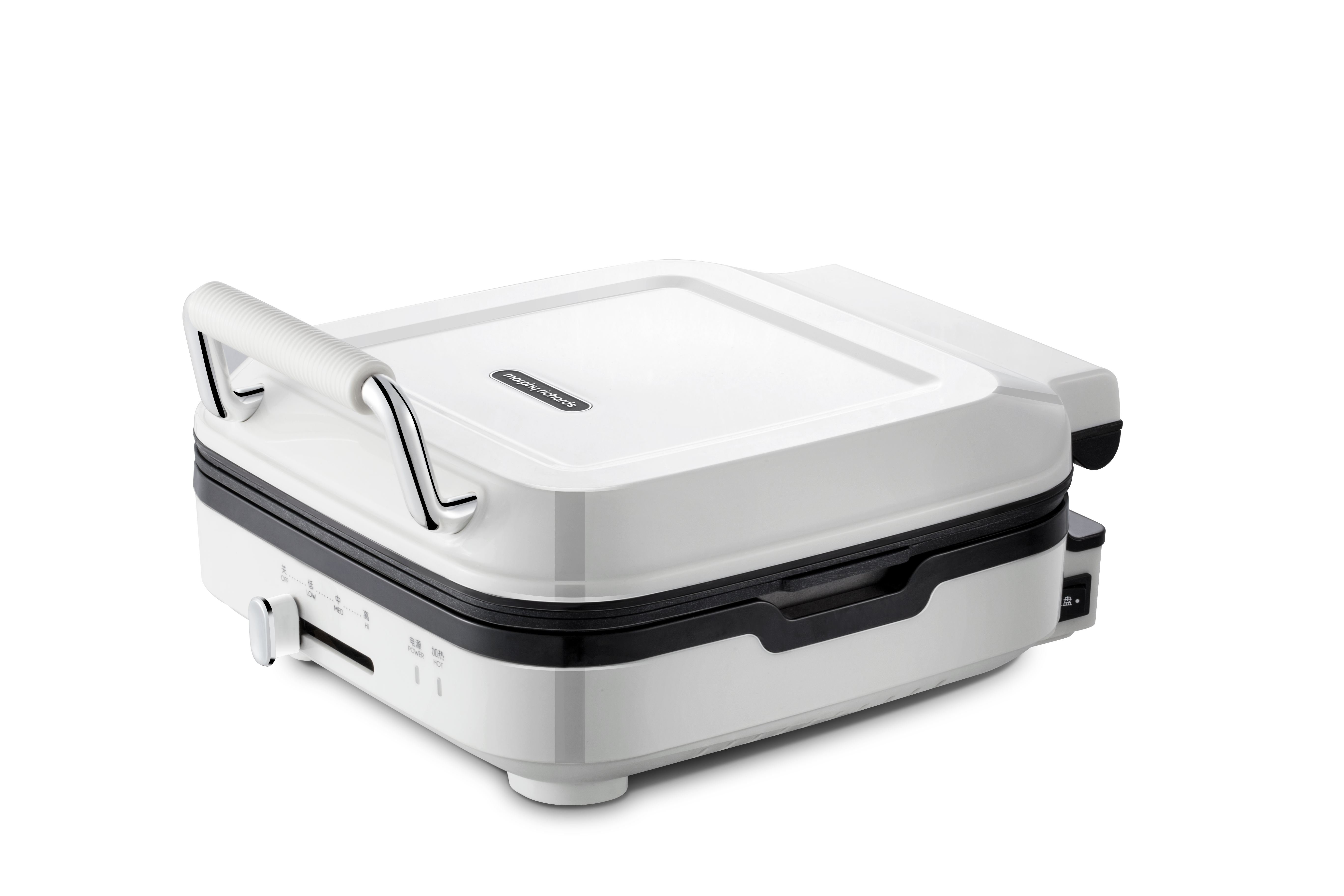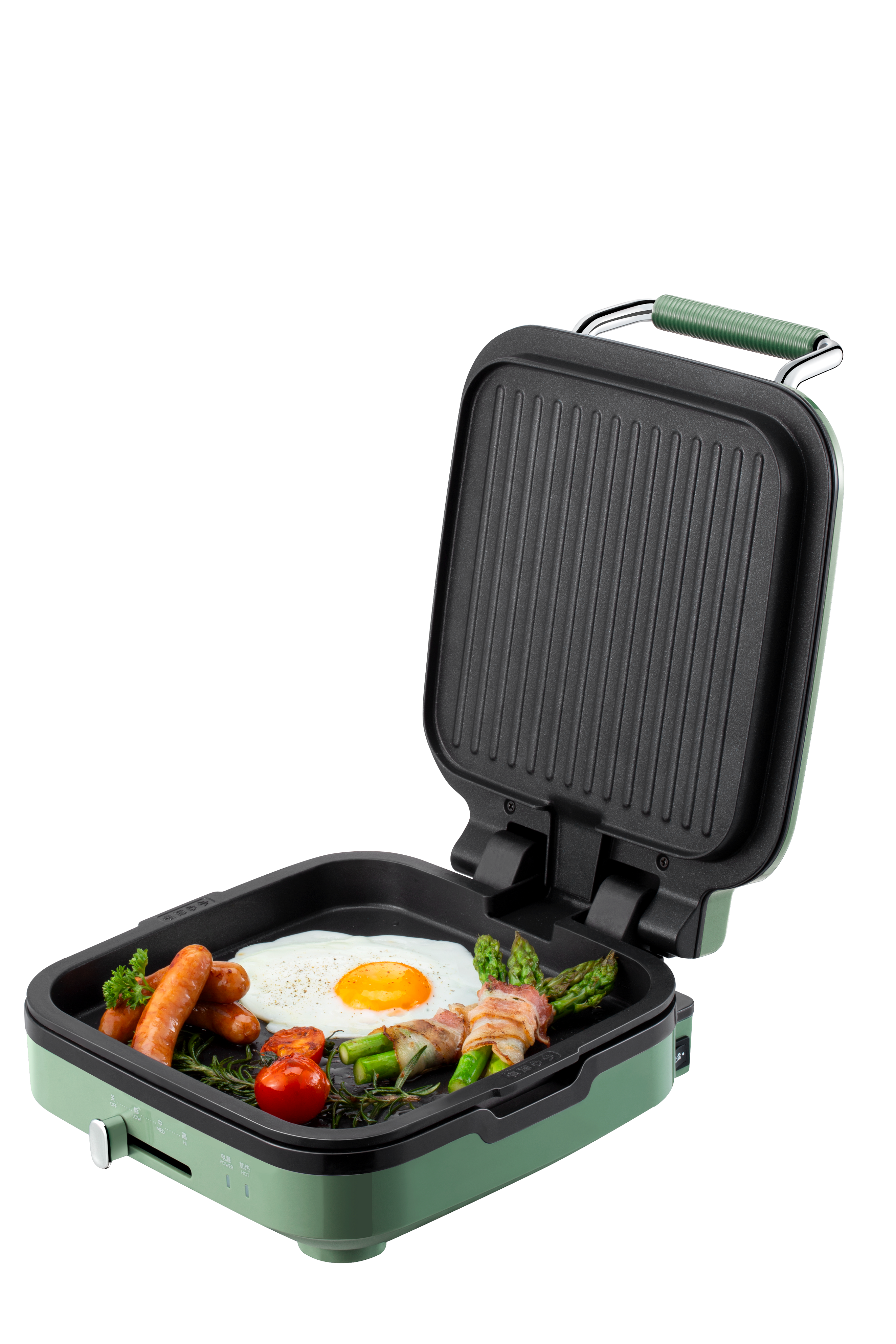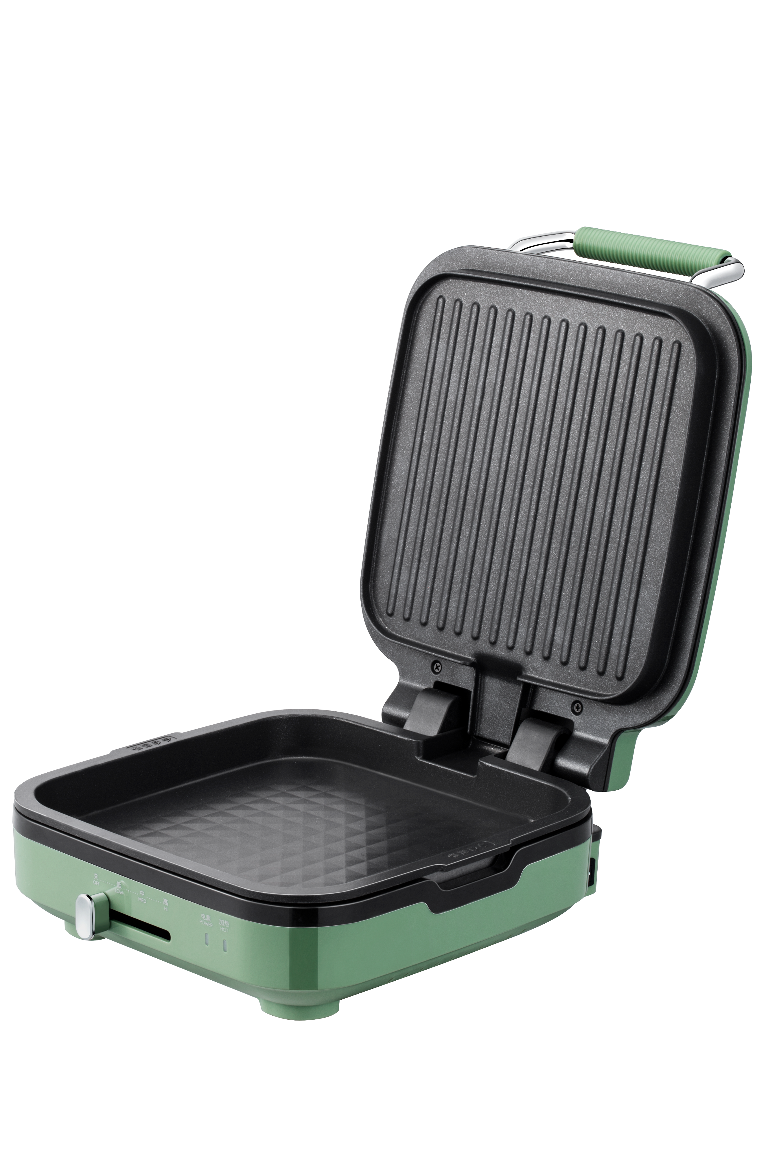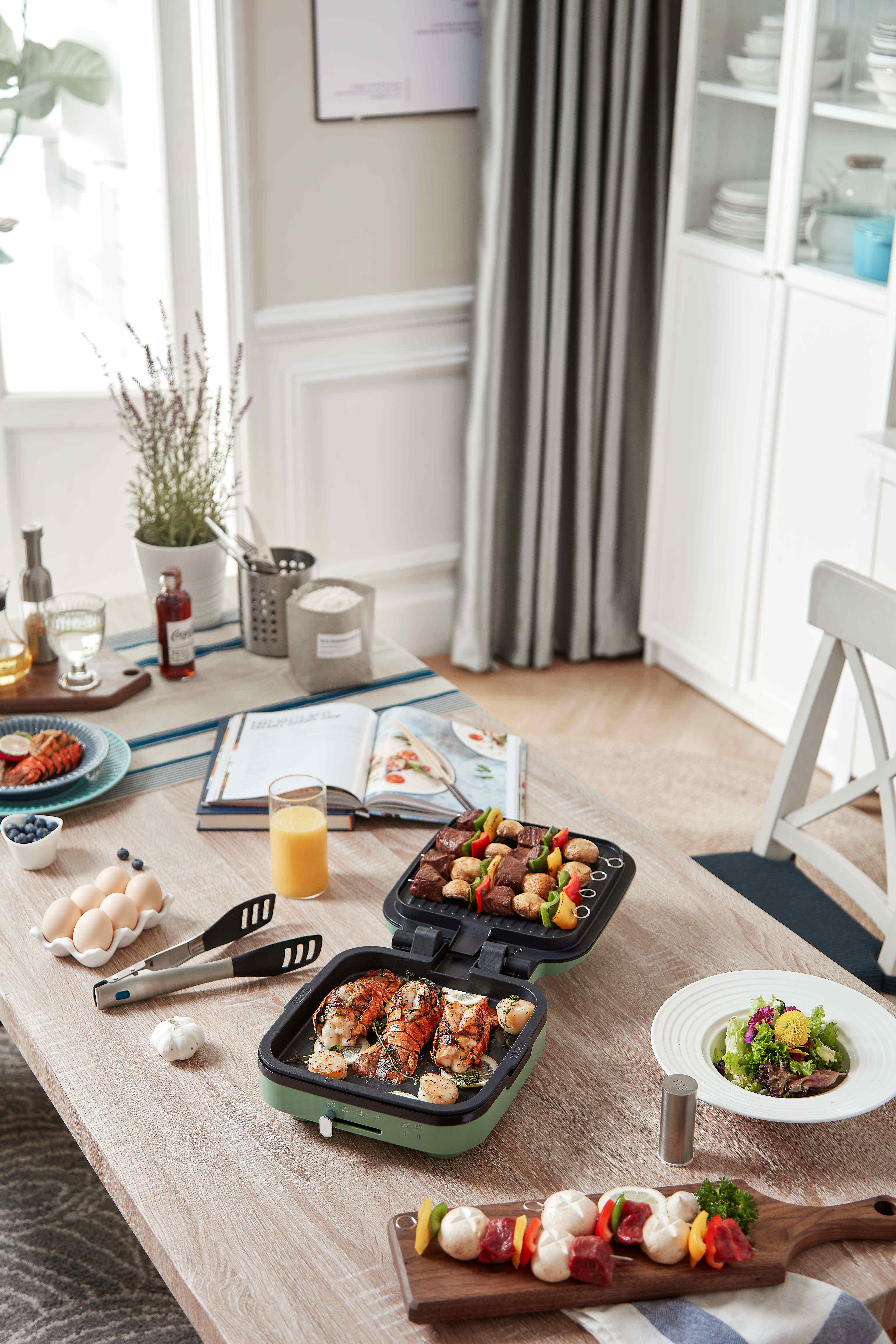 右边为轻食区,单双面都能加热,适合制作三明治、华夫饼、煎炒食物和松饼。左边为佐餐区,可以温牛奶、煎炒蛋、融巧克力、蒸薯泥等。两侧单独控制烤盘和煎/煮锅,支持同时操作,满足多样化烹饪需求。