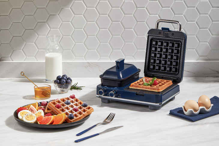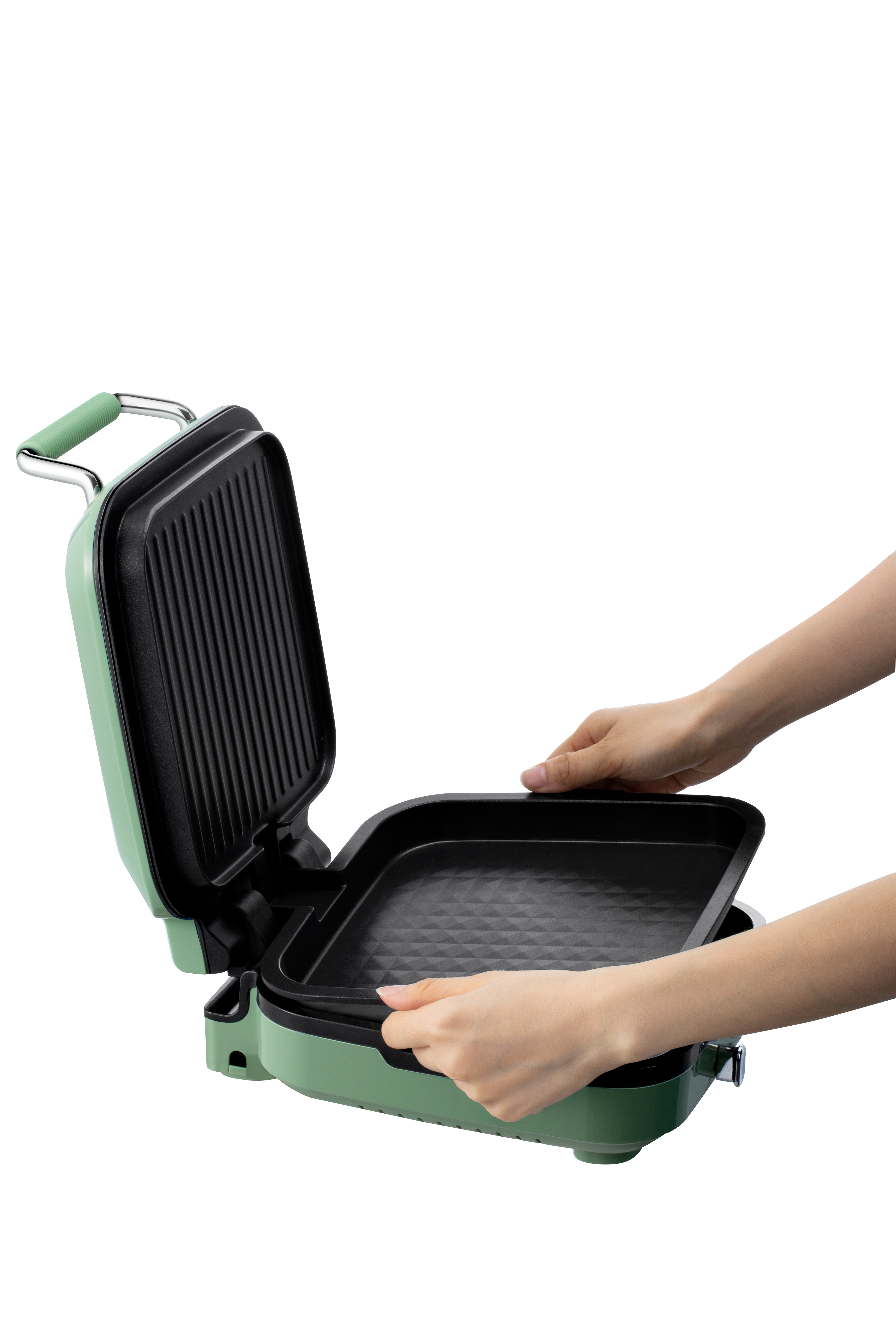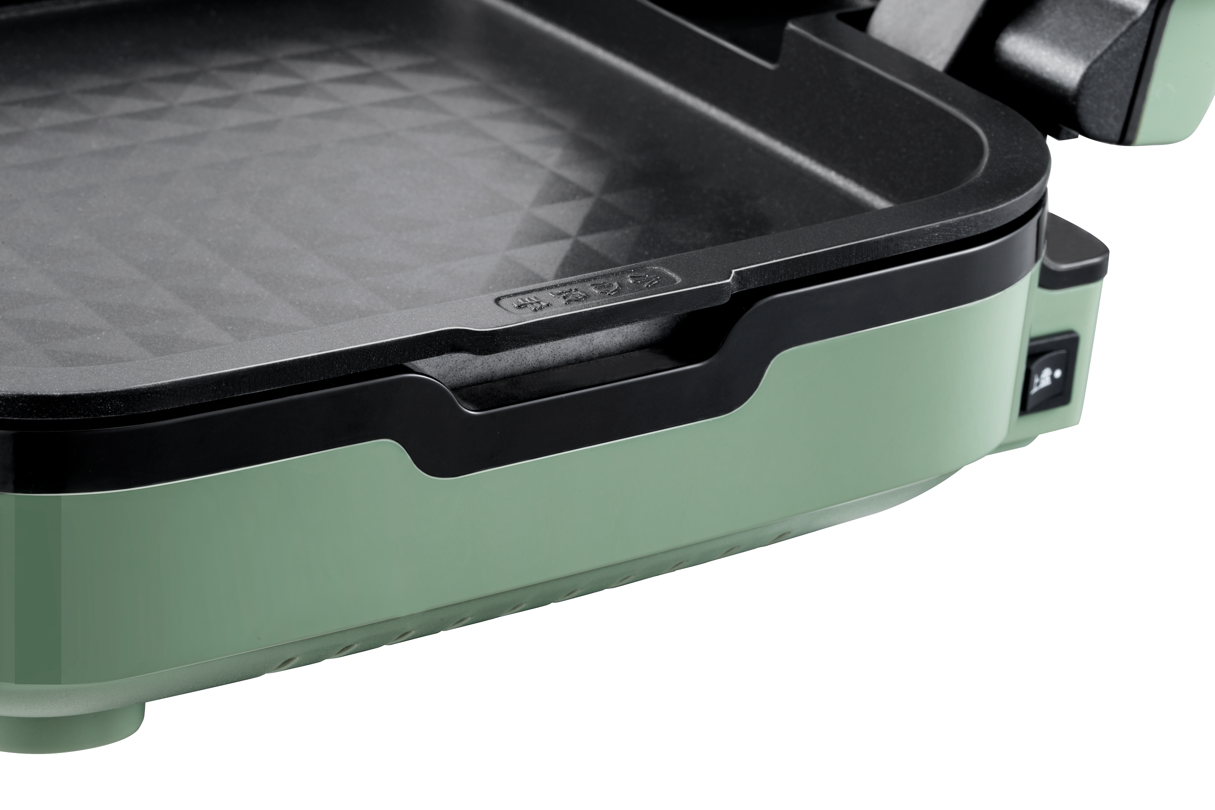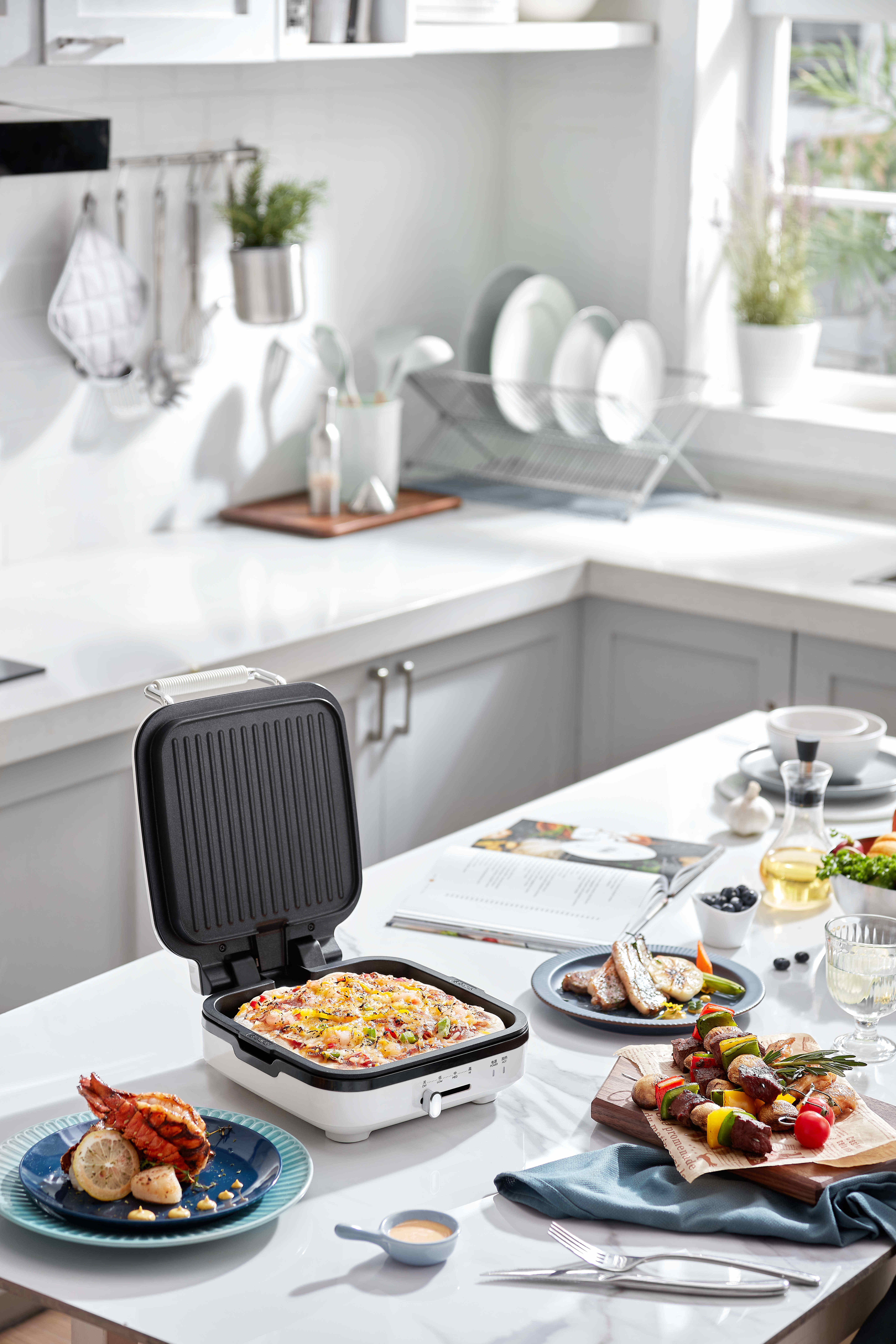 右边为轻食区,单双面都能加热,适合制作三明治、华夫饼、煎炒食物和松饼。左边为佐餐区,可以温牛奶、煎炒蛋、融巧克力、蒸薯泥等。两侧单独控制烤盘和煎/煮锅,支持同时操作,满足多样化烹饪需求。