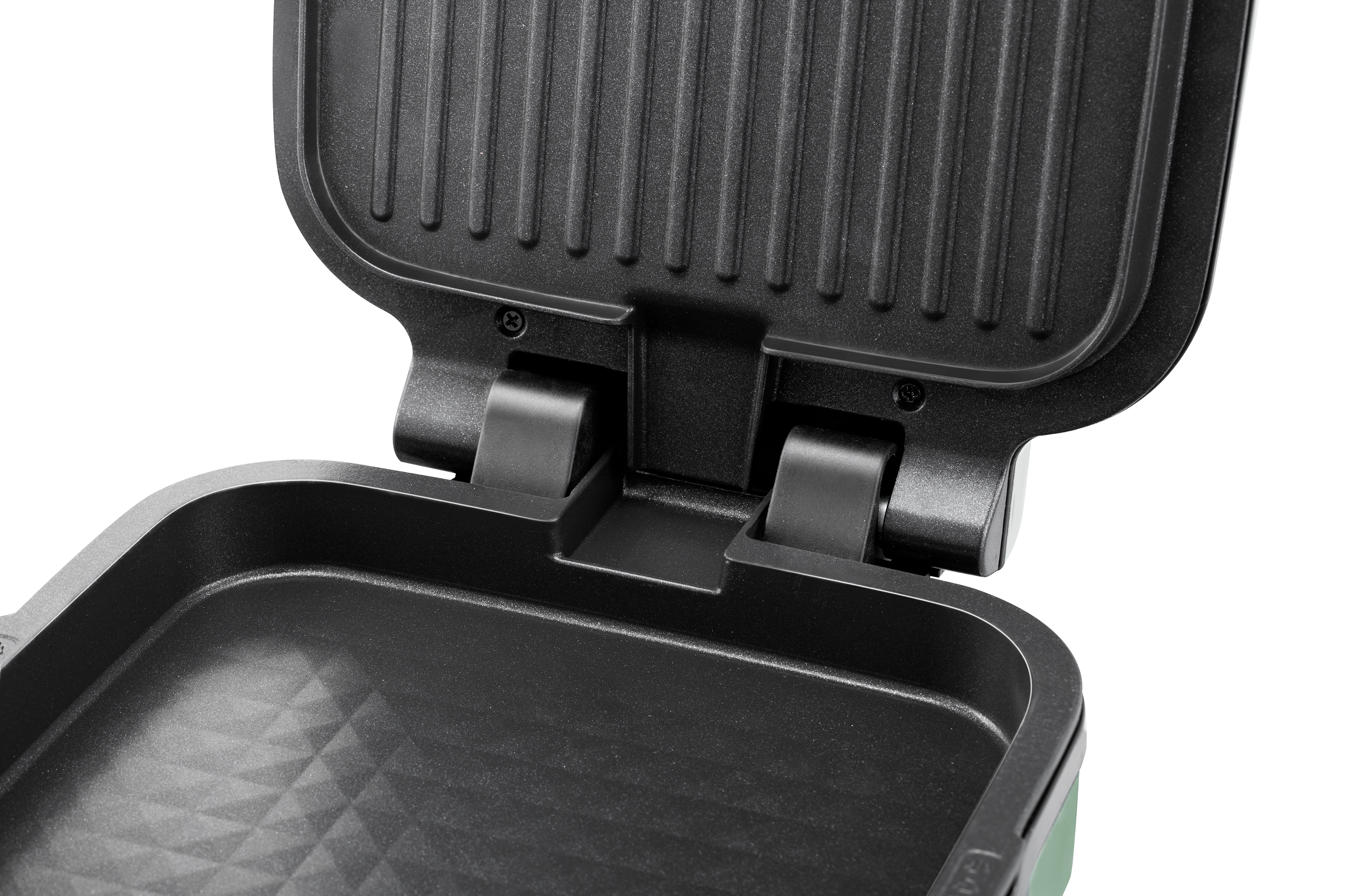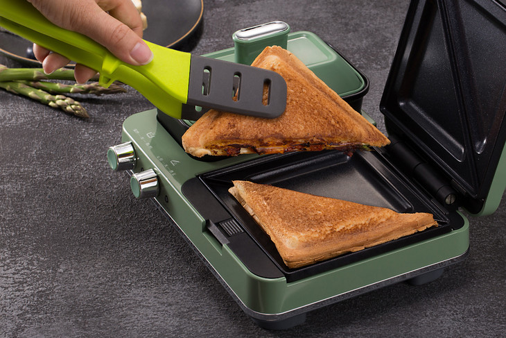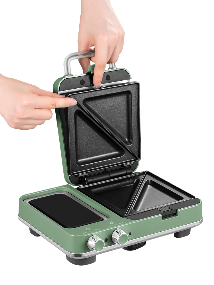 轻食机标配三明治盘和小煎锅,如果你还想探索更多的早餐可能性,也能自行选配华夫饼盘、平煎盘等配件。一扣一装就能轻松换盘。同时,食品级防粘图层,在保证食物安全的同时,还能有效控油烟,方便清洗。