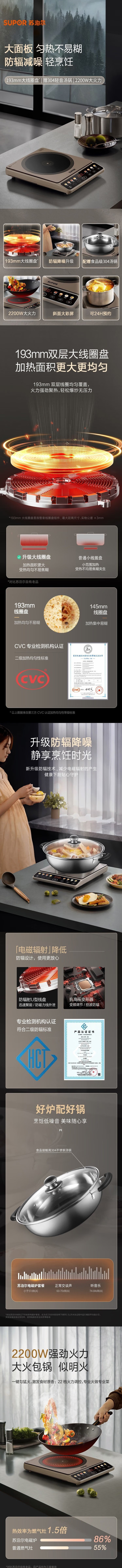 苏泊尔 电磁炉 C22-IA03 2200W 防辐降噪 大线圈 一体面板 触控式操控 三级能效 12档火力以上 多孔散热